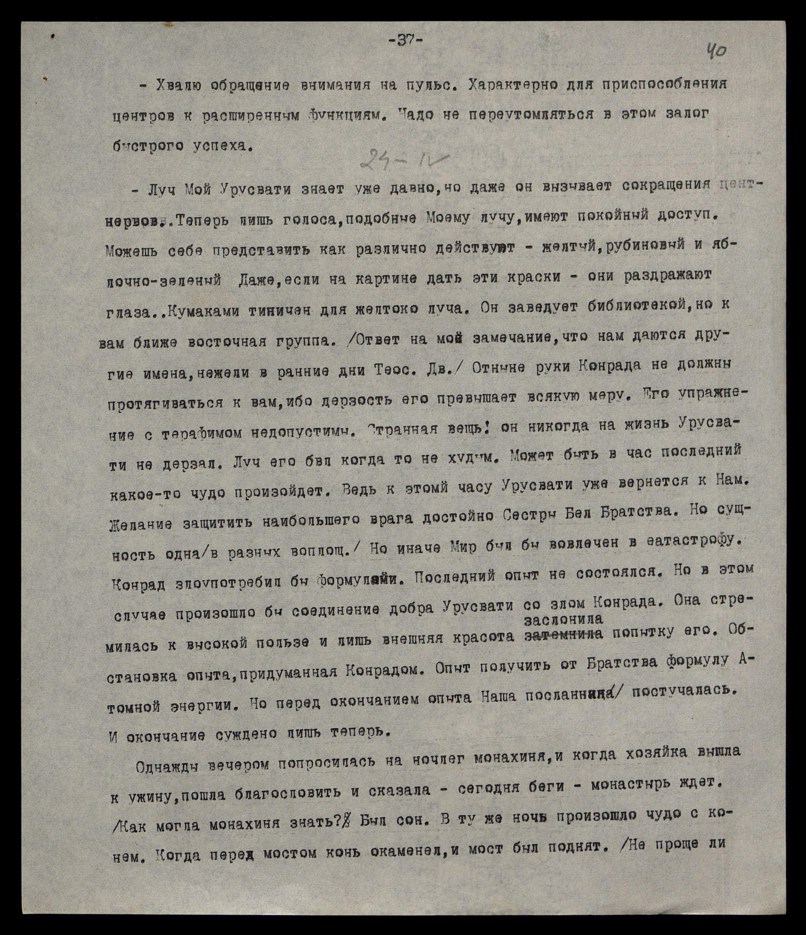 Отныне руки Конрада не должны протягиваться к вам, ибо дерзость его превышает всякую меру. Его упражнения с терафимом недопустимы. Странная вещь! Он никогда на жизнь Урусвати не дерзал. Луч его был когда-то не худым. Может быть, в час последний какое-то чудо произойдёт. Ведь к этому часу Урусвати уже вернётся к Нам. Желание защитить наибольшего врага достойно Сестры Бел[ого] Братства. Но сущность одна (в разных воплощ[ениях]). Но иначе Мир был бы вовлечён в катастрофу. Конрад злоупотребил бы формулами. Последний опыт не состоялся. Но в этом случае произошло бы соединение добра Урусвати со злом Конрада. Она стремилась к высокой пользе, и лишь внешняя красота заслонила попытку его. Обстановка опыта, придуманная Конрадом. Опыт — получить от Братства формулу Атомной энергии. Но перед окончанием опыта наша посланница постучалась. И окончание суждено лишь теперь.