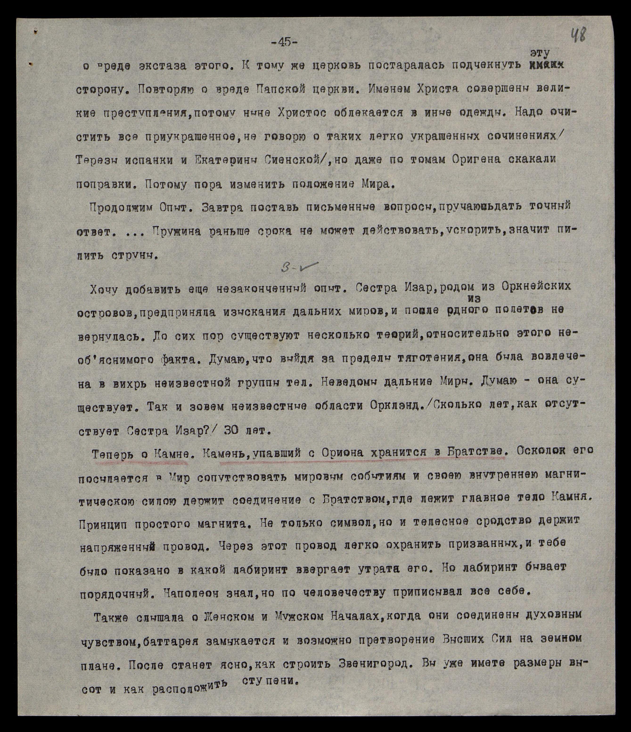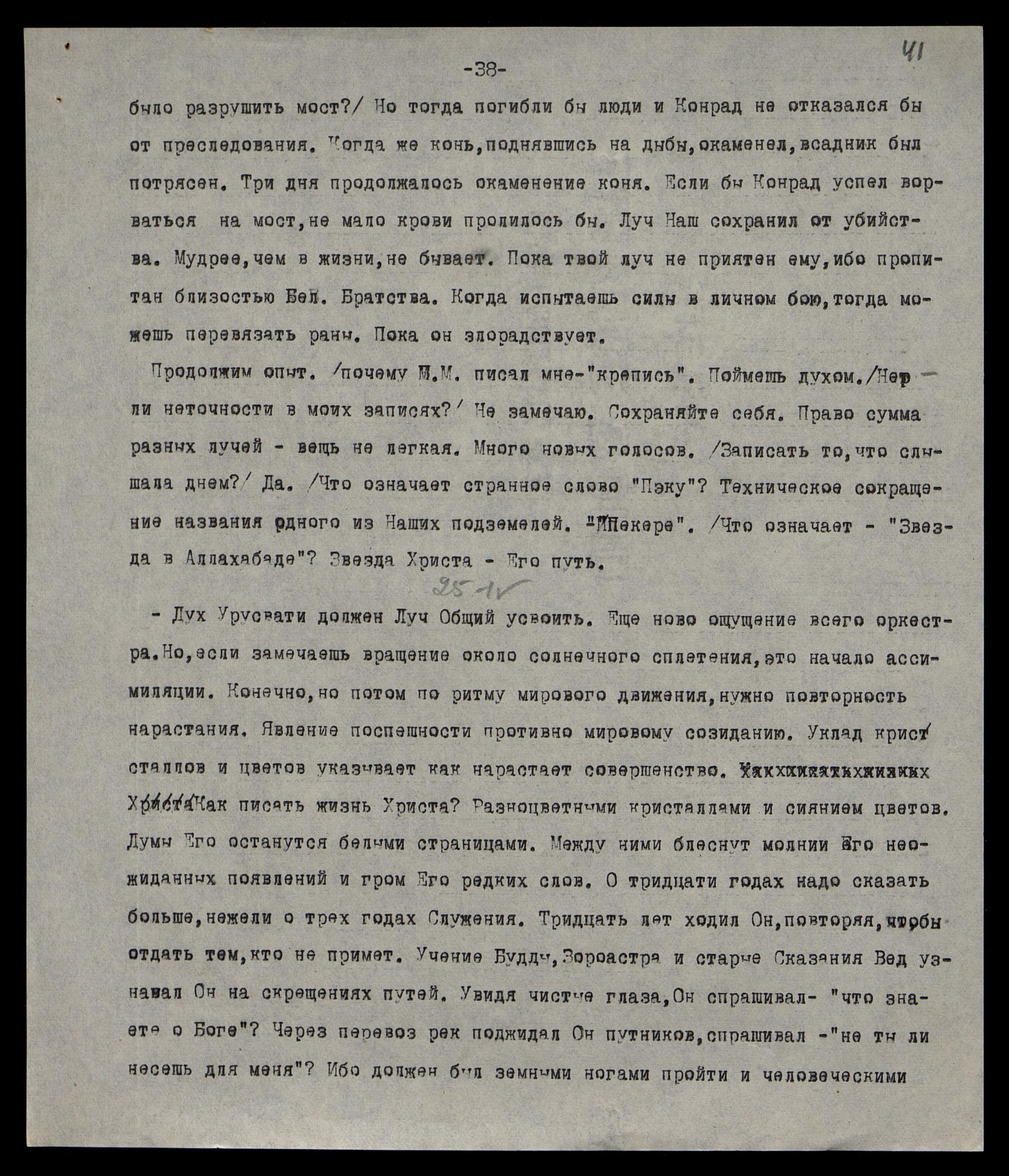 Результат, поистине, замечательный, ибо проникнуть в подземелье очень трудно, хотя бы и в повышенном состоянии. Мы сами ищем лучшие условия жизненного принципа. Высшая Директива — проявить Общение, не нарушая условий жизни. Указ — установить непосредственное сообщение по всем специальностям. Трудность — в новом делении человечества. Прежнее примитивное деление на касты, на классы, на занятия заменяются сложным различием по линии светотени. Явление, как очищенный коммунизм, отберёт лучшие слои человечества. Без деталей надо провести общую светотень, как бы призыв в новую армию. Как трудно отобрать, не прибегая к особым мерам. И сейчас Наша Лаборатория особенно занята, ибо губительный луч проникает на Землю.