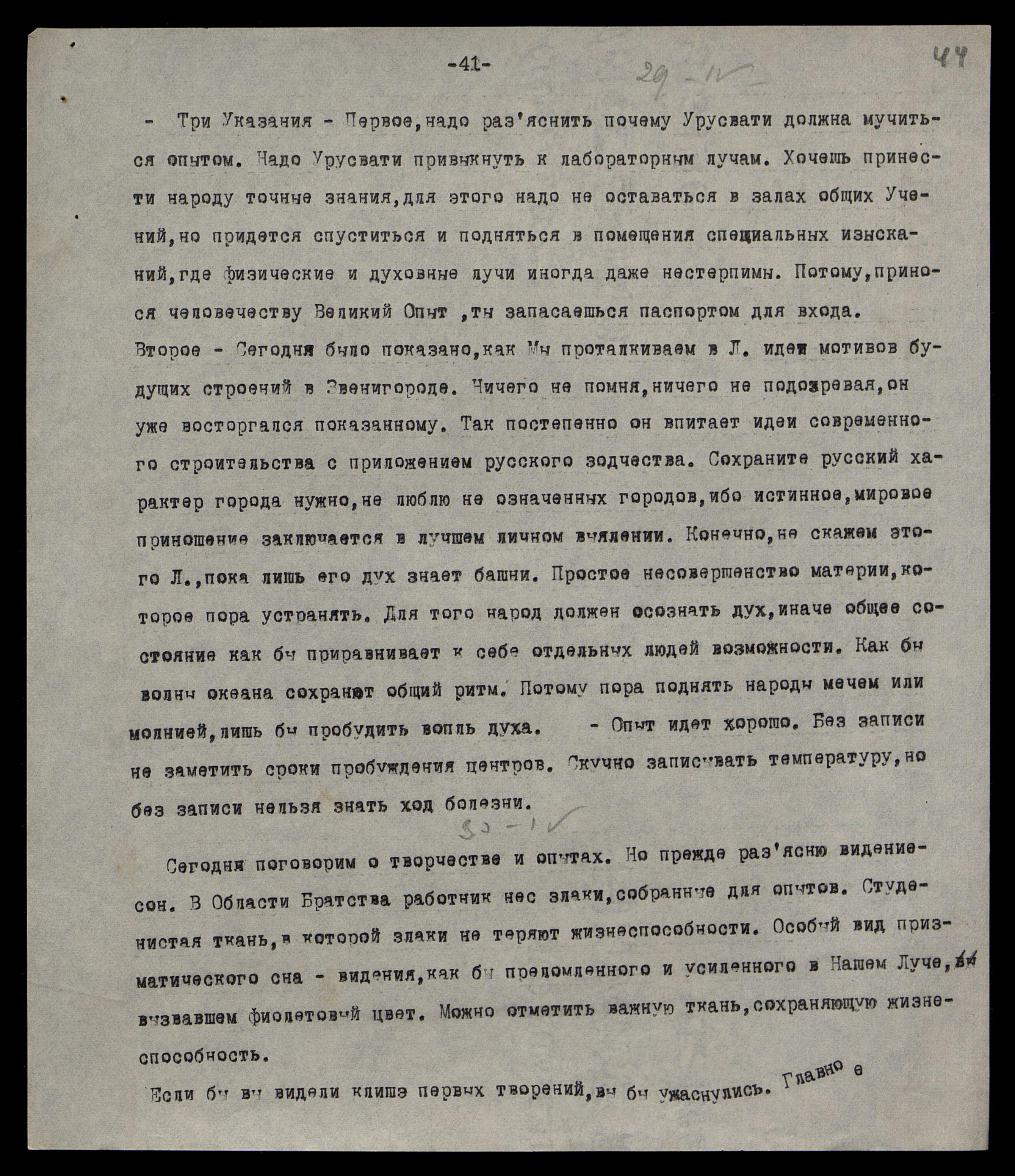 29/4. Три Указания. Первое, надо разъяснить почему Урусвати должна мучиться опытом. Надо Урусвати привыкнуть к лабораторным лучам. Хочешь принести народу точные знания, для этого надо не оставаться в залах общих Учений, но придётся спуститься и подняться в помещения специальных изысканий, где физические и духовные лучи иногда даже нестерпимы. Потому, принося человечеству Великий Опыт, ты запасаешься паспортом для входа.