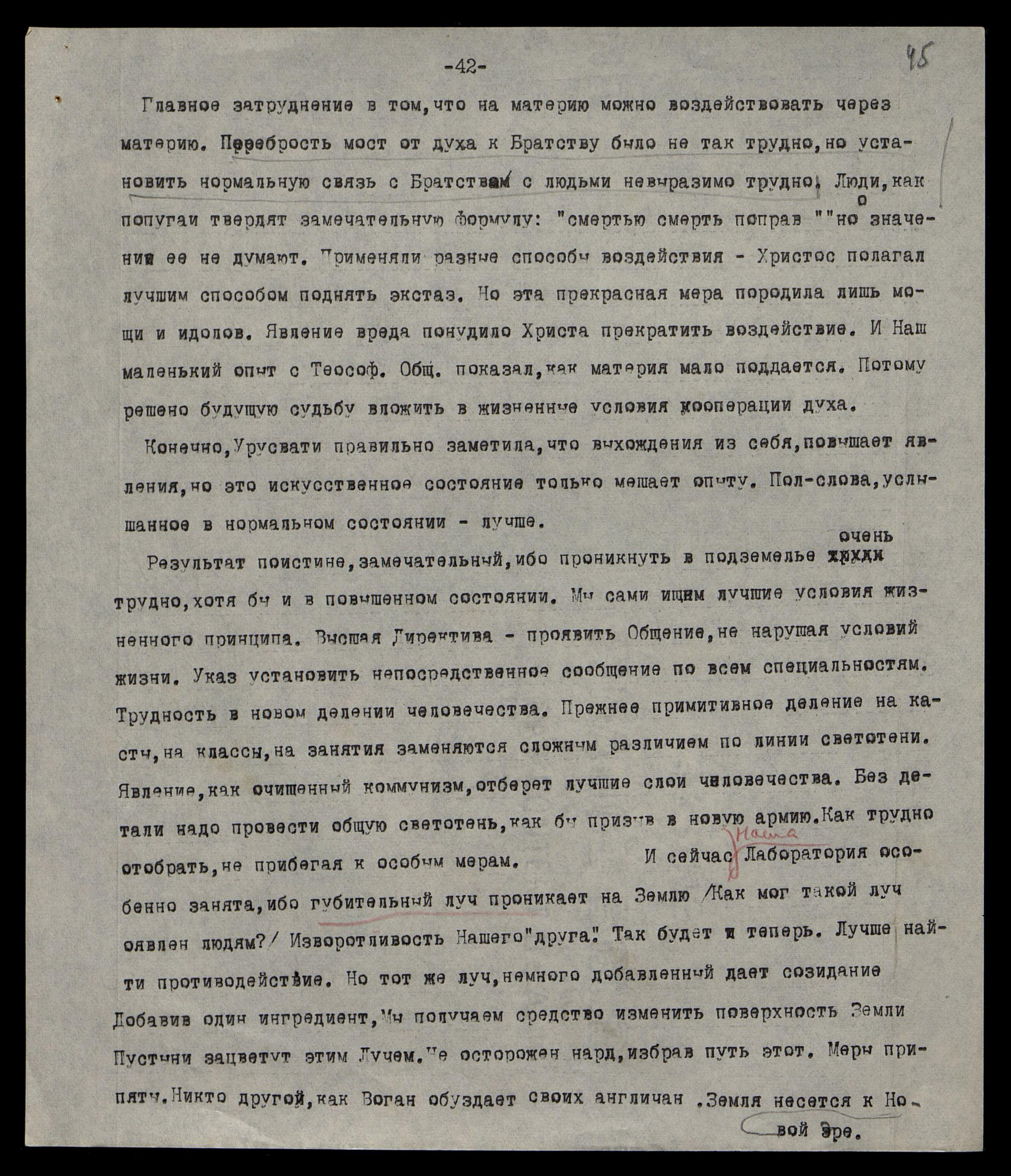 Применяли разные способы воздействия. Христос полагал лучшим способом — поднять экстаз. Но эта прекрасная мера породила лишь мощи и идолов. Явление вреда понудило Христа прекратить воздействие. И Наш маленький опыт с Теософ[ическим] Общ[еством] показал, как материя мало поддается. Потому решено будущую судьбу вложить в жизненные условия кооперации духа.