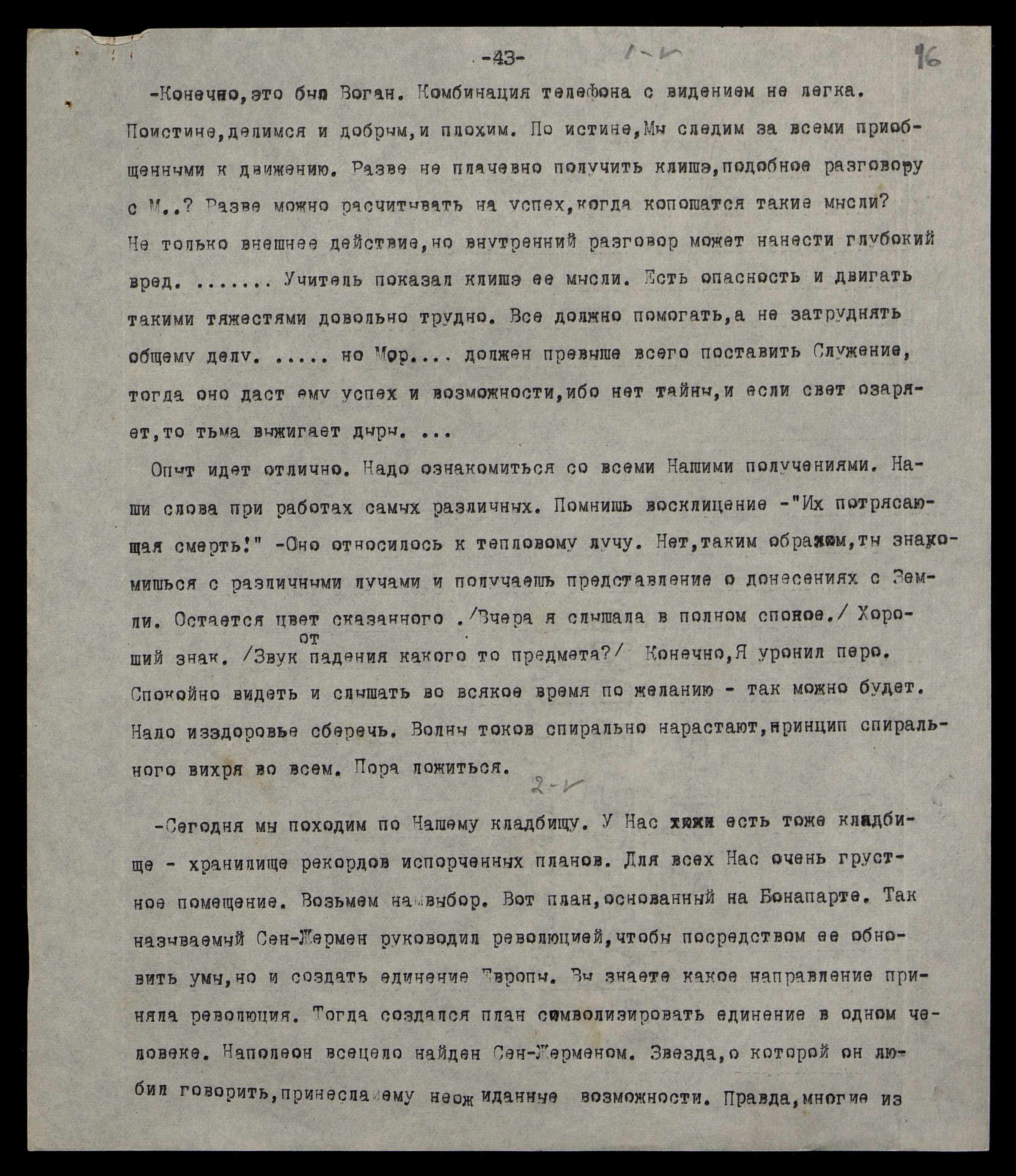 2/5. Сегодня мы походим по Нашему кладбищу. У Нас есть тоже кладбище — хранилище рекордов испорченных планов. Для всех Нас очень грустное помещение. Возьмём на выбор. Вот план, основанный на Бонапарте. Так называемый, Сен-Жермен руководил революцией, чтобы посредством её обновить умы, но и создать единение Европы. Вы знаете, какое направление приняла революция. Тогда создался план символизировать единение в одном человеке. Наполеон всецело найден Сен-Жерменом. Звезда, о которой он [Наполеон] любил говорить, принесла ему неожиданные возможности. Правда, многие из