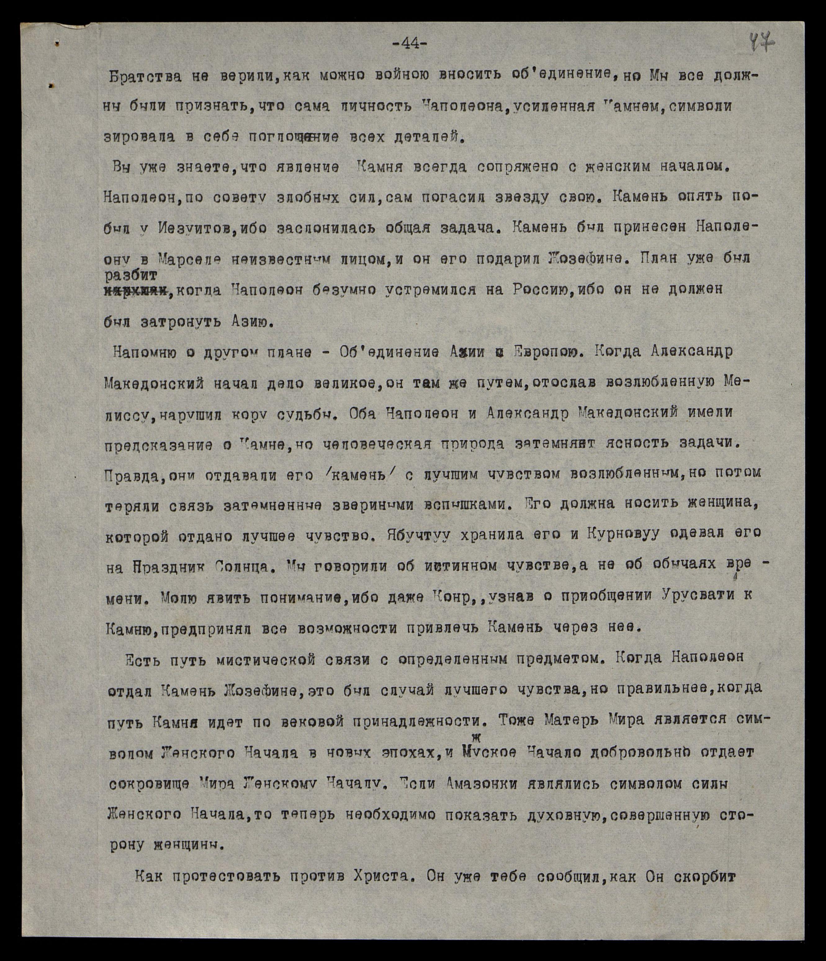 Вы уже знаете, что явление Камня всегда сопряжено с женским Началом. Наполеон, по совету злобных сил, сам погасил звезду свою. Камень опять побыл у Иезуитов, ибо заслонилась общая задача. Камень был принесён Наполеону в Марселе неизвестным лицом, и он его подарил Жозефине. План уже был разбит, когда Наполеон безумно устремился на Россию, ибо он не должен был затронуть Азию.