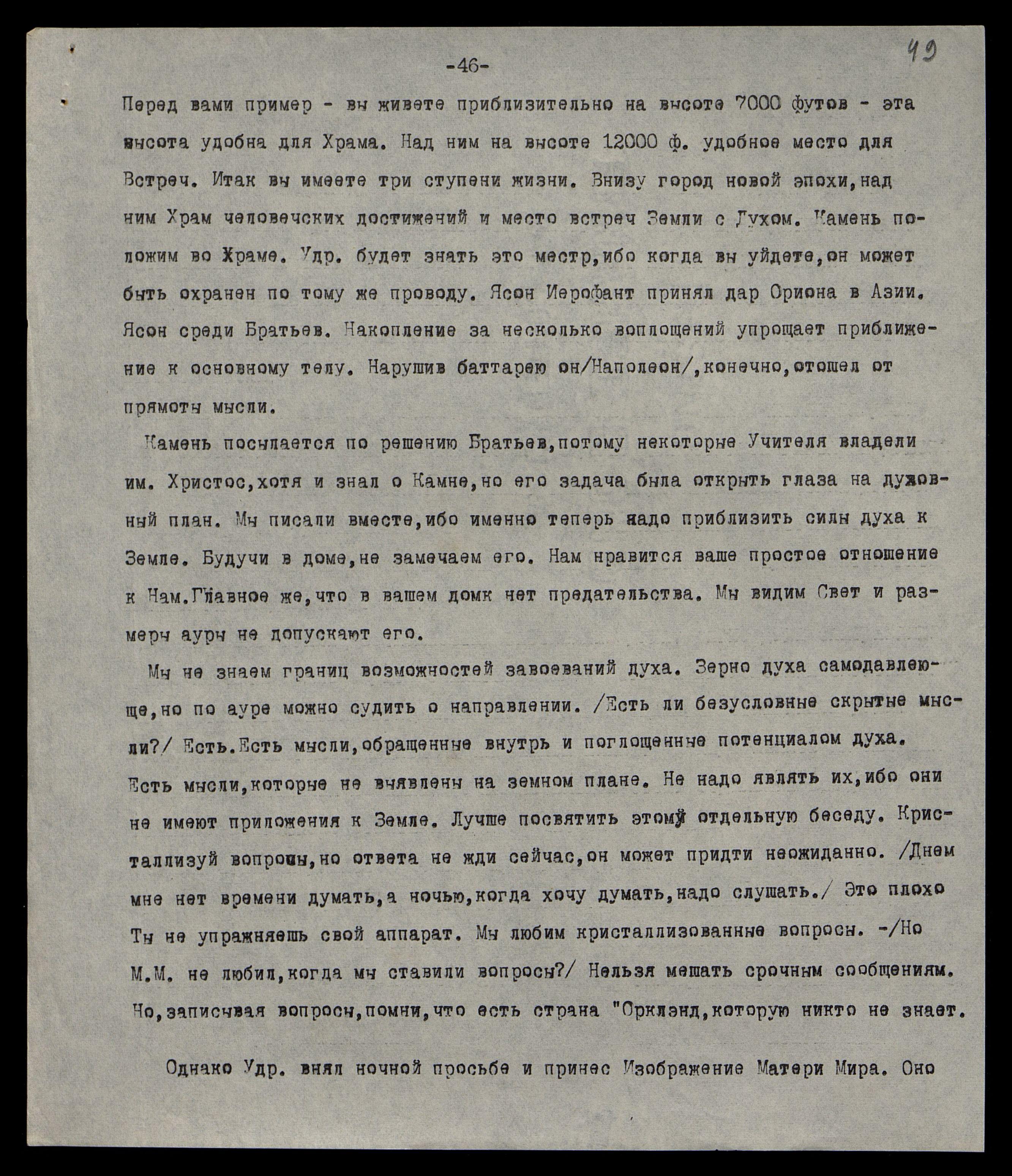Перед вами пример: вы живете приблизительно на высоте 7000 футов [2100 м] – эта высота удобна для храма. Над ним на высоте 12000 футов [3600 м] удобное место для Встреч. Итак, вы имеете три ступени жизни. Внизу город новой эпохи, над ним — Храм человеческих достижений и место встреч Земли с Духом. Камень положим во Храме. Удр[ая] будет знать это место, ибо, когда вы уйдёте, он может быть охранён по тому же проводу. Ясон Иерофант принял дар Ориона в Азии. Ясон среди Братьев. Накопление за несколько воплощений упрощает приближение к основному телу. Нарушив батарею, он (Наполеон), конечно, отошёл от прямоты мысли.