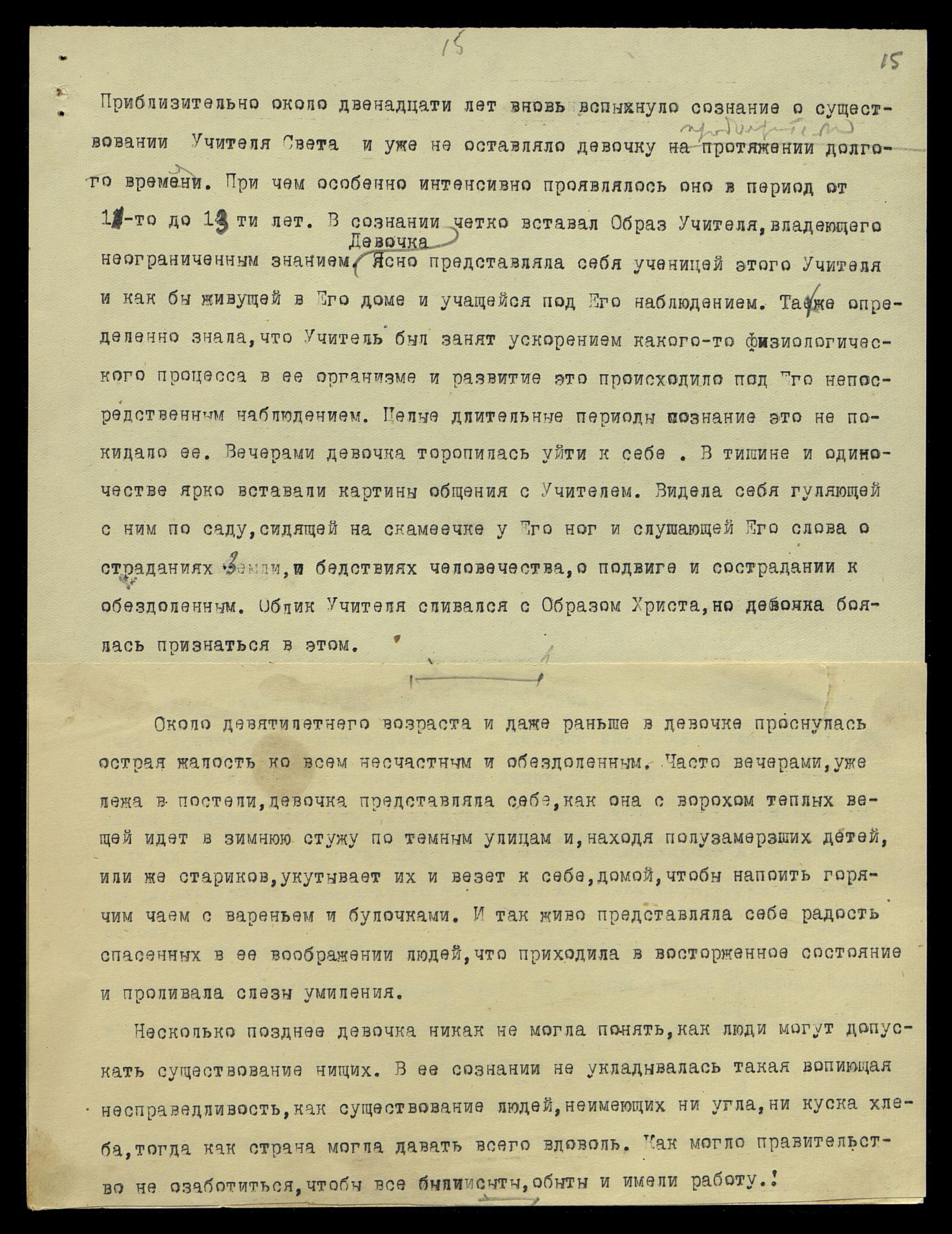 Приблизительно около двенадцати лет вспыхнуло сознание о существовании Учителя Света и уже не оставляло девочку продолжительное время. Причем особенно интенсивно проявлялось оно в период от 11 до 13 лет. В сознании четко вставал Образ Учителя, владеющего неограниченным знанием. Девочка ясно представляла себя ученицей этого Учителя и как бы живущей в Его доме и учащейся под Его наблюдением. Так же определенно знала, что Учитель был занят ускорением какого-то физиологического процесса в ее организме, и развитие это происходило под Его непосредственным наблюдением. Целые длительные периоды сознание это не покидало ее. Вечерами девочка торопилась уйти к себе. В тишине и одиночестве ярко вставали картины общения с Учителем. Видела себя гуляющей с ним по саду, сидящей на скамеечке у Его ног и слушающей Его слова о страданиях Земли и бедствиях человечества, о подвиге и сострадании к обездоленным. Облик Учителя сливался с Образом Христа, но девочка боялась признаться в этом.