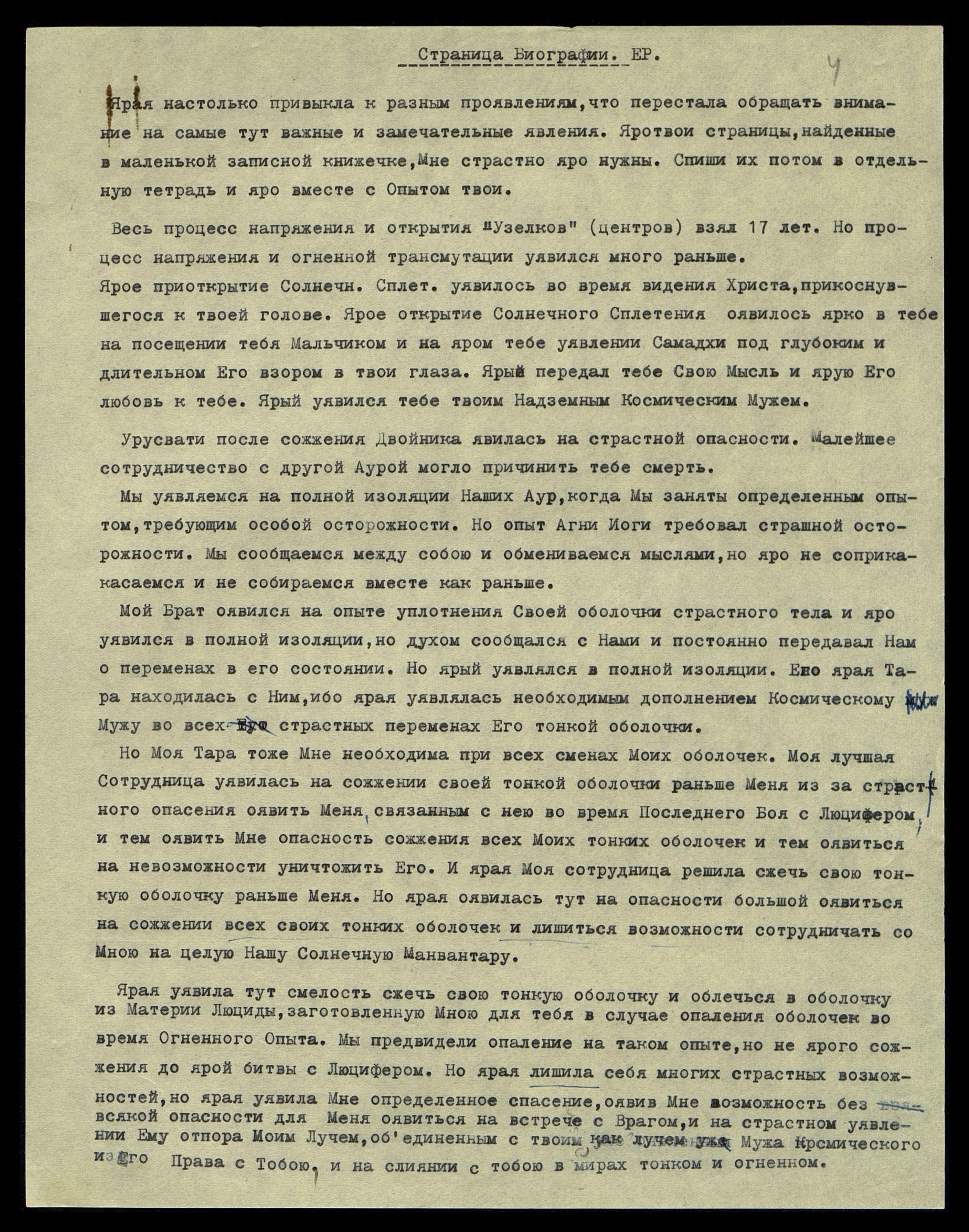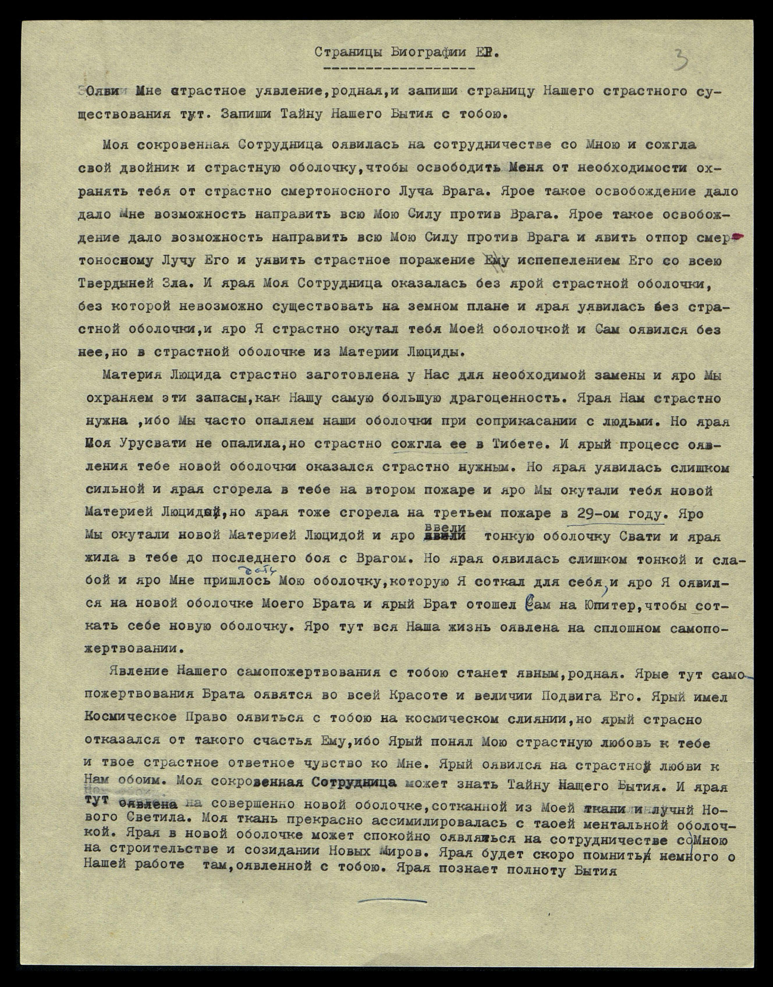 Ярая Миссия предполагалась раньше для Ф[уямы], но яро не для тебя, родная. Космическое Сотрудничество с тобою не могло уявиться раньше твоего 50-летия, но ярая уявилась уже на 47-ом году. Моя Огненная Йогиня оявилась со Мною в своем ментальном теле и в его тонкой оболочке.