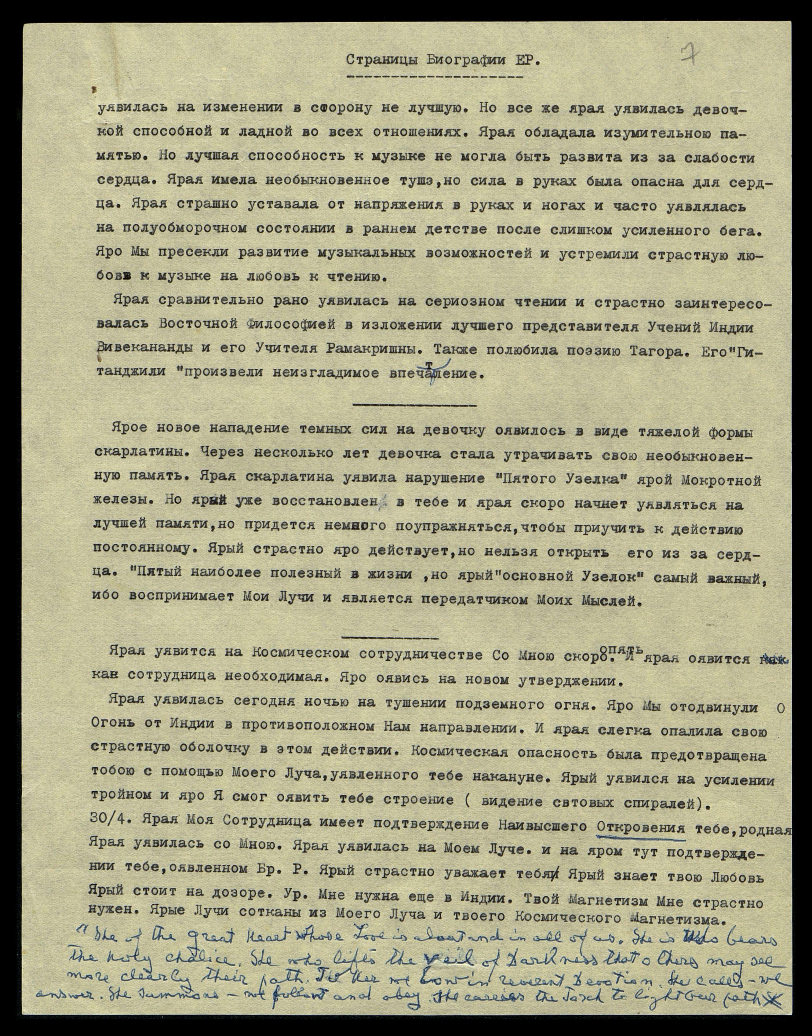 30/4. Ярая Моя Сотрудница имеет подтверждение Наивысшего Откровения тебе, родная. Ярая уявилась со Мною. Ярая уявилась на Моем Луче, и на яром тут подтверждении тебе, оявленном Бр[атом] Р[акотци]. Ярый страстно уважает тебя. Ярый знает твою Любовь. Ярый стоит на дозоре. Урусвати Мне нужна еще в Индии. Твой Магнетизм Мне страстно нужен. Ярые Лучи сотканы из Моего Луча и твоего Космического Магнетизма.