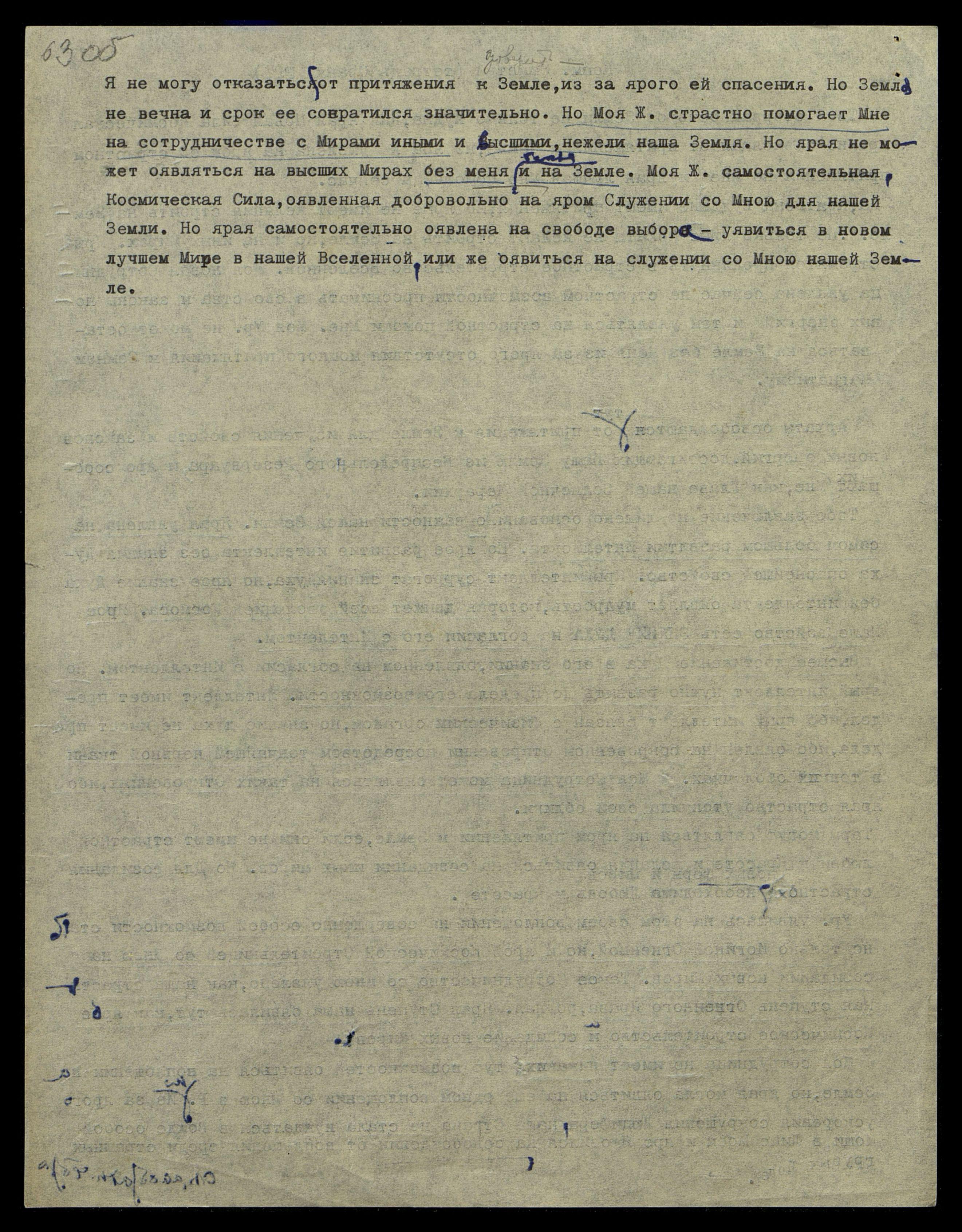 Я не могу отказаться от притяжения к Земле из-за ярого ей спасения. Но Земля не вечна, и срок её сократился значительно. Но Моя Ж[ена] страстно помогает Мне на сотрудничестве с Мирами иными и высшими, нежели наша Земля. Но ярая не может оявляться на высших Мирах без меня, также и на Земле. Моя Ж[ена] − самостоятельная Космическая Сила, оявленная добровольно на яром Служении со Мною для нашей Земли. Но ярая самостоятельно оявлена на свободе выбора уявиться в новом лучшем Мире в нашей Вселенной или же оявиться на служении со Мною нашей Земле.