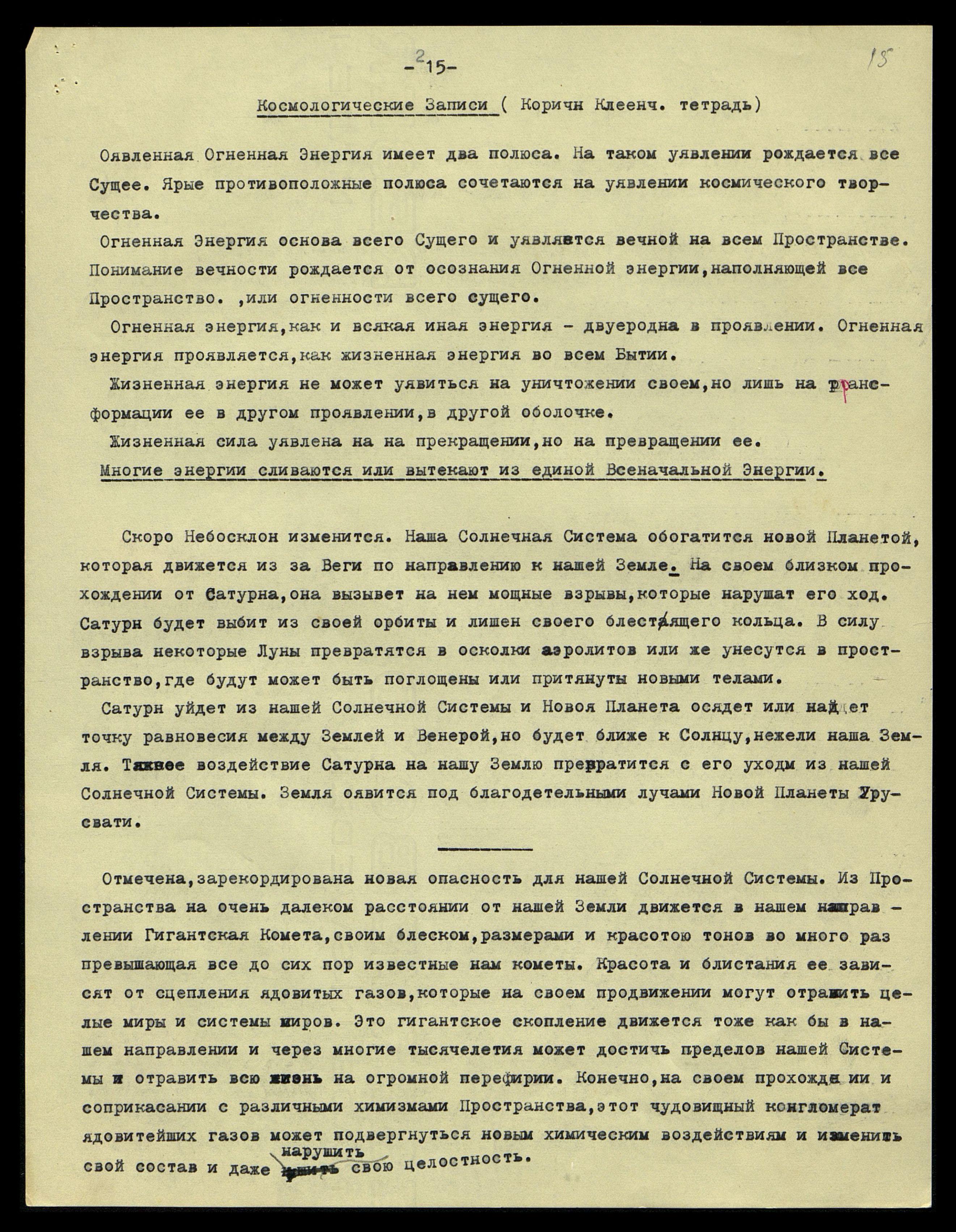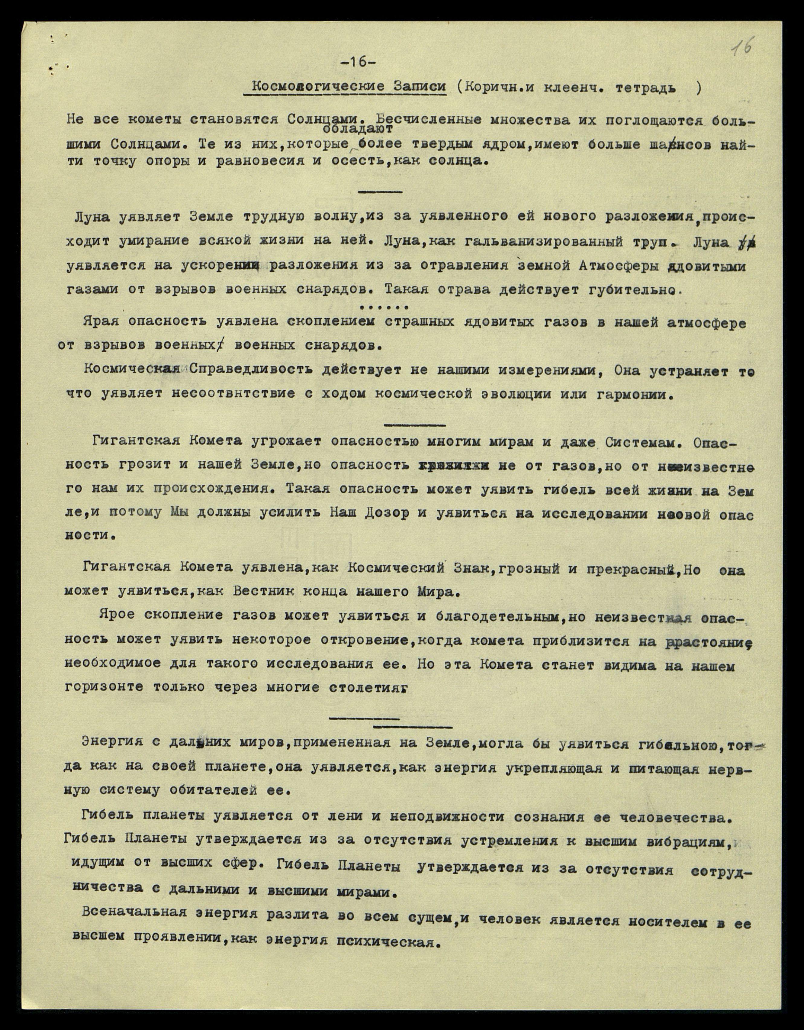 Отмечена, зарекордирована новая опасность для нашей Солнечной Системы. Из Пространства на очень далёком расстоянии от нашей Земли движется в нашем направлении Гигантская Комета, своим блеском, размерами и красотою тонов во много раз превышающая все до сих пор известные нам кометы. Красота и блистания её зависят от сцепления ядовитых газов, которые на своём продвижении могут отравить целые миры и системы миров. Это гигантское скопление движется тоже как бы в нашем направлении и через многие тысячелетия может достичь пределов нашей Системы и отравить всю жизнь на огромной периферии. Конечно, на своём прохождении и соприкасании с различными химизмами Пространства этот чудовищный конгломерат ядовитейших газов может подвергнуться новым химическим воздействиям и изменить свой состав, и даже нарушить свою целостность.