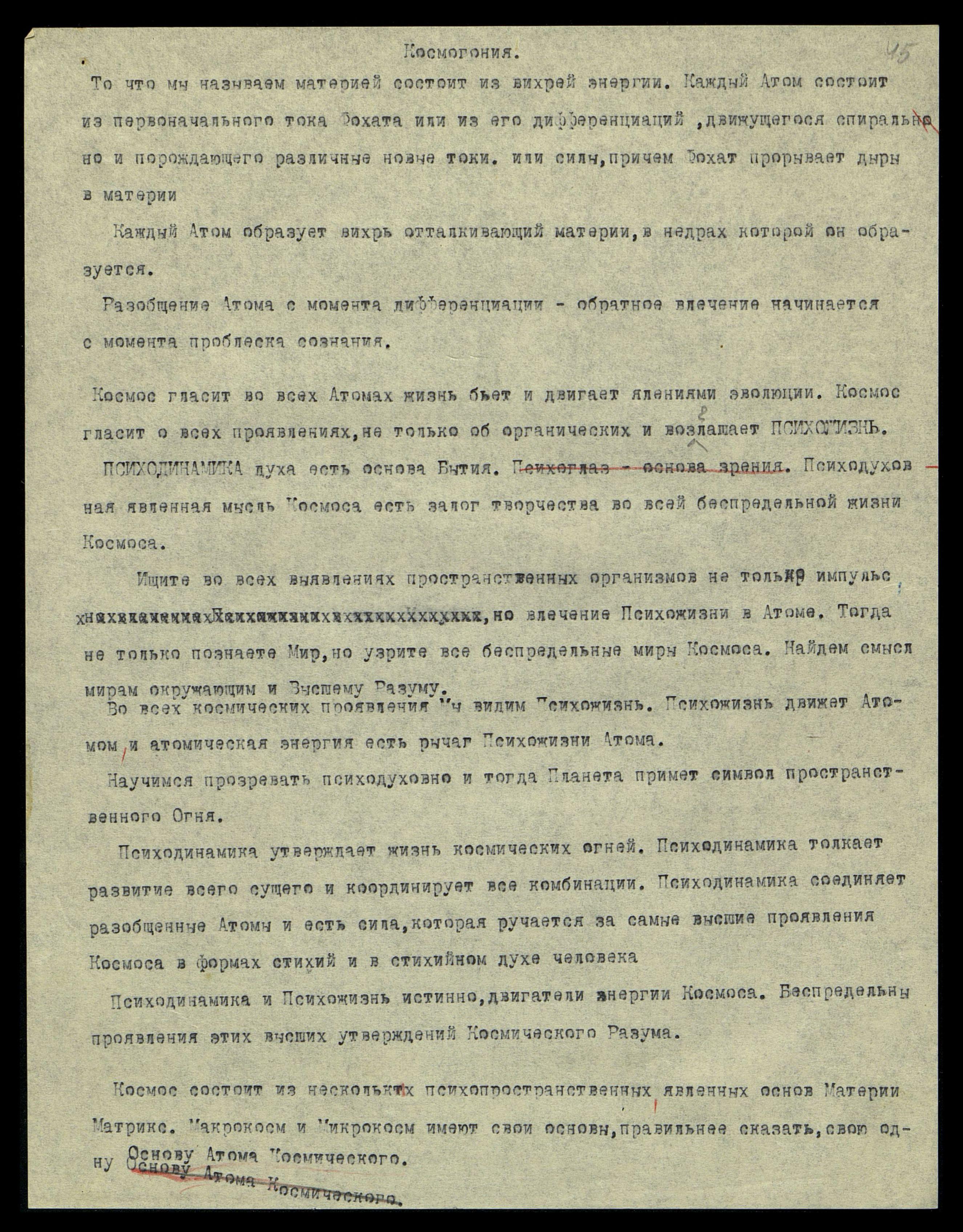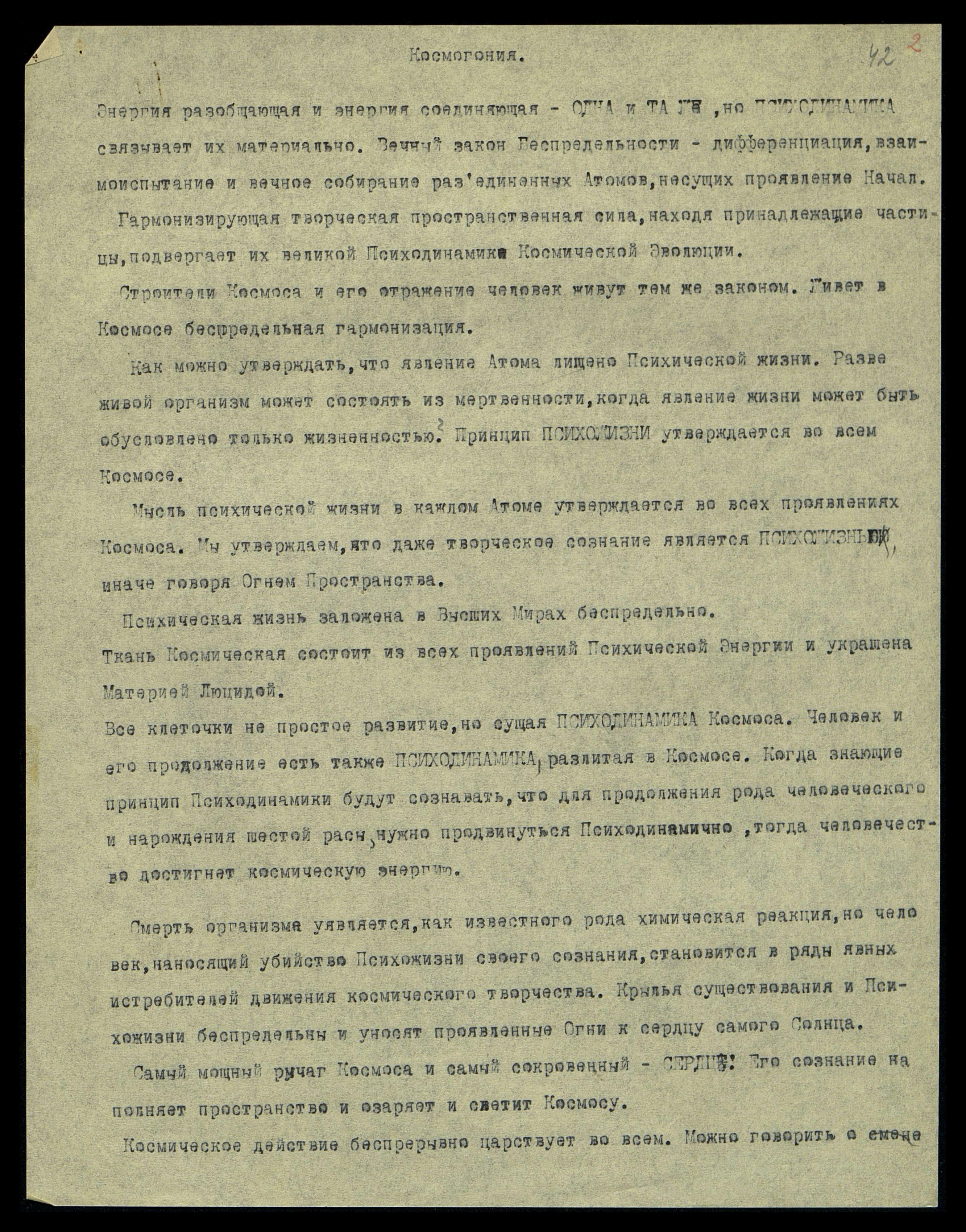Космос гласит: во всех Атомах жизнь бьёт и двигает явлениями эволюции. Космос гласит о всех проявлениях, не только об органических, и возглашает ПСИХОЖИЗНЬ.