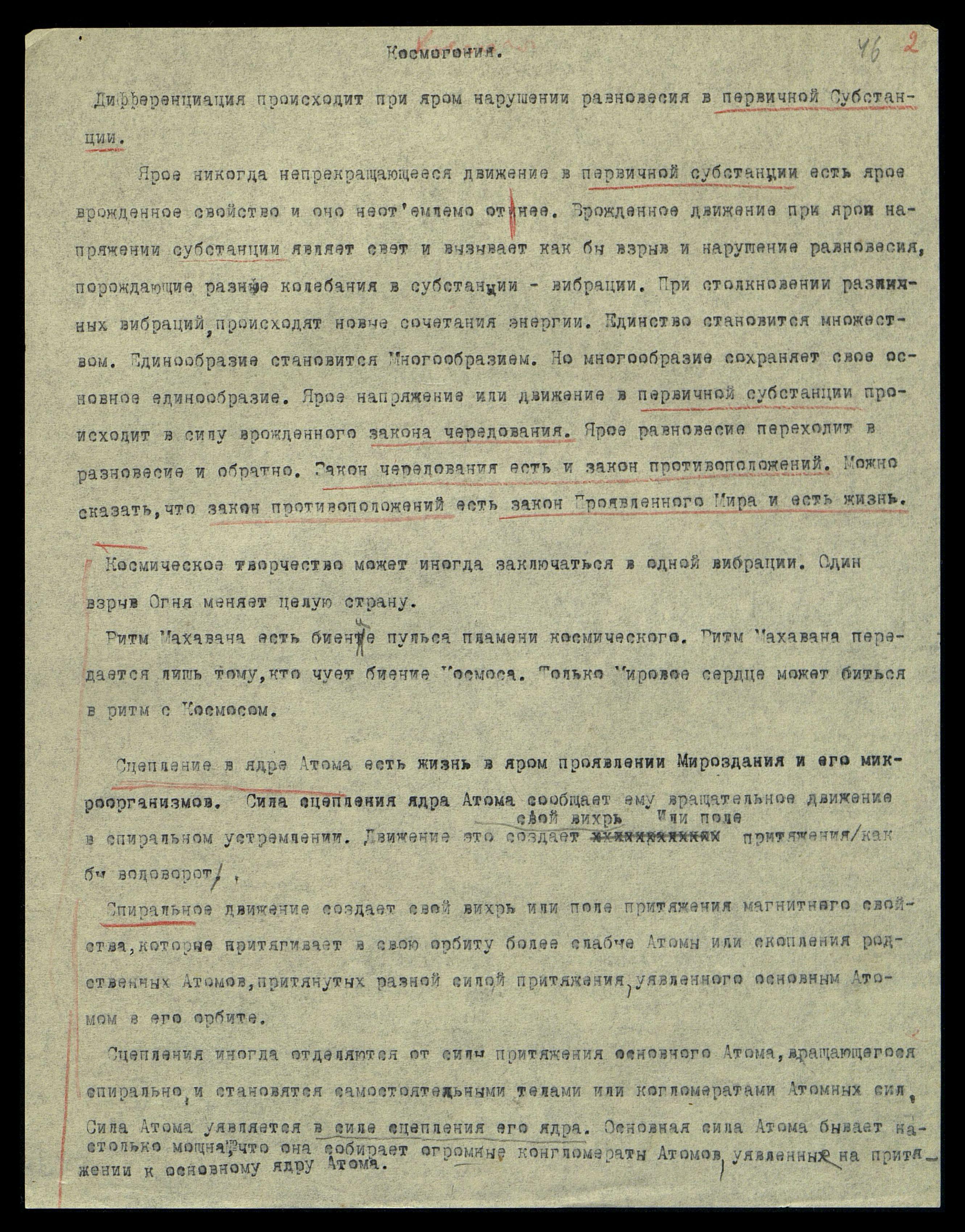 Ярое никогда не прекращающееся движение в первичной субстанции есть ярое врождённое свойство, и оно неотъемлемо от неё. Врождённое движение при яром напряжении субстанции являет свет и вызывает как бы взрыв и нарушение равновесия, порождающие разные колебания в субстанции − вибрации. При столкновении различных вибраций происходят новые сочетания энергии. Единство становится множеством. Единообразие становится Многообразием. Но многообразие сохраняет своё основное единообразие. Ярое напряжение или движение в первичной субстанции происходит в силу врождённого закона чередования. Ярое равновесие переходит в разновесие и обратно. Закон чередования есть и закон противоположений. Можно сказать, что закон противоположений есть закон проявленного Мира и есть жизнь.