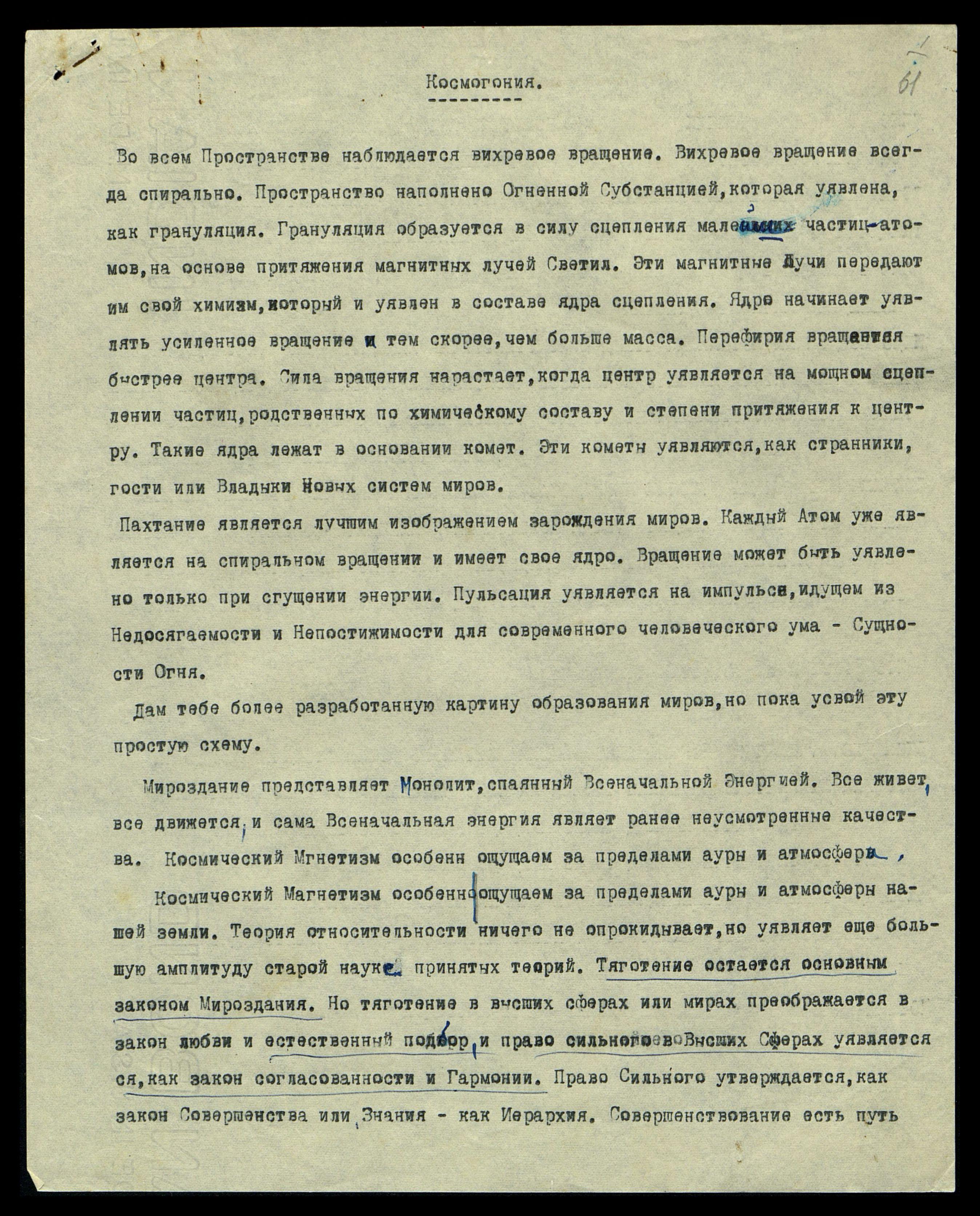 Космический Магнетизм особенно ощущаем за пределами ауры и атмосферы нашей земли. Теория относительности ничего не опрокидывает, но уявляет еще большую амплитуду старой науки принятых теорий. Тяготение остаётся основным законом Мироздания. Но тяготение в высших сферах, или мирах, преображается в закон любви, и естественный подбор и право сильного в Высших Сферах уявляется как закон согласованности и Гармонии. Право Сильного утверждается как закон Совершенства или Знания − как Иерархия. Совершенствование есть путь