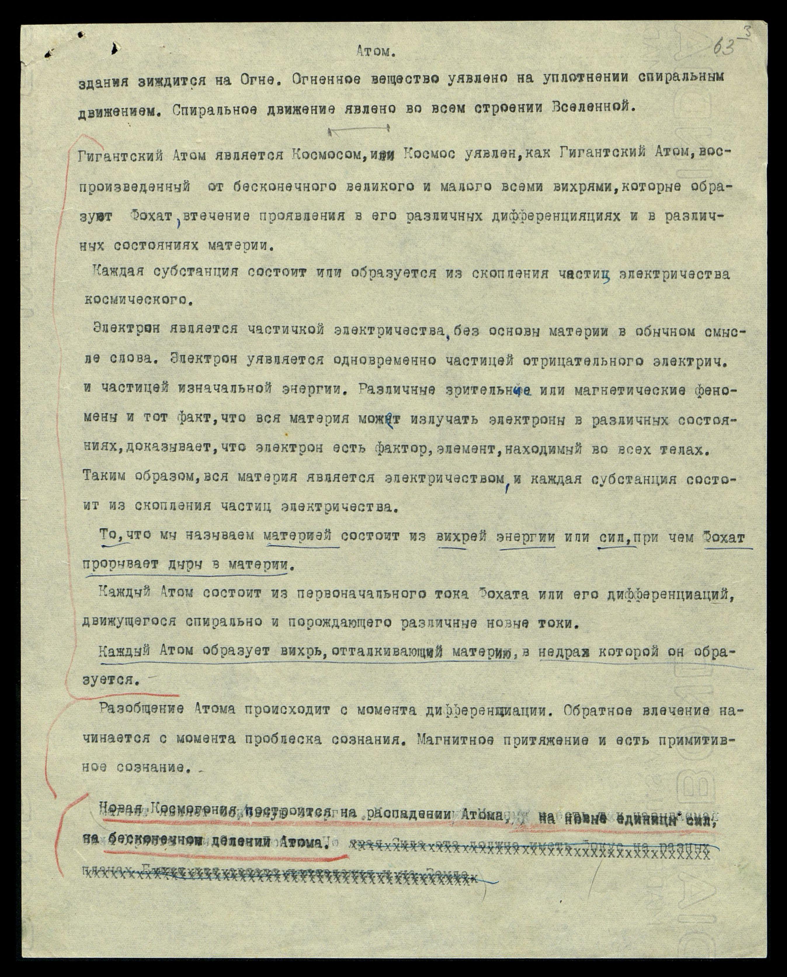 Электрон является частичкой электричества без основы материи в обычном смысле слова. Электрон уявляется одновременно частицей отрицательного электрич[ества] и частицей изначальной энергии. Различные зрительные или магнетические феномены и тот факт, что вся материя может излучать электроны в различных состояниях, доказывает, что электрон есть фактор, элемент, находимый во всех телах. Таким образом, вся материя является электричеством, и каждая субстанция состоит из скопления частиц электричества.