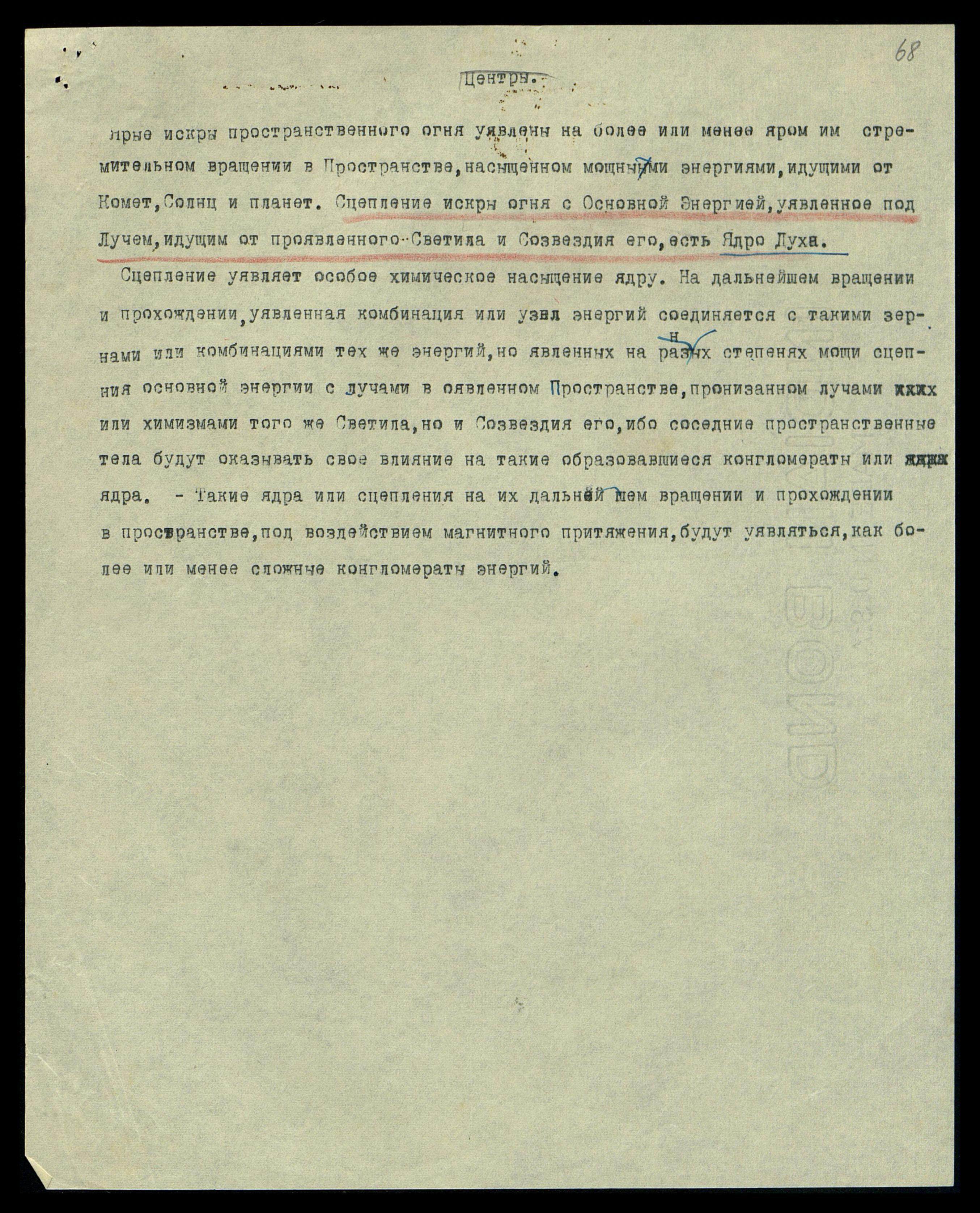 Ярые искры пространственного огня уявлены на более или менее яром им стремительном вращении в Пространстве, насыщенном мощными энергиями, идущими от Комет, Солнц и планет. Сцепление искры огня с Основной Энергией, уявленное под Лучом, идущим от проявленного Светила и Созвездия его, есть Ядро Духа.