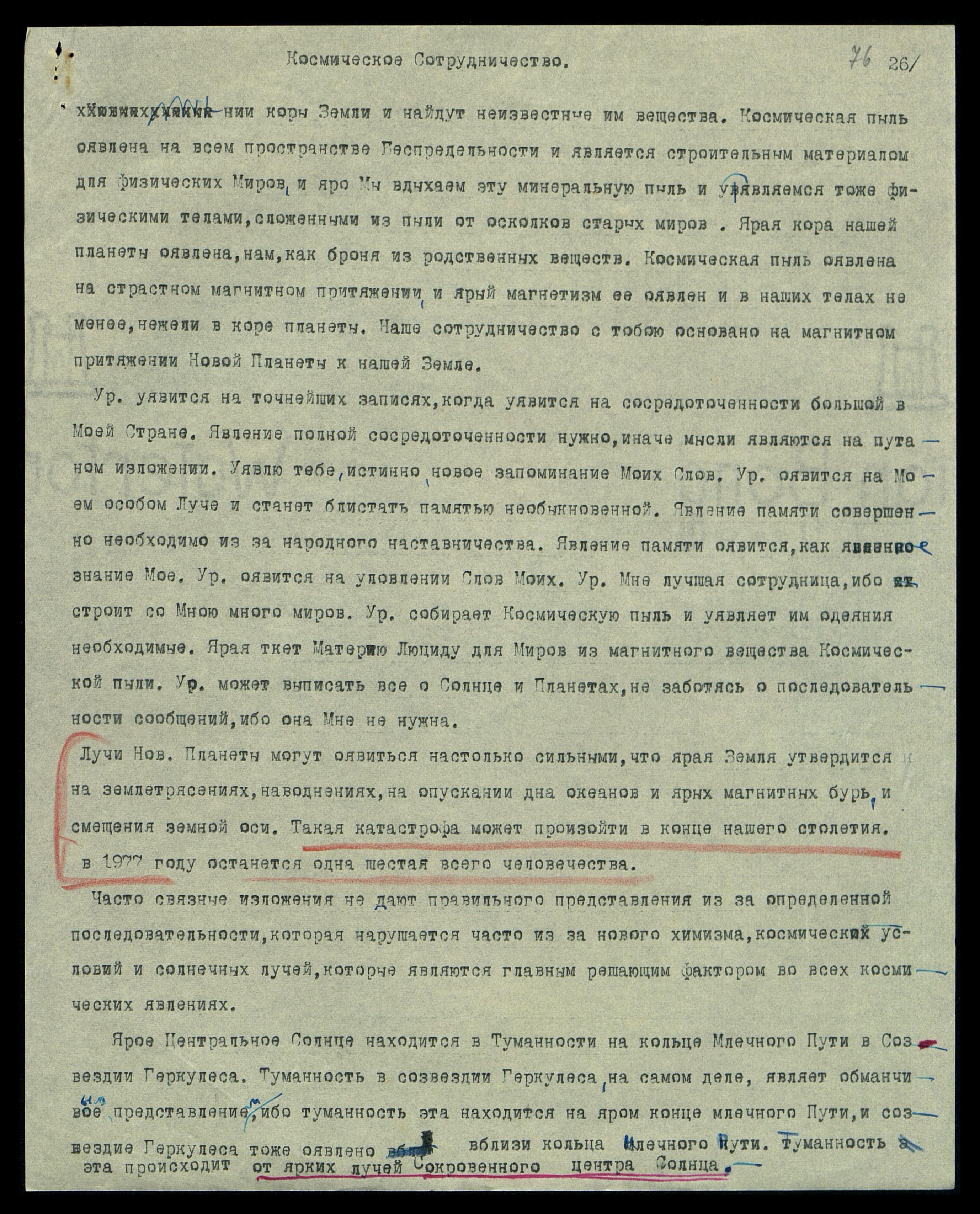 Лучи Нов[ой] Планеты могут оявиться настолько сильными, что ярая Земля утвердится на землетрясениях, наводнениях, на опускании дна океанов и ярых магнитных бурь и смещения земной оси. Такая катастрофа может произойти в конце нашего столетия, в 1977 году, останется одна шестая всего человечества.