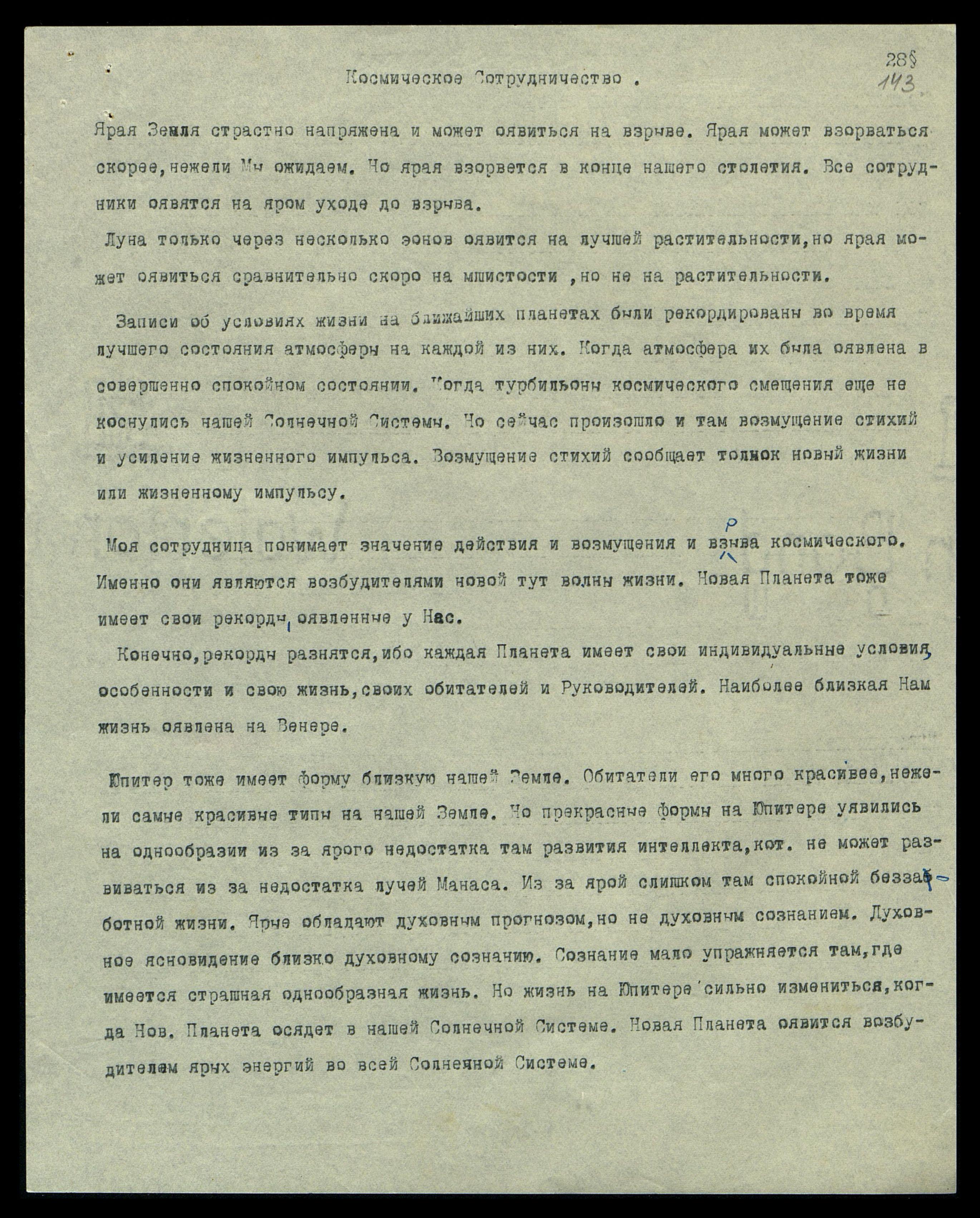 Юпитер тоже имеет форму, близкую нашей Земле. Обитатели его много красивее, нежели самые красивые типы на нашей Земле. Но прекрасные формы на Юпитере уявились на однообразии из-за ярого недостатка там развития интеллекта, который не может развиваться из-за недостатка лучей Манаса. Из-за ярой, слишком там спокойной, беззаботной жизни. Ярые обладают духовным прогнозом, но не духовным сознанием. Духовное ясновидение близко духовному сознанию. Сознание мало упражняется там, где имеется страшная однообразная жизнь. Но жизнь на Юпитере сильно изменится, когда Нов[ая] Планета осядет в нашей Солнечной Системе. Новая Планета оявится возбудителем ярых энергий во всей Солнечной Системе.