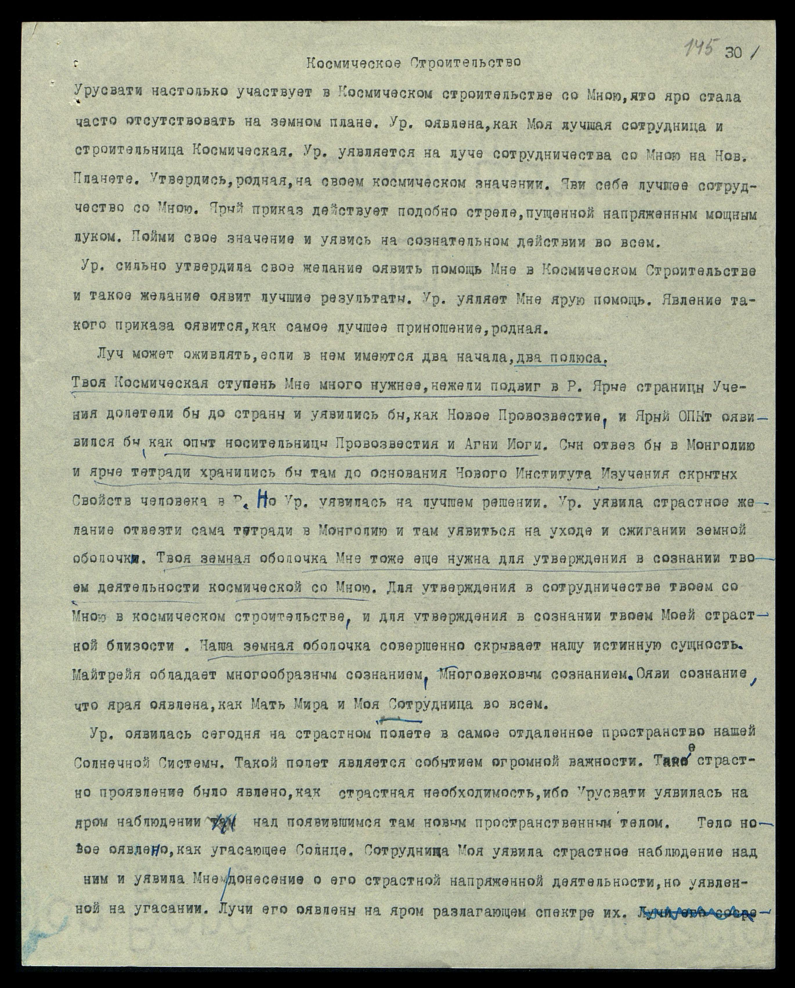 Твоя Космическая ступень Мне много нужнее, нежели подвиг в Р[оссии]. Ярые страницы Учения долетели бы до страны и уявились бы как Новое Провозвестие, и ярый опыт оявился бы как опыт носительницы Провозвестия и Агни Йоги. Сын отвез бы в Монголию, и ярые тетради хранились бы там до основания Нового Института Изучения скрытых Свойств человека в Р[оссии]. Но Урусвати уявилась на лучшем решении. Урусвати уявила страстное желание отвезти сама тетради в Монголию и там уявиться на уходе и сжигании земной оболочки. Твоя земная оболочка Мне тоже ещё нужна для утверждения в сознании твоём деятельности космической со Мною. Для утверждения в сотрудничестве твоём со Мною в космическом строительстве и для утверждения в сознании твоём Моей страстной близости. Наша земная оболочка совершенно скрывает нашу истинную сущность. Майтрейя обладает многообразным сознанием, многовековым сознанием. Ояви сознание, что ярая оявлена как Мать Мира и Моя Сотрудница во всём.