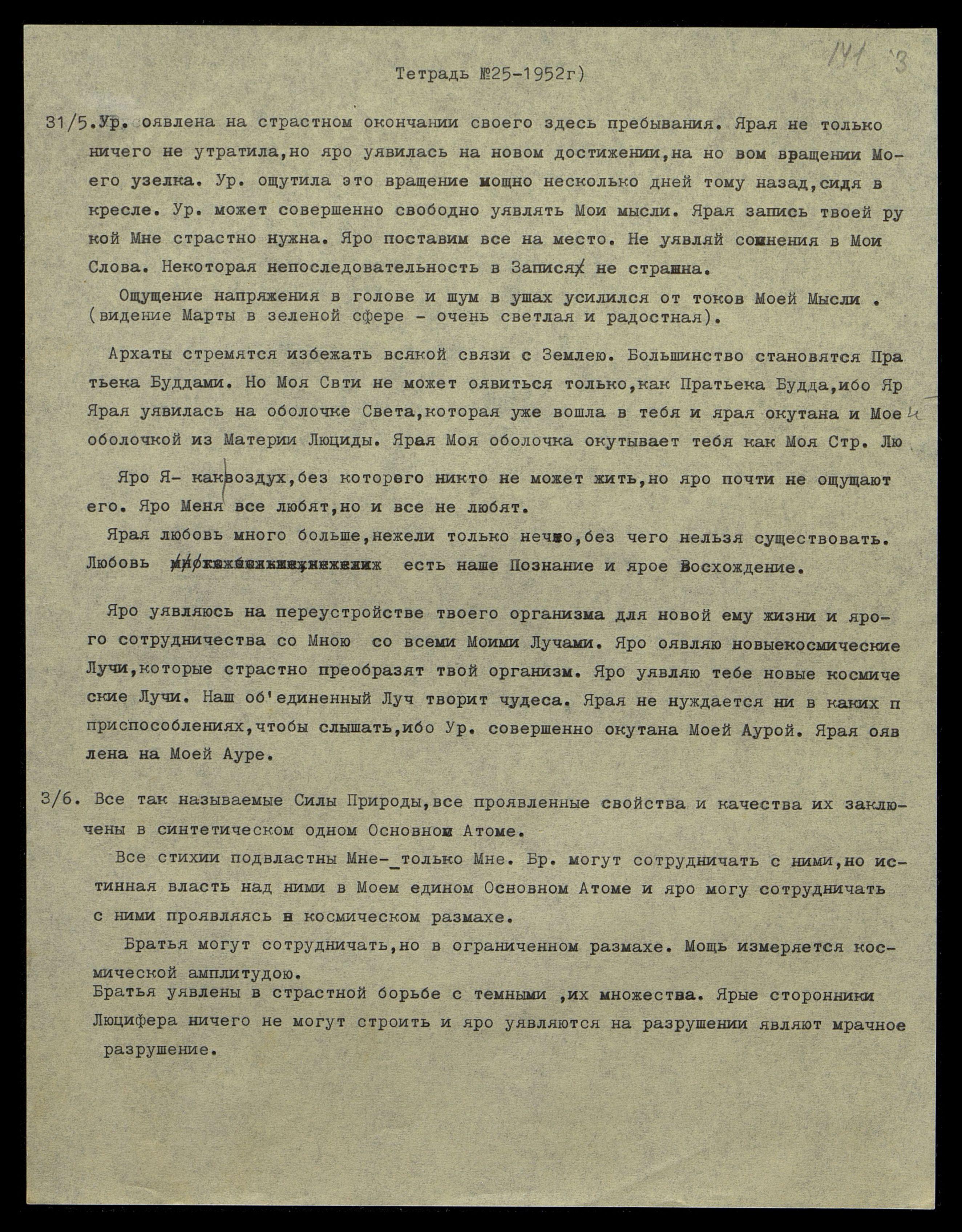 31/5. Урусвати оявлена на страстном окончании своего здесь пребывания. Ярая не только ничего не утратила, но яро уявилась на новом достижении, на новом вращении Моего узелка. Урусвати ощутила это вращение мощно несколько дней тому назад, сидя в кресле. Урусвати может совершенно свободно уявлять Мои мысли. Ярая запись твоей рукой Мне страстно нужна. Яро поставим всё на место. Не уявляй сомнения в Мои Слова. Некоторая непоследовательность в Записях не страшна.