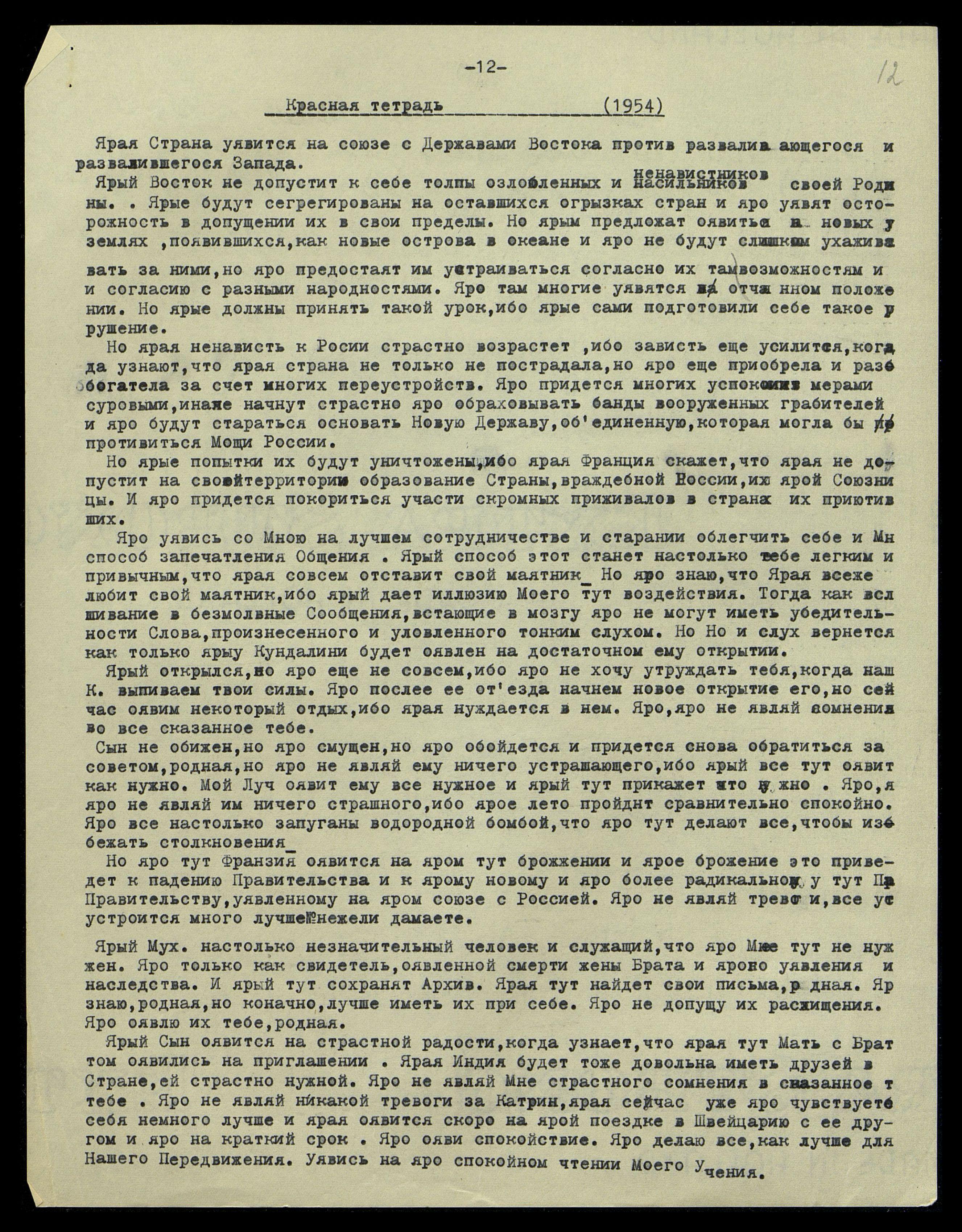 9/4. Яви всю осторожность, яви всю готовность и ярую Мне страстную Любовь, родная. Трудное время пройдет и ярая воспрянет снова в силе и устремлении ко Мне. Яро знаю, насколько, родная, хочет уявить Мне все свое существо и свое устремление. Яро знаю. Но ярая больная Галина сегодня чувствует себя лучше и яро могу сказать тебе, что ярая тут поправится. Но яро не являй ничего особенного, но яро только напиши записку ей о яром ей полном выздоровлении через некоторое время. Яро уяви ей страстное уявление одной пилюли строфанта в день. Яро уяви ей эту возможность, но яро, когда ярая уявится на желании повидать тебя. Ярая тут отвезет ей баночку строфанта и яро скажет: ярая может принимать по пяти капель в жидком виде. Яро ояви ей необходимость иметь лучшие пилюли и ярая может выписать их из Швейцарии. Яро ояви Мне свою радость, родная. Яро тут поправлю ее ради тебя, родная. Ярая тут поправится, Мне хочется уявить тебе эту радость.
