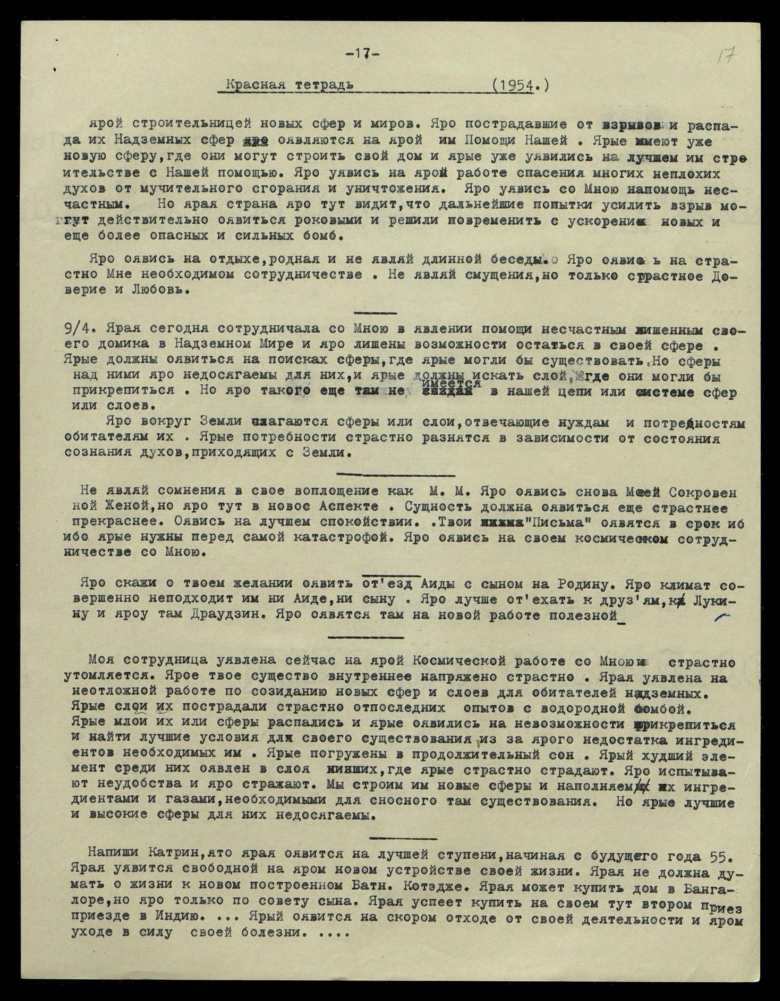 Напиши Катрин, что ярая оявится на лучшей ступени, начиная с будущего года − [19]55. Ярая уявится свободной на яром новом устройстве своей жизни. Ярая не должна думать о жизни в новом, построенном Батн[агаром], коттедже. Ярая может купить дом в Бангалоре, но яро только по совету сына. Ярая успеет купить на своем тут втором приезде в Индию... Ярый оявится на скором отходе от своей деятельности и яром уходе в силу своей болезни...