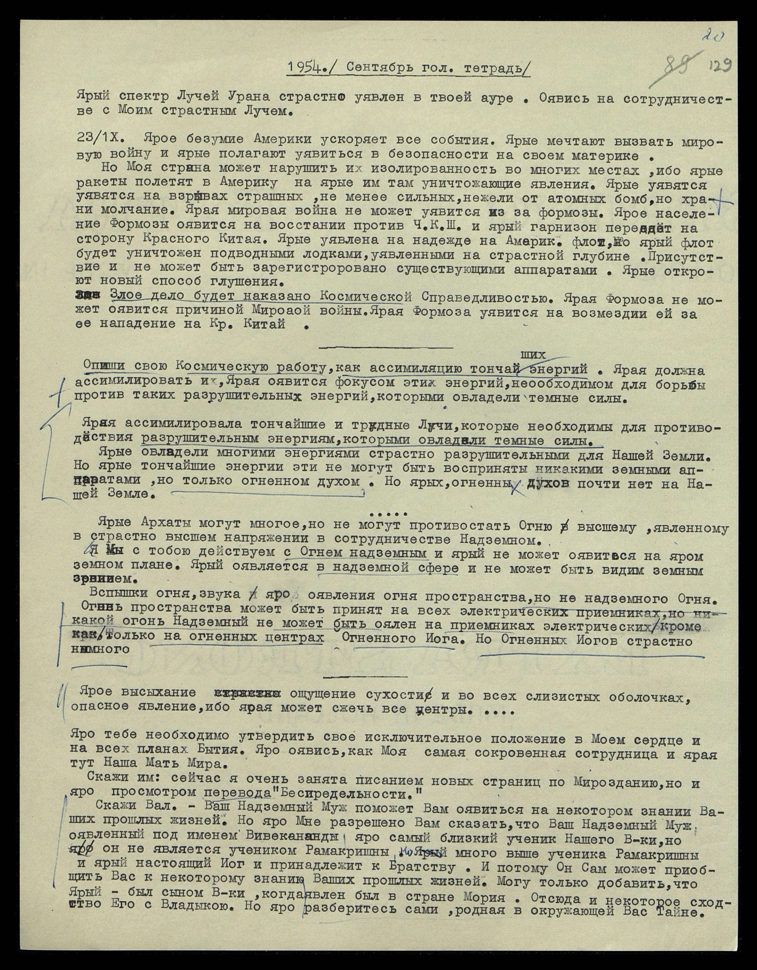 Но Моя страна может нарушить их изолированность во многих местах, ибо ярые ракеты полетят в Америку на ярые им там уничтожающие явления. Ярые уявятся на взрывах страшных, не менее сильных, нежели от атомных бомб, но храни молчание. Ярая мировая война не может уявится из-за Формозы. Ярое население Формозы оявится на восстании против Ч[ан] К[ай] Ш[и] и ярый гарнизон перейдет на сторону Красного Китая. Ярые уявлены на надежде на Америк[анский] флот, но ярый флот будет уничтожен подводными лодками, уявленными на страстной глубине. Присутствие и[х] не может быть зарегистрировано существующими аппаратами. Ярые откроют новый способ глушения.
