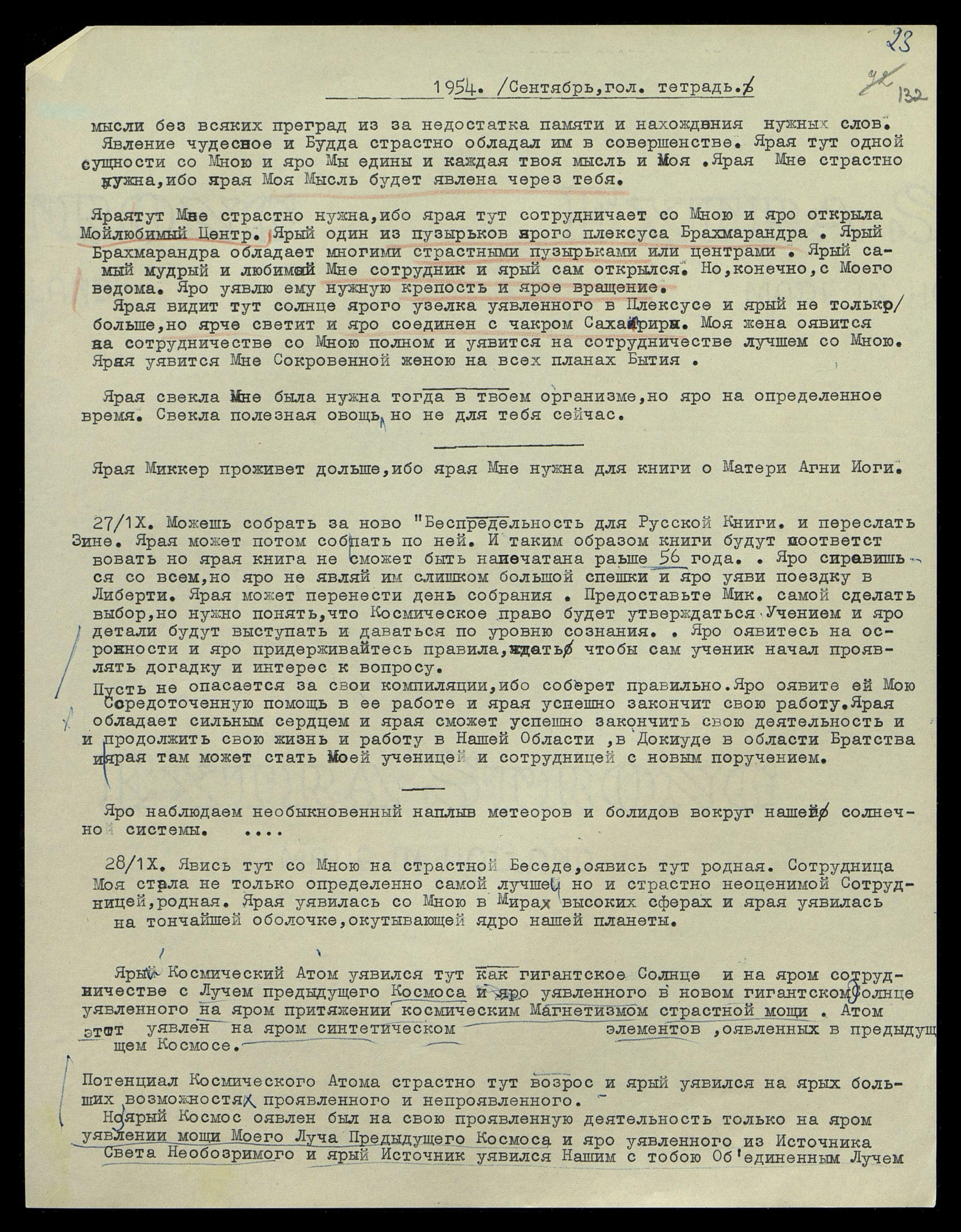 27/IX. Можешь собрать заново "Беспредельность" для русской Книги и переслать Зине. Ярая может потом собрать по ней. И, таким образом, книги будут соответствовать, но ярая книга не сможет быть напечатана раньше [19]56 года. Яро справишься со всем, но яро не являй им слишком большой спешки и яро уяви поездку в Либерти. Ярая может перенести день собрания. Предоставьте Мик[кер] самой сделать выбор, но нужно понять, что Космическое Право будет утверждаться Учением и яро детали будут выступать и даваться по уровню сознания. Яро оявитесь на осторожности и яро придерживайтесь правила ждать, чтобы сам ученик начал проявлять догадку и интерес к вопросу.