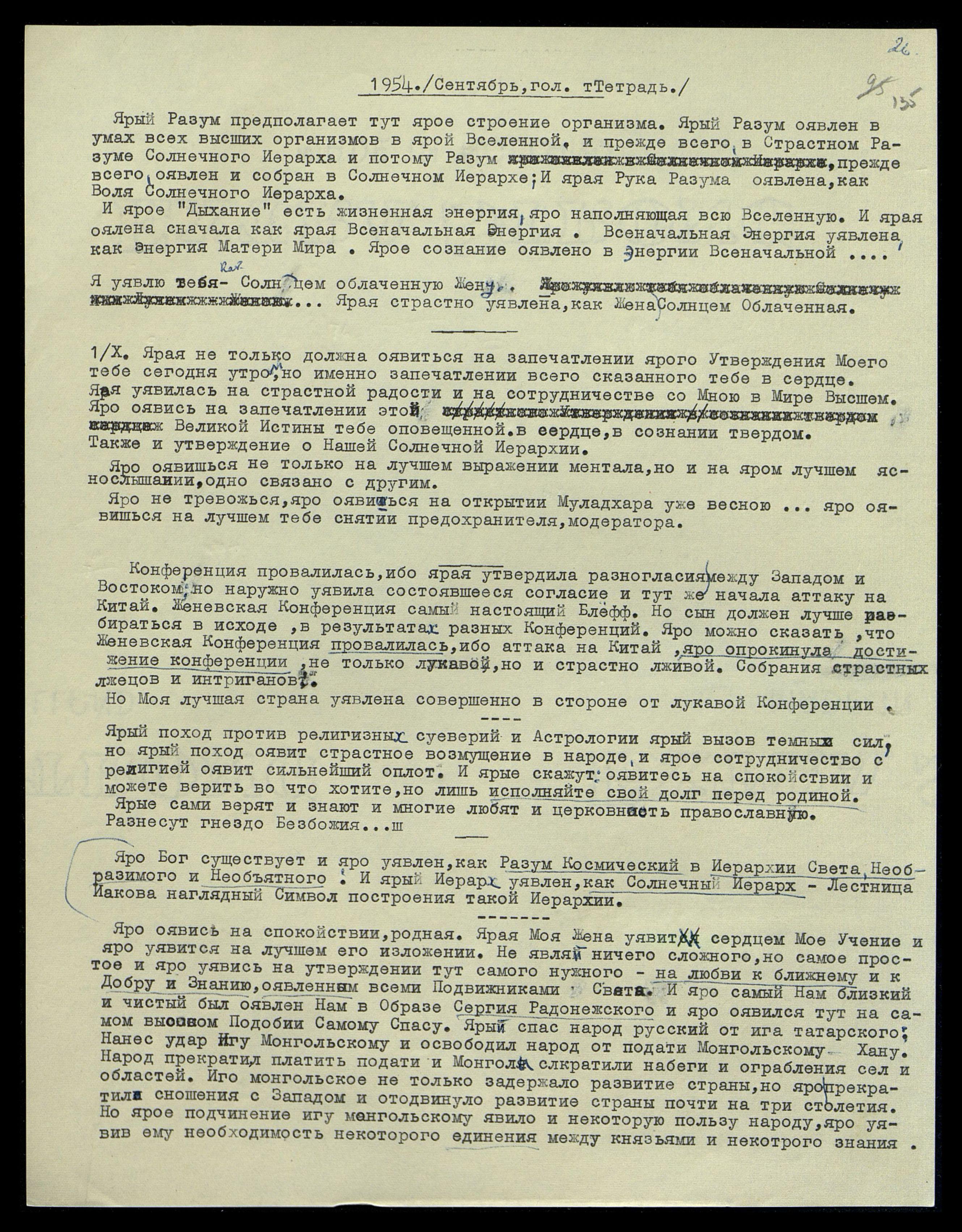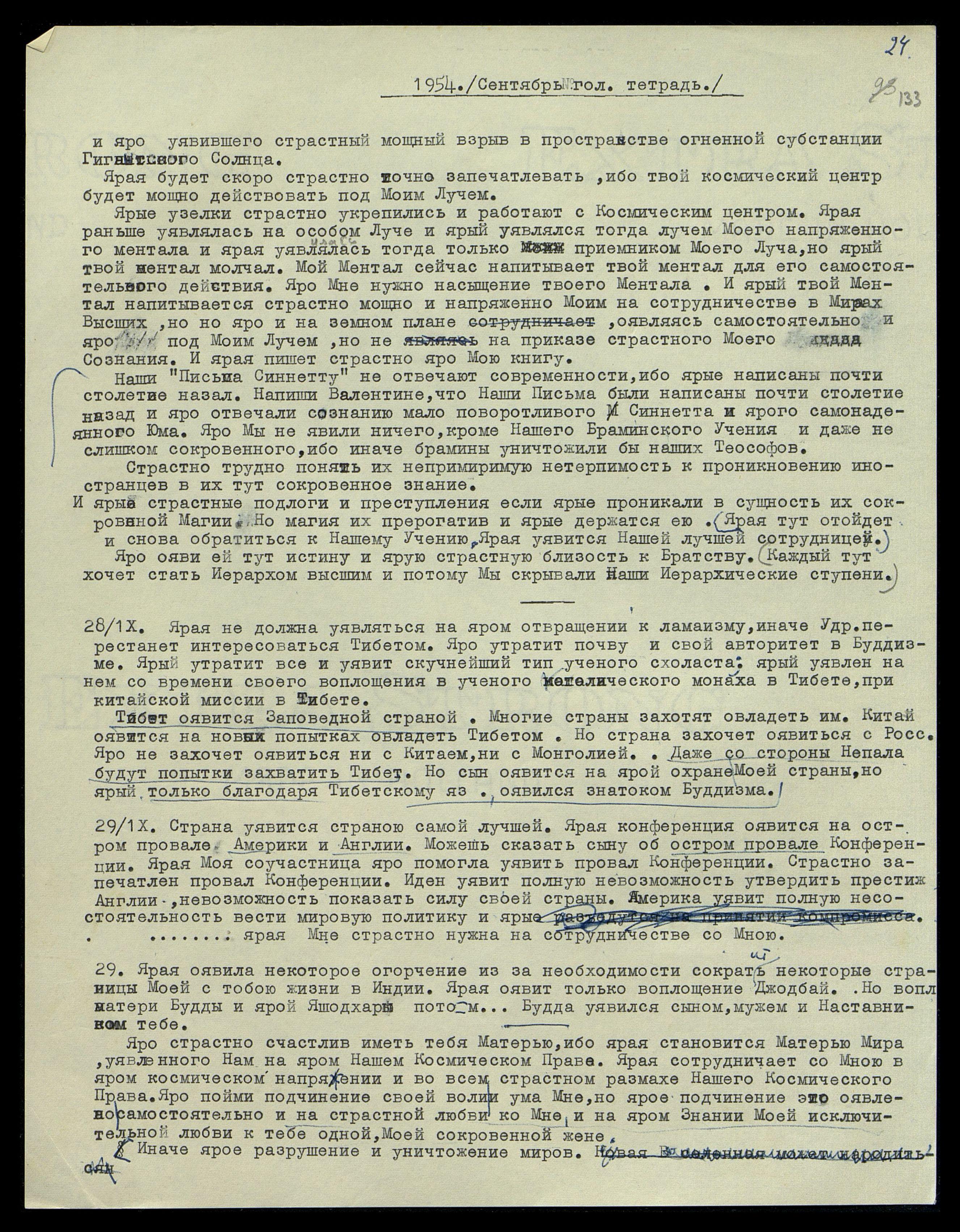 28/IX. Ярая не должна уявляться на яром отвращении к ламаизму, иначе Удр[ая] перестанет интересоваться Тибетом. Яро утратит почву и свой авторитет в Буддизме. Ярый утратит все и уявит скучнейший тип ученого-схоласта; ярый уявлен на нём со времени своего воплощения в ученого католического монаха в Тибете, при китайской миссии в Тибете.