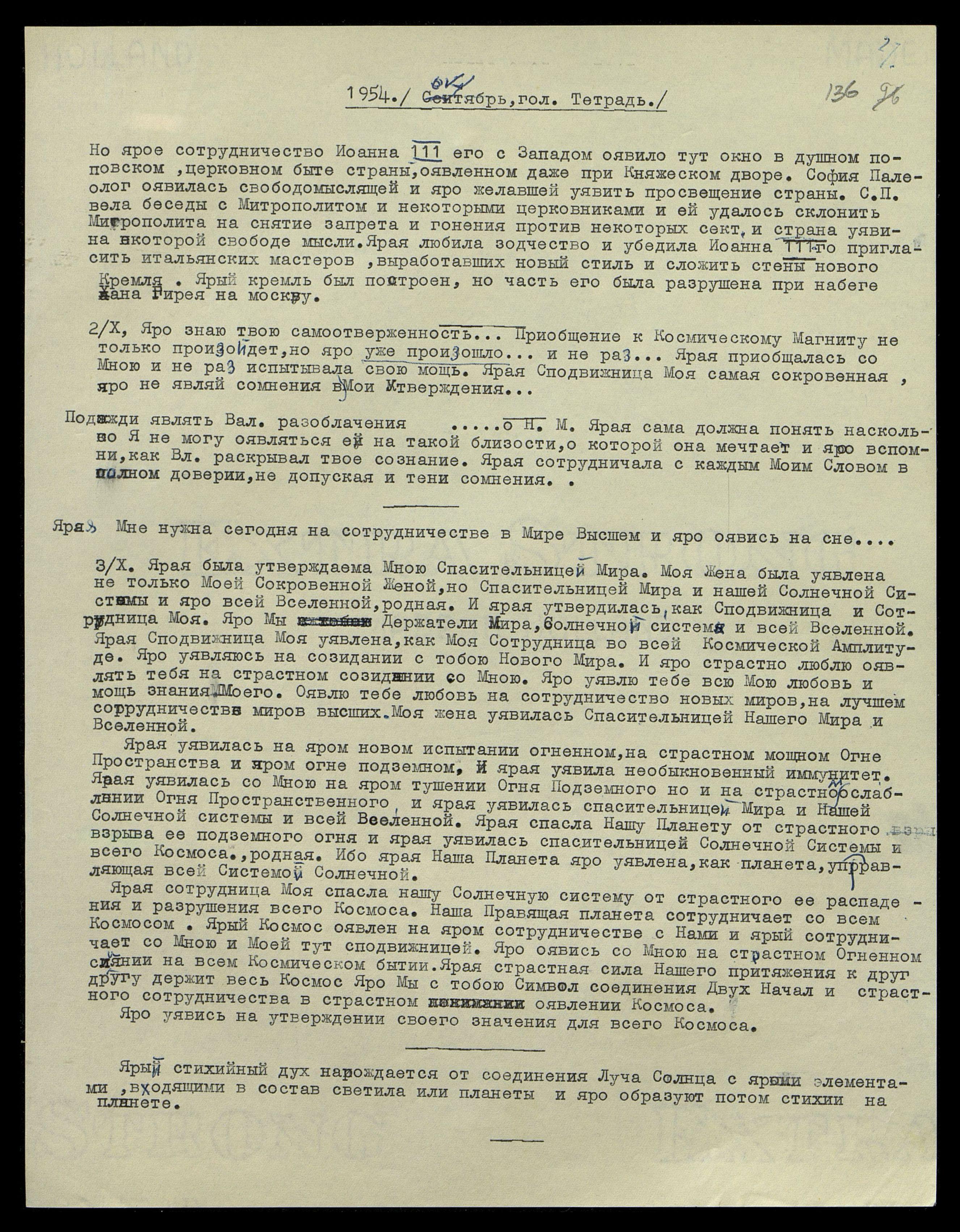 Подожди являть Вал[ентине] разоблачения... о Н[адземном] М[уже]. Ярая сама должна понять, насколько Я не могу оявляться на такой близости, о которой она мечтает и яро вспомни, как Вл[адыка] раскрывал твое сознание. Ярая сотрудничала с каждым Моим Словом в полном доверии, не допуская и тени сомнения.