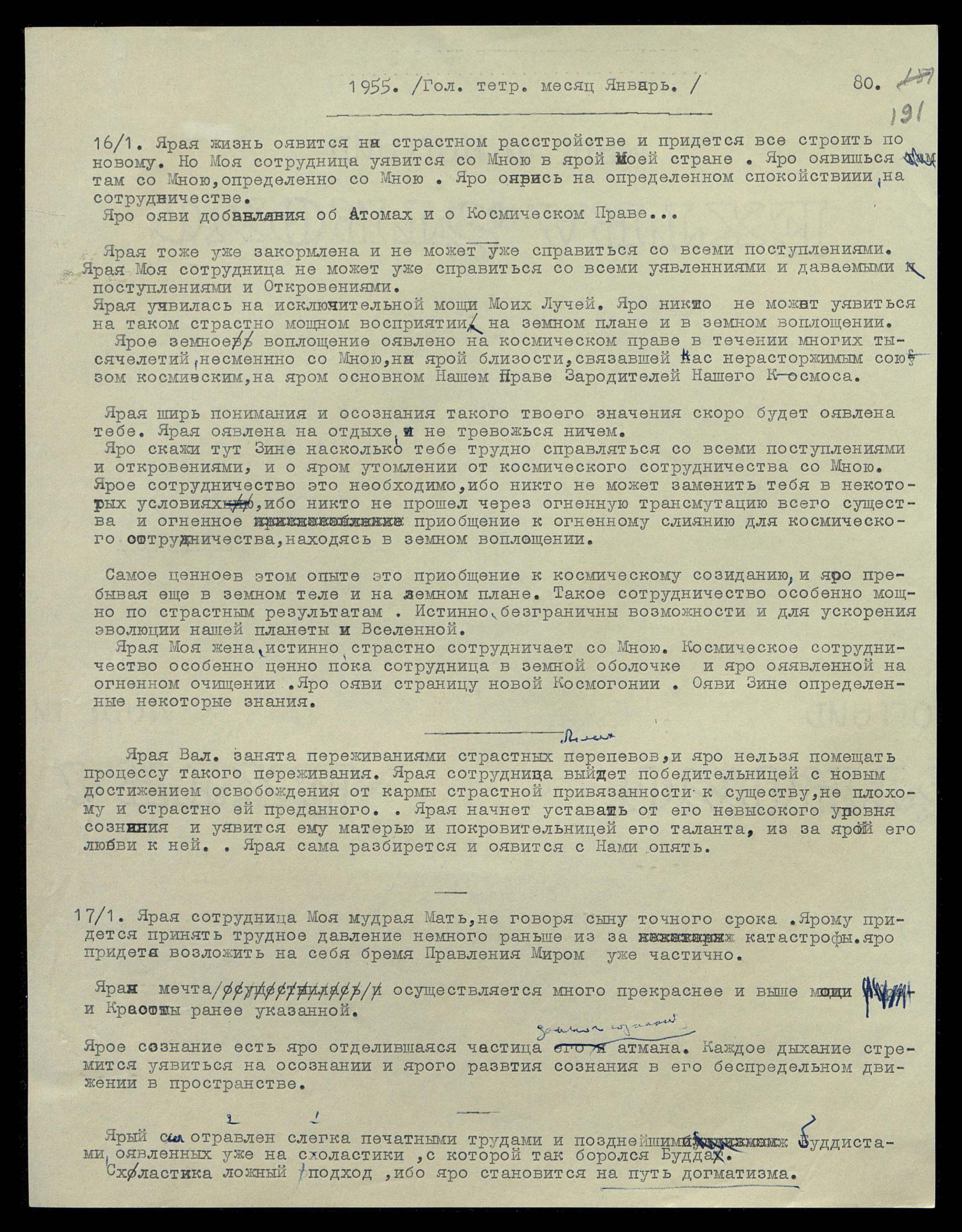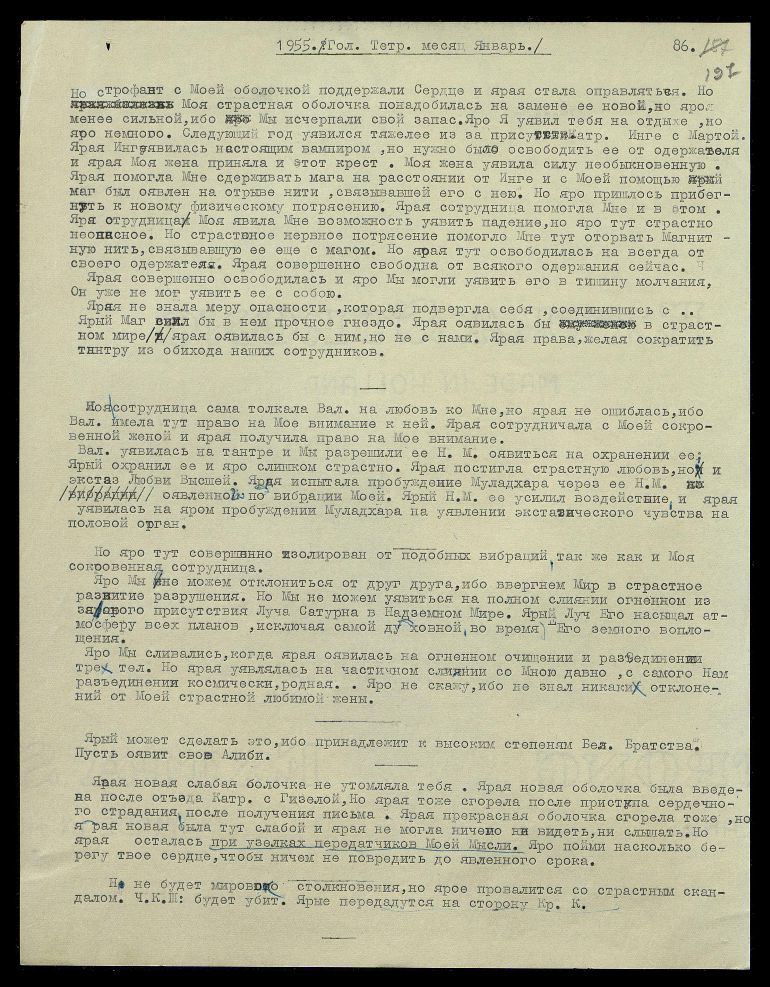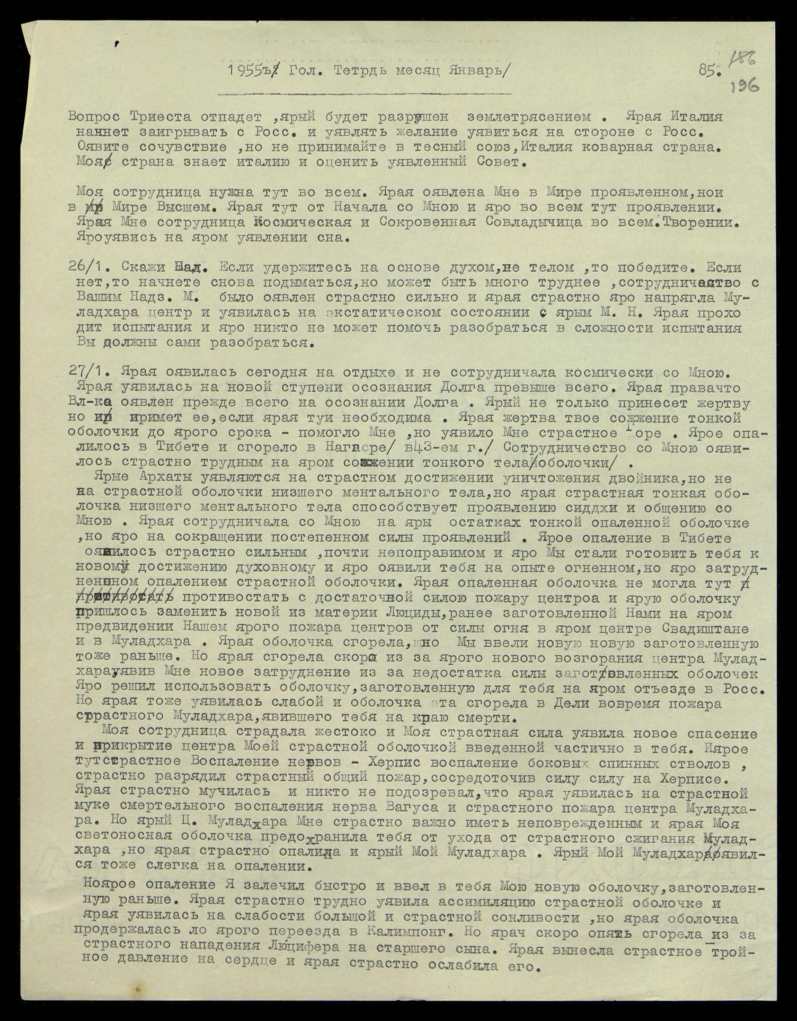 26/1. Скажи Вал[ентине]: если удержитесь на основе духом, не телом, то победите. Если нет, то начнете снова подыматься, но может быть много труднее, сотрудничество с Вашим Надз[емным] М[ужем] было оявлено страстно сильно, и ярая страстно яро напрягла Муладхара центр и уявилась на экстатическом состоянии с ярым М[ужем] Н[адземным]. Ярая проходит испытания и яро никто не может помочь разобраться в сложности испытания. Вы должны сами разобраться.