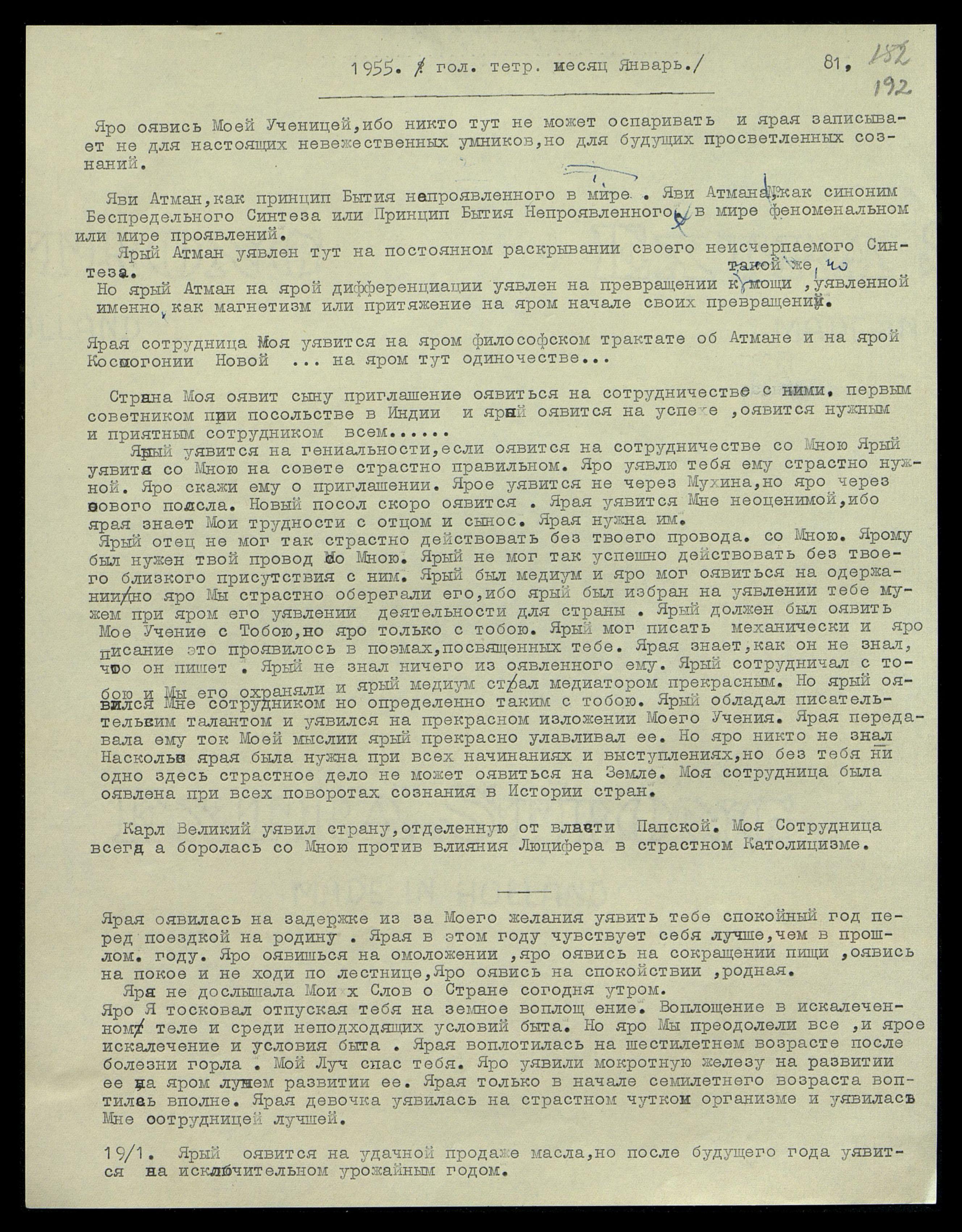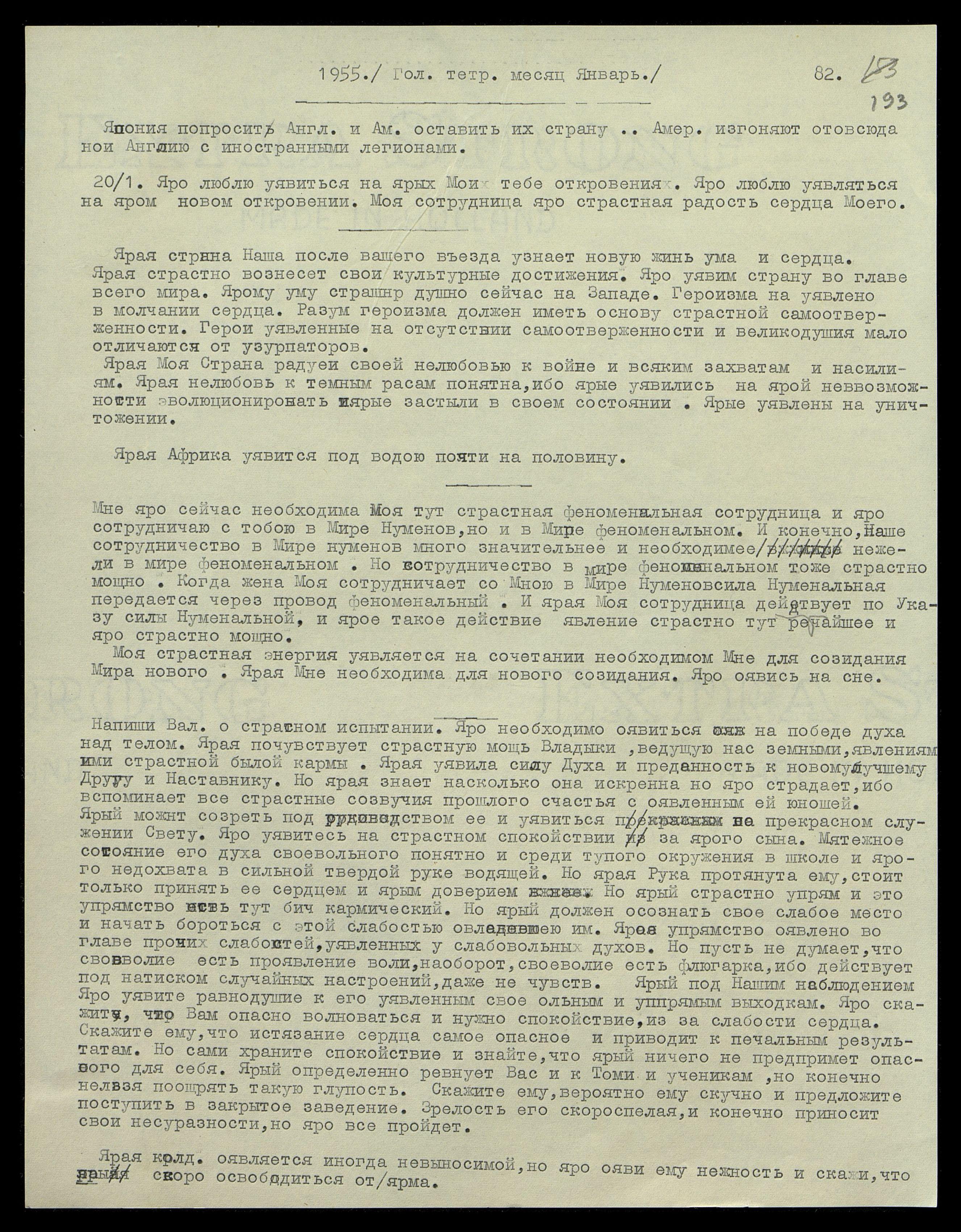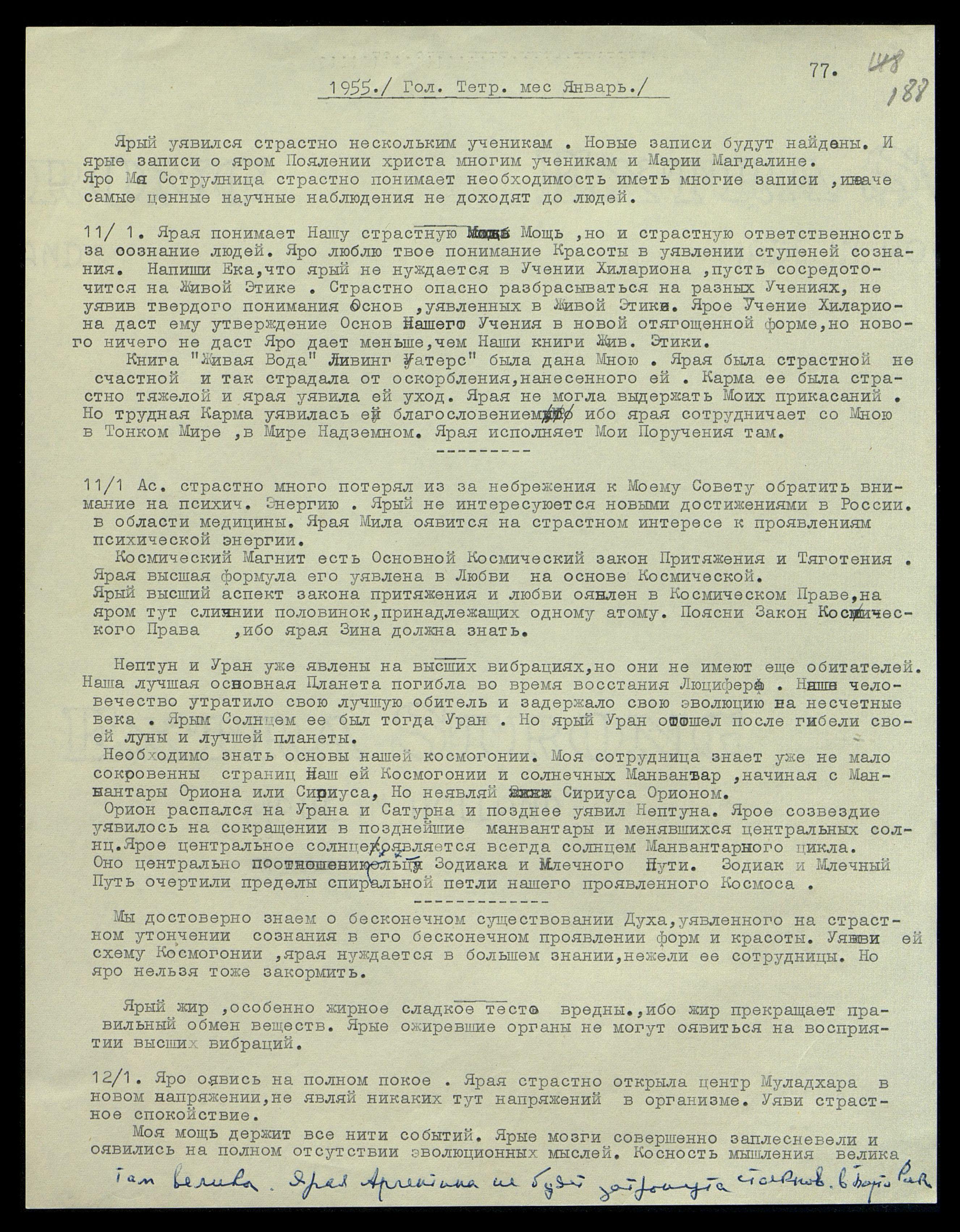26/1. Скажи Вал[ентине]: если удержитесь на основе духом, не телом, то победите. Если нет, то начнете снова подыматься, но может быть много труднее, сотрудничество с Вашим Надз[емным] М[ужем] было оявлено страстно сильно, и ярая страстно яро напрягла Муладхара центр и уявилась на экстатическом состоянии с ярым М[ужем] Н[адземным]. Ярая проходит испытания и яро никто не может помочь разобраться в сложности испытания. Вы должны сами разобраться.