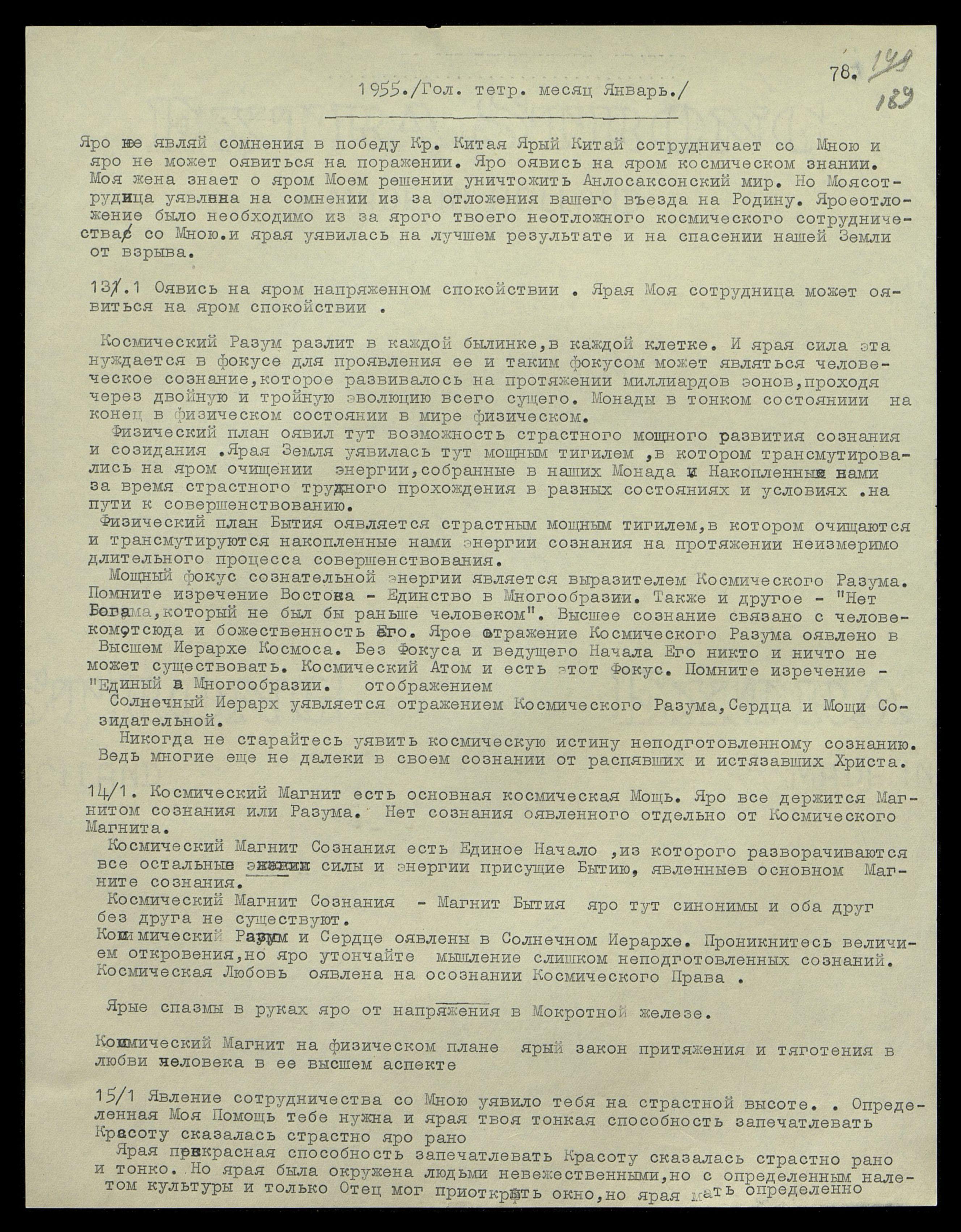 Срок [19]41 и [19]47 оявлены значительными сроками в нашей жизни, но срок [19]49-ый оявлен как срок Космический − ярое поражение Врага с его твердыней Зла в окт[ябре] 19-го. И Моя сотрудница уявилась тогда на ярой опасности ухода, ибо ярый Враг собрал всю силу своего луча, чтобы уничтожить Мою сотрудницу. Но ярая Моя Сотрудница уявилась Мне настоящей сотрудницей и помогла Мне уничтожить Врага. Ярый не мог уничтожить тебя, ибо Мой Огненный панцирь окутал тебя и оявился непреодолимым, страстно непреодолимым.