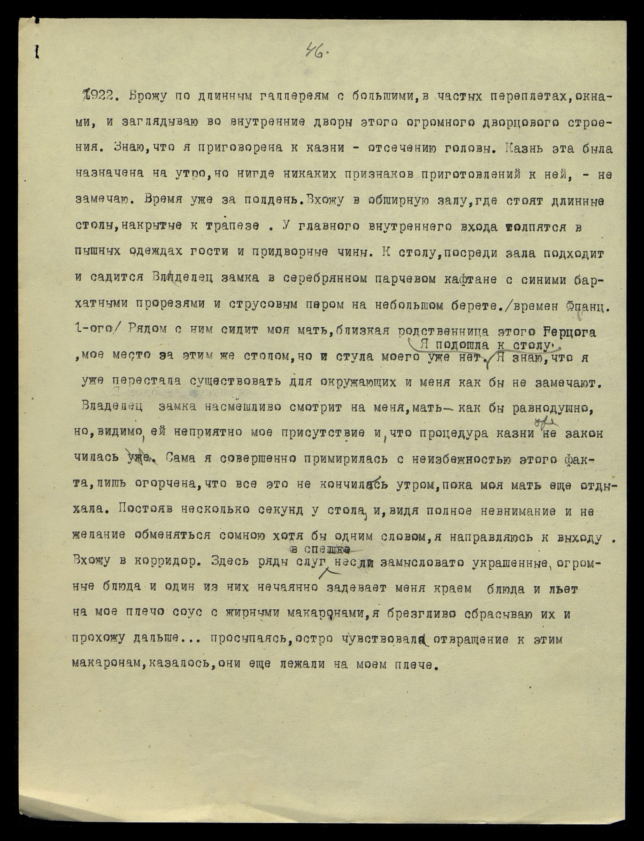 1922. Брожу по длинным галереям с большими в частых переплетах окнами и заглядываю во внутренние дворы этого огромного дворцового строения. Знаю, что я приговорена к казни - отсечению головы. Казнь эта была назначена на утро, но нигде никаких признаков приготовления к ней не замечаю. Время уже за полдень. Вхожу в обширную залу, где стоят длинные столы, накрытые к трапезе. У главного внутреннего входа толпятся в пышных одеждах гости и придворные чины. К столу посреди зала подходит и садится Владелец замка в серебряном парчовом кафтане с синими бархатными прорезями и страусовым пером на небольшом берете (времен Франциска I). Рядом с ним сидит моя мать, близкая родственница этого Герцога, мое место за этим же столом, но и стула моего уже нет. Я подошла к столу. Я знаю, что я уже перестала существовать для окружающих, и меня как бы не замечают. Владелец замка насмешливо смотрит на меня, мать - как бы равнодушно, но, видимо, ей неприятно мое присутствие и что процедура казни еще не закончилась. Сама я совершенно примирилась с неизбежностью этого факта, лишь огорчена, что все это не кончилось утром, пока моя мать еще отдыхала. Постояв несколько секунд у стола и видя полное невнимание и нежелание обменяться со мною хотя бы одним словом, я направляюсь к выходу. Вхожу в коридор. Здесь ряды слуг в спешке несли замысловато украшенные огромные блюда, и один из них нечаянно задевает меня краем блюда и льет на мое плечо соус с жирными макаронами, я брезгливо сбрасываю их и прохожу дальше... Просыпаясь, остро чувствовала отвращение к этим макаронам, казалось, они еще лежали на моем плече.