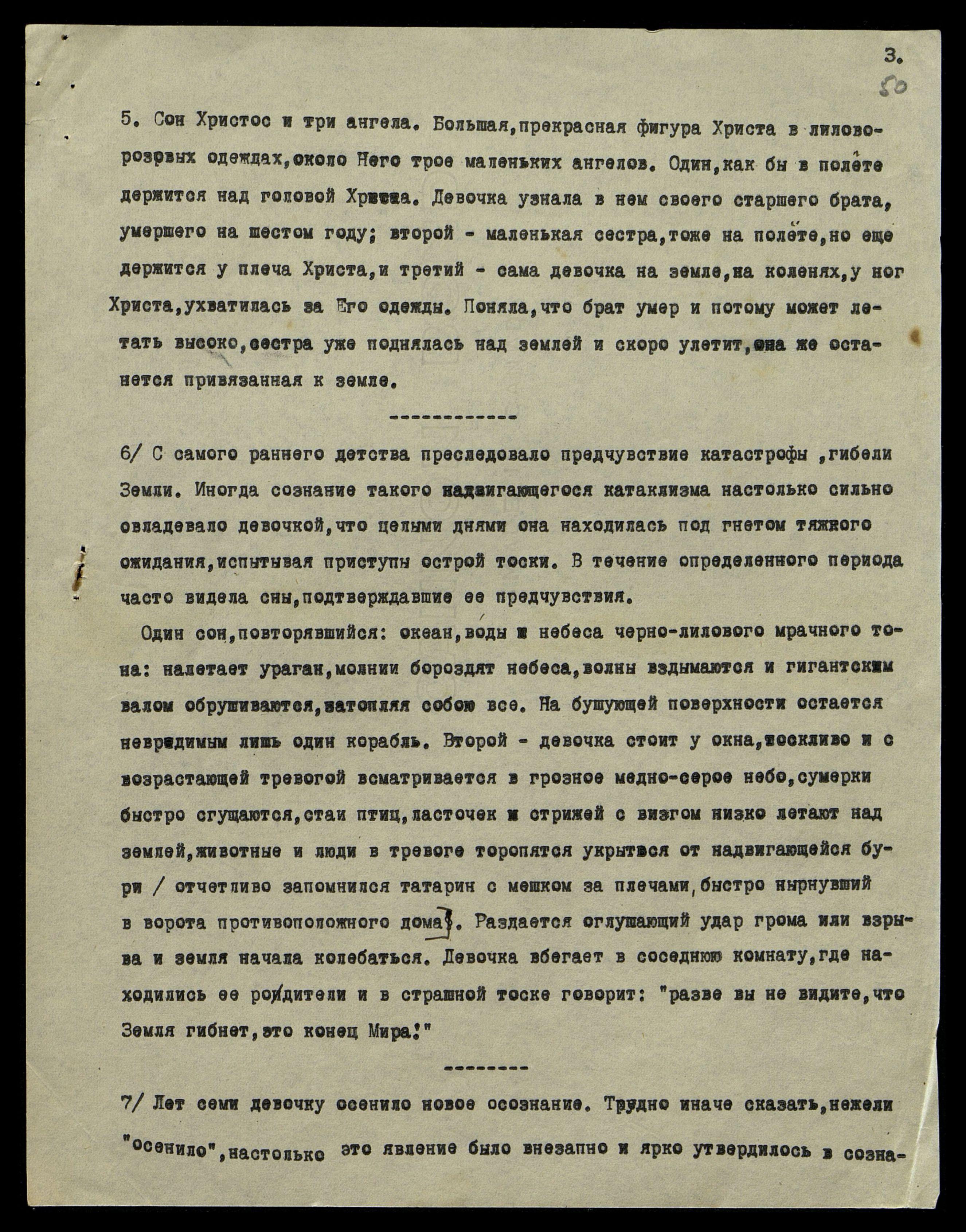 6. С самого раннего детства преследовало предчувствие катастрофы, гибели Земли. Иногда сознание такого надвигающегося катаклизма настолько сильно овладевало девочкой, что целыми днями она находилась под гнетом тяжкого ожидания, испытывая приступы острой тоски. В течение определенного периода часто видела сны, подтверждавшие ее предчувствия.