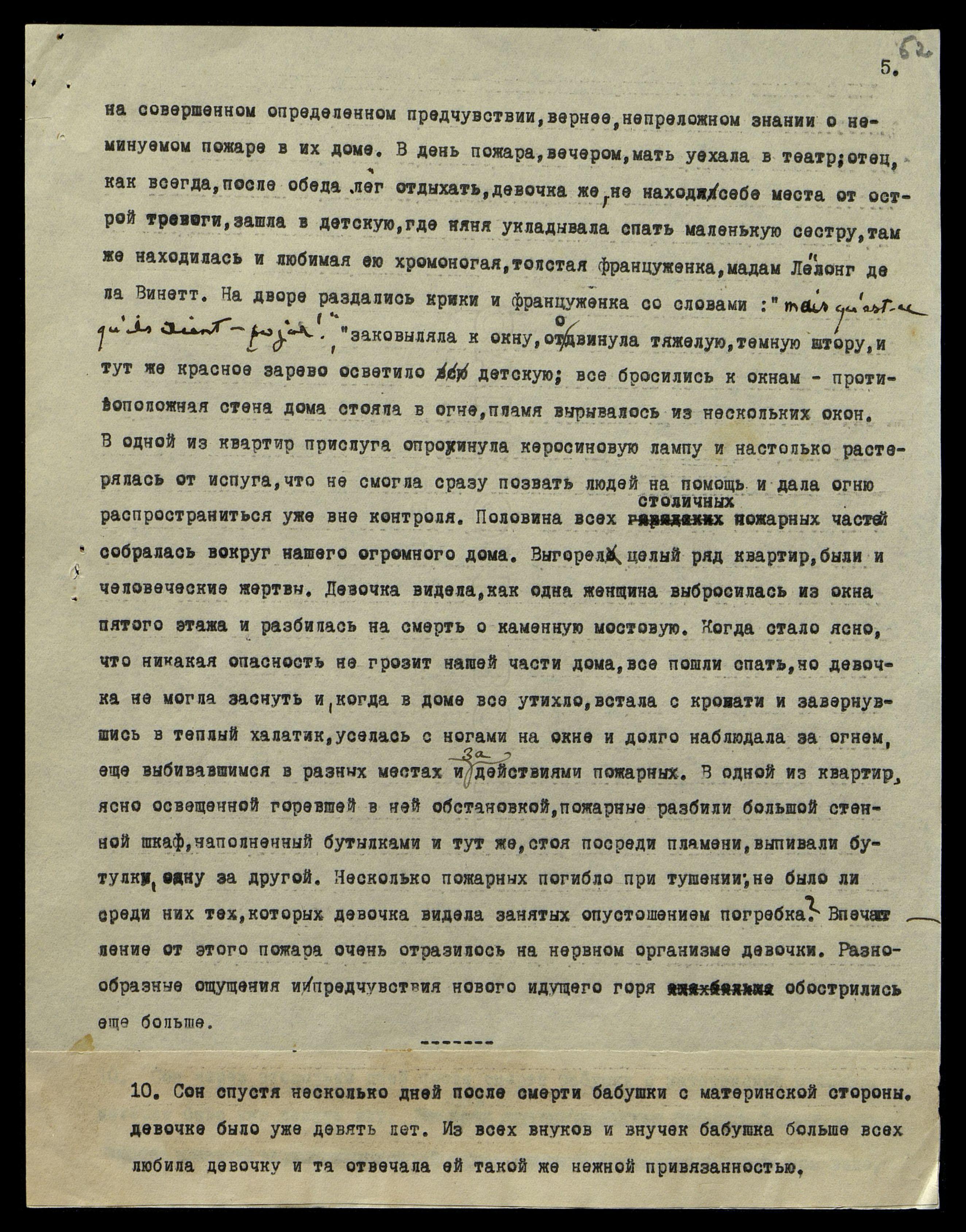 на совершенном определенном предчувствии, вернее, непреложном знании о неминуемом пожаре в их доме. В день пожара, вечером, мать уехала в театр, отец, как всегда, после обеда лег отдыхать, девочка же не находила себе места от острой тревоги, зашла в детскую, где няня укладывала спать маленькую сестру, там же находилась и любимая ею хромоногая, толстая француженка, мадам Лёлонг де ла Винетт. На дворе раздались крики и француженка со словами "[несколько слов на французском неразборчивы]", заковыляла к окну, отодвинула тяжелую, темную штору, и тут же красное зарево осветило всю детскую, все бросились к окнам − противоположная стена дома стояла в огне, пламя вырывалось из нескольких окон. В одной из квартир прислуга опрокинула керосиновую лампу и настолько растерялась от испуга, что не смогла сразу позвать людей на помощь и дала огню распространиться уже вне контроля. Половина всех столичных пожарных частей собралась вокруг нашего огромного дома. Выгорел целый ряд квартир, были и человеческие жертвы. Девочка видела, как одна женщина выбросилась из окна пятого этажа и разбилась на смерть о каменную мостовую. Когда стало ясно, что никакая опасность не грозит нашей части дома, все пошли спать, но девочка не могла заснуть и, когда в доме все утихло, встала с кровати и завернувшись в теплый халатик, уселась с ногами на окне и долго наблюдала за огнем, еще выбивавшимся в разных местах и за действиями пожарных. В одной из квартир ясно освещенной горевшей в ней обстановкой, пожарные разбили большой стенной шкаф, наполненный бутылками и тут же, стоя посреди пламени, выпивали бутылку одну за другой. Несколько пожарных погибло при тушении, не было ли среди них тех, которых девочка видела занятых опустошением погребка. Впечатление от этого пожара очень отразилось на нервном организме девочки. Разнообразные ощущения и предчувствия нового идущего горя обострились еще больше.