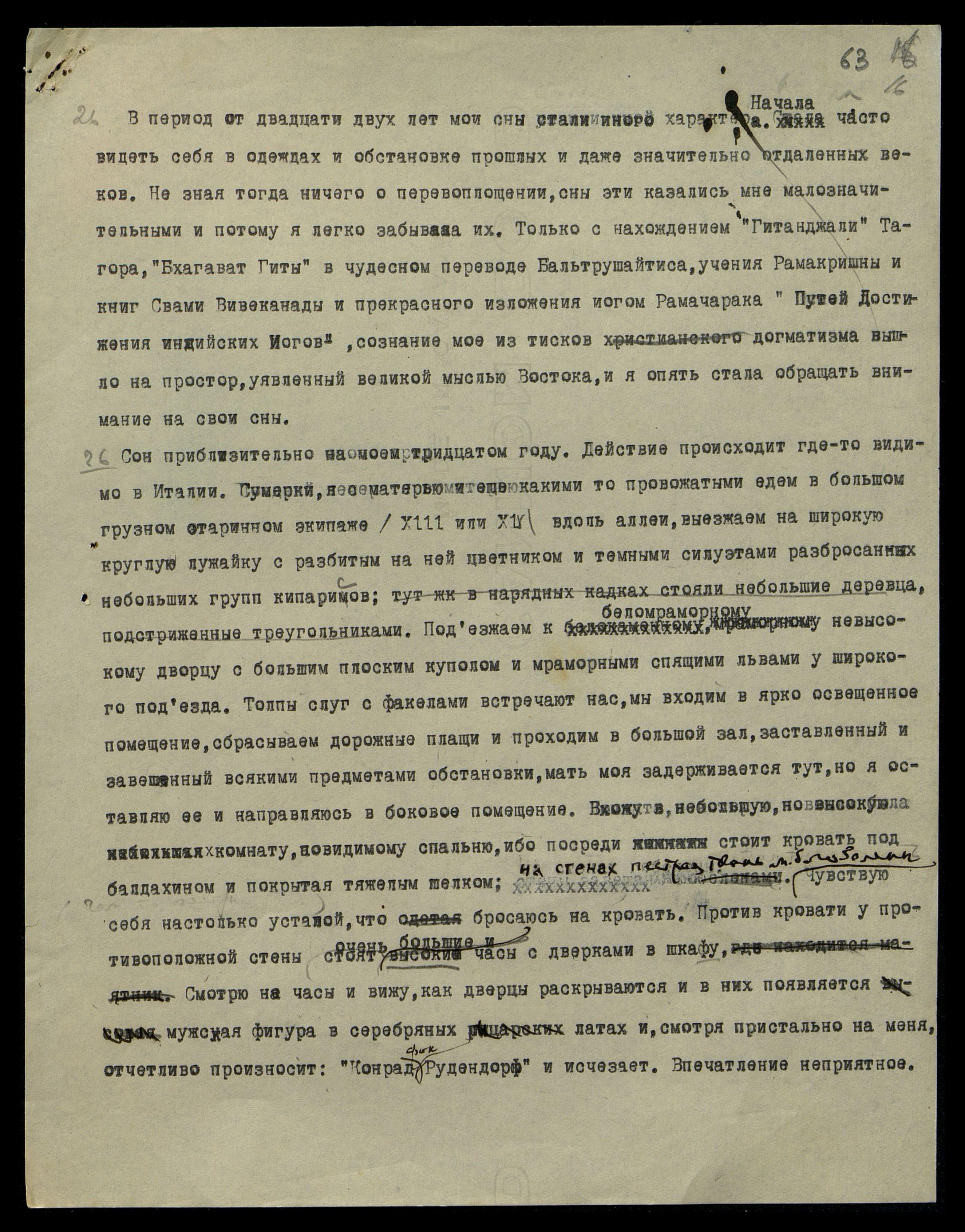 Сон приблизительно на моём тридцатом году. Действие происходит где-то видимо в Италии. Сумерки, я с матерью и еще какими-то провожатыми едем в большом грузном старинном экипаже XIII-XIV [веков] вдоль аллеи, выезжаем на широкую круглую лужайку с разбитым на ней цветником и темными силуэтами разбросанных небольших групп кипарисов; тут же в нарядных кадках стояли небольшие деревца, подстриженные треугольниками. Подъезжаем к беломраморному невысокому дворцу с большим плоским куполом и мраморными спящими львами у широкого подъезда. Толпы слуг с факелами встречают нас, мы входим в ярко освещенное помещение, сбрасываем дорожные плащи и проходим в большой зал, заставленный и завешанный всякими предметами обстановки, мать моя задерживается тут, но я оставляю ее и направляюсь в боковое помещение. Вхожу в небольшую, но высокую комнату, по-видимому спальню, ибо посреди комнаты стоит кровать под балдахином и покрытая тяжелым шелком, на стенах пёстрая ткань, может быть, гобелены. Чувствую себя настолько усталой, что бросаюсь на кровать. Против кровати у противоположной стены стоят очень большие и высокие часы с дверками в шкафу. Смотрю на часы и вижу, как дверцы раскрываются и в них появляется мужская фигура в серебряных латах и, смотря пристально на меня, отчетливо произносит: "Конрад фон Рудендорф," − и исчезает. Впечатление неприятное.