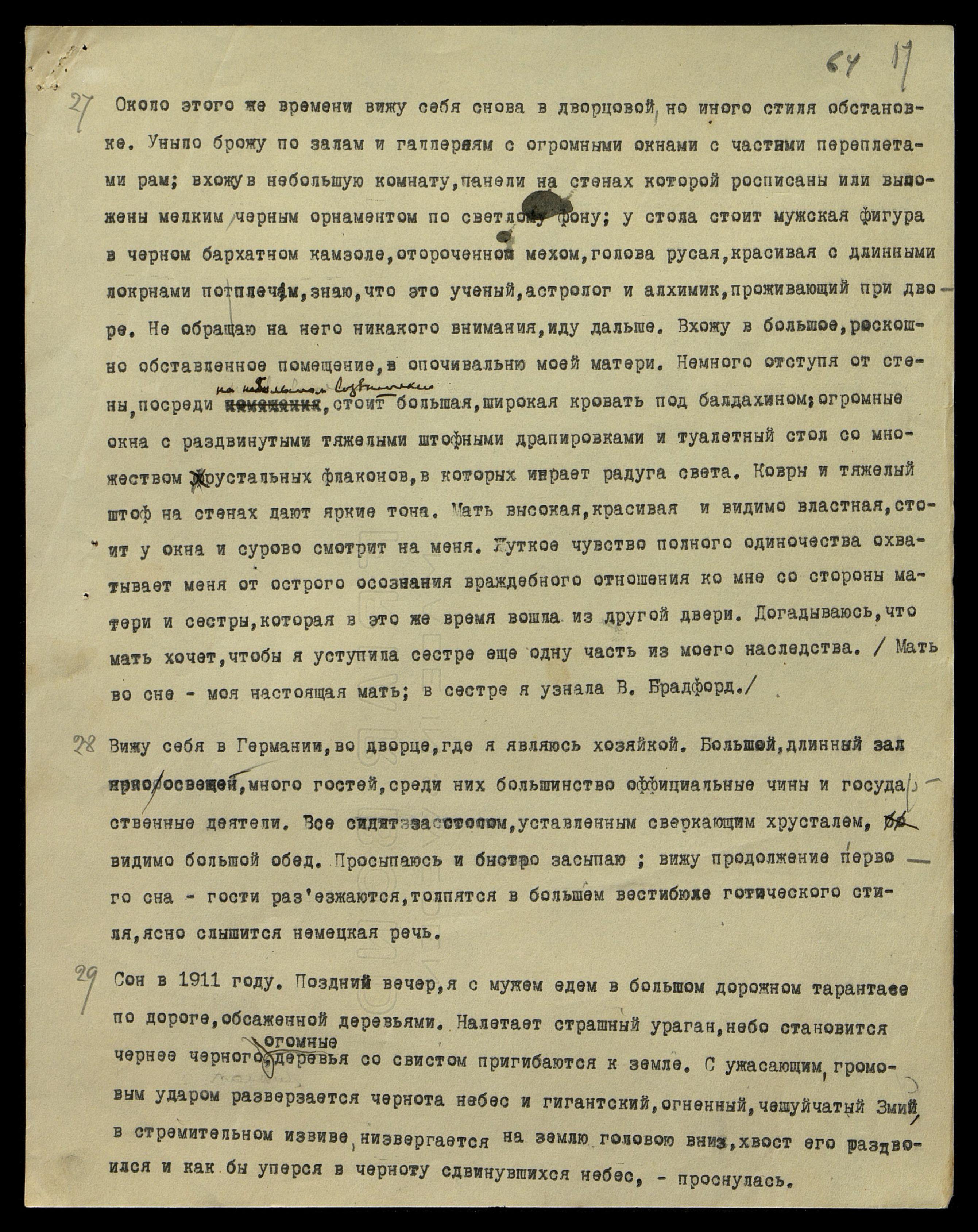 29. Сон в 1911 году. Поздний вечер, я с мужем, едем в большом дорожном тарантасе по дороге, обсаженной деревьями. Налетает страшный ураган, небо становится чернее чёрного, огромные деревья со свистом пригибаются к земле. С ужасающим, громовым ударом разверзается чернота небес и гигантский, огненный, чешуйчатый Змий в стремительном извиве, низвергается на землю головою вниз, хвост его раздвоился и как бы уперся в черноту сдвинувшихся небес, − проснулась.