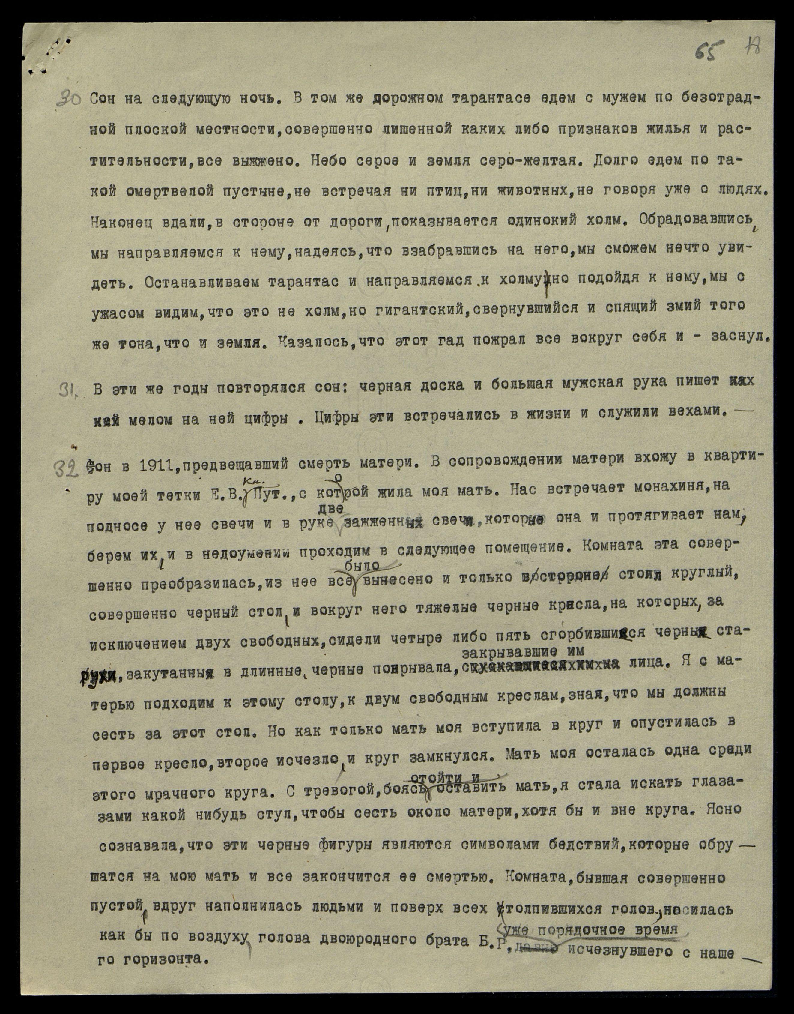 32. Сон в 1911, предвещавший смерть матери. В сопровождении матери вхожу в квартиру моей тетки, кн[ягини] Е.В.Пут[ятиной], с которой жила моя мать. Нас встречает монахиня, на подносе у нее свечи и в руке две зажженных свечи, которые она и протягивает нам, берем их, в недоумении проходим в следующее помещение. Комната эта совершенно преобразилась, из нее все было вынесено и только в стороне стоял круглый, совершенно черный стол, и вокруг него тяжелые черные кресла, на которых, за исключением двух свободных, сидели четыре, либо пять, сгорбившиеся черные старухи, закутанные в длинные, черные покрывала, закрывавшие им лица. Я с матерью подходим к этому столу, к двум свободным креслам, зная, что мы должны сесть за этот стол. Но как только мать моя вступила в круг и опустилась в первое кресло, второе исчезло, и круг замкнулся. Мать моя осталась одна среди этого мрачного круга. С тревогой, боясь отойти и оставить мать, я стала искать глазами какой-нибудь стул, чтобы сесть около матери, хотя бы и вне круга. Ясно сознавала, что эти черные фигуры являются символами бедствий, которые обрушатся на мою мать и все закончится ее смертью. Комната, бывшая совершенно пустой, вдруг наполнилась людьми и поверх всех столпившихся голов, носилась как бы по воздуху голова двоюродного брата Б.Р., уже порядочное время исчезнувшего с нашего горизонта.