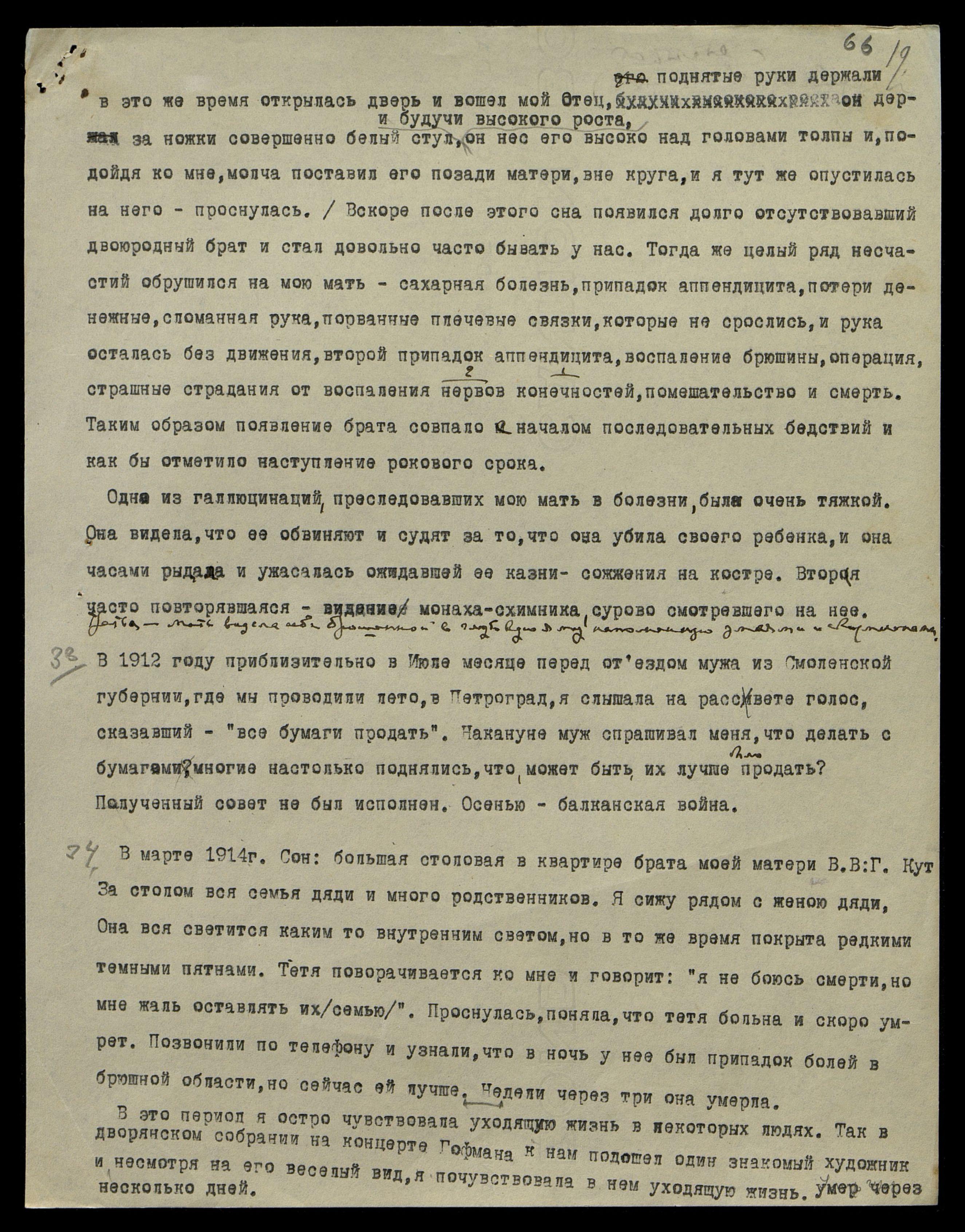 33. В 1912 году приблизительно в июле месяце перед отъездом мужа из Смоленской губернии, где мы проводили лето, в Петроград, я слышала на рассвете голос, сказавший: "Все бумаги продать". Накануне муж спрашивал меня, что делать с бумагами, многие настолько поднялись, что, может быть, их лучше было продать? Полученный совет не был исполнен. Осенью − балканская война.