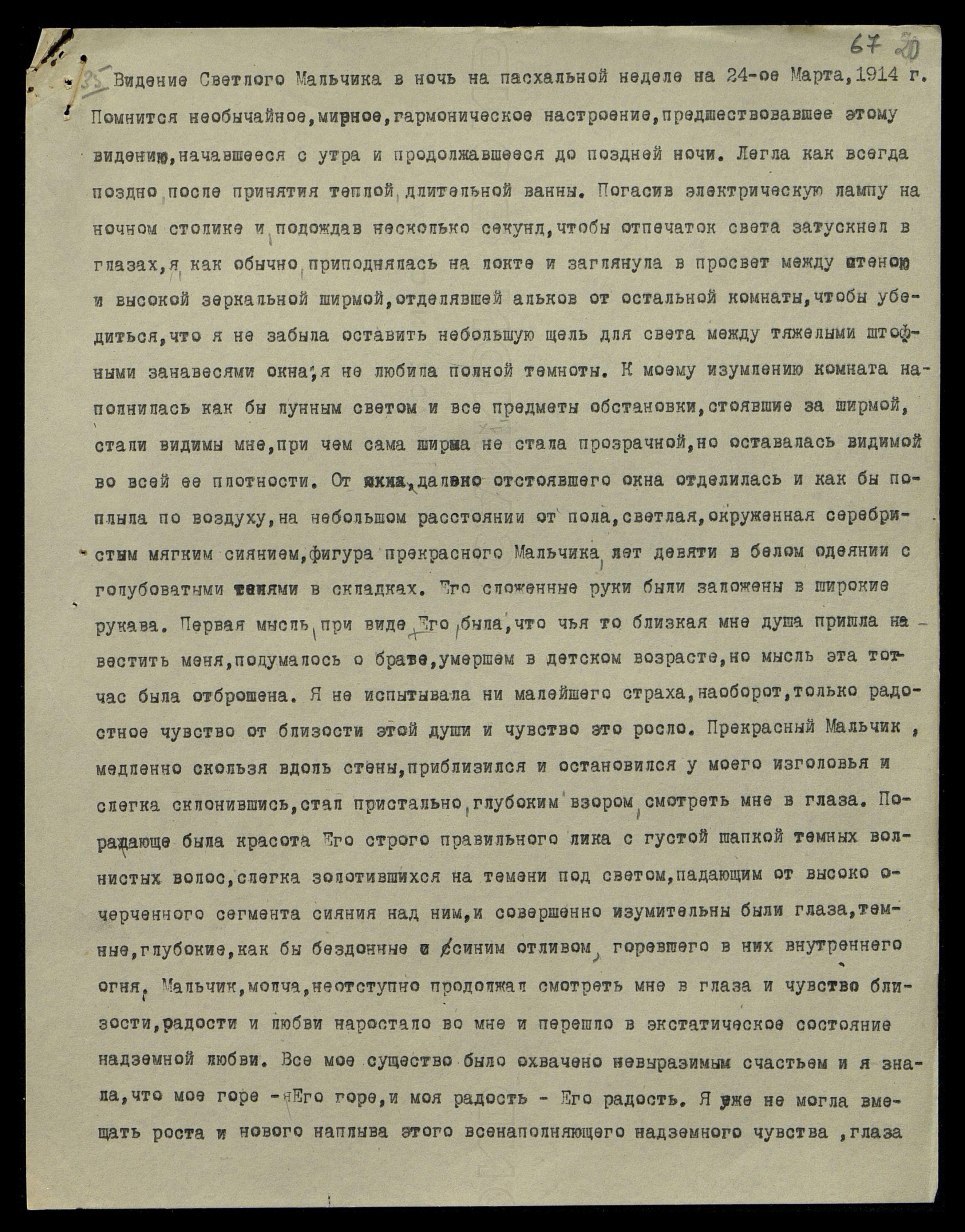35. Видение Светлого Мальчика в ночь на пасхальной неделе на 24-ое марта, 1914 г. Помнится необычайное, мирное, гармоническое настроение, предшествовавшее этому видению, начавшееся с утра и продолжавшееся до поздней ночи. Легла как всегда поздно после принятия теплой длительной ванны. Погасив электрическую лампу на ночном столике и, подождав несколько секунд, чтобы отпечаток света затускнел в глазах, я как обычно, приподнялась на локте и заглянула в просвет между стеною и высокой зеркальной ширмой, отделявшей альков от остальной комнаты, чтобы убедиться, что я не забыла оставить небольшую щель для света между тяжелыми штофными занавесями окна, я не любила полной темноты. К моему изумлению комната наполнилась как бы лунным светом и все предметы обстановки, стоявшие за ширмой, стали видимы мне, при чем сама ширма не стала прозрачной, но оставалась видимой во всей ее плотности. От окна, далеко отстоявшего окна отделилась и как бы поплыла по воздуху, на небольшом расстоянии от пола, светлая, окруженная серебристым мягким сиянием, фигура прекрасного Мальчика, лет девяти в белом одеянии с голубоватыми тенями в складках. Его сложенные руки были заложены в широкие рукава. Первая мысль при виде Его была, что чья-то близкая мне душа пришла навестить меня, подумалось о брате, умершем в детском возрасте, но мысль эта тотчас была отброшена. Я не испытывала ни малейшего страха, наоборот, только радостное чувство от близости этой души и чувство это росло. Прекрасный Мальчик, медленно скользя вдоль стены, приблизился и остановился у моего изголовья и слегка склонившись, стал пристально, глубоким взором смотреть мне в глаза. Поражающе была красота Его строго правильного лика с густой шапкой темных волнистых волос, слегка золотившихся на темени под светом, падающим от высоко очерченного сегмента сияния над ним, и совершенно изумительны были глаза, темные, глубокие, как бы бездонные с синим отливом, горевшего в них внутреннего огня. Мальчик молча, неотступно продолжал смотреть мне в глаза и чувство близости, радости и любви нарастало во мне и перешло в экстатическое состояние надземной любви. Все мое существо было охвачено невыразимым счастьем и я знала, что мое горе − Его горе, и моя радость − Его радость. Я уже не могла вмещать роста и нового наплыва этого всенаполняющего надземного чувства, глаза