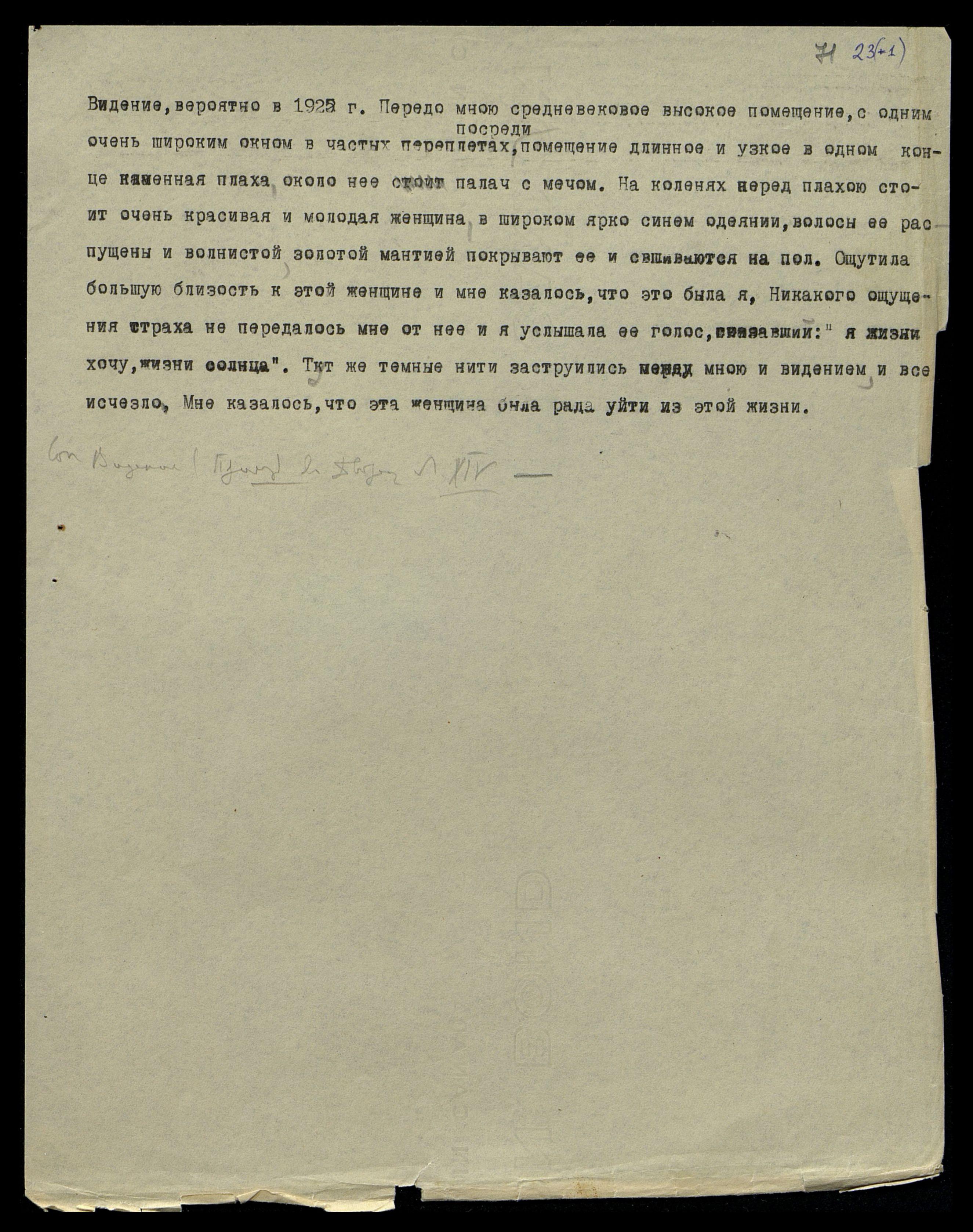 Видение, вероятно в 1925 г. Передо мною средневековое высокое помещение, с одним очень широким окном в частых переплетах посреди, помещение длинное и узкое, в одном конце каменная плаха, около нее стоит палач с мечом. На коленях перед плахою стоит очень красивая и молодая женщина в широком ярко-синем одеянии, волосы ее распущены и волнистой золотой мантией покрывают ее и свешиваются на пол. Ощутила большую близость к этой женщине и мне казалось, что это была я. Никакого ощущения страха не передалось мне от нее и я услышала ее голос, сказавший: "Я жизни хочу, жизни солнца". Тут же темные нити заструились между мною и видением, и все исчезло. Мне казалось, что эта женщина была рада уйти из этой жизни.