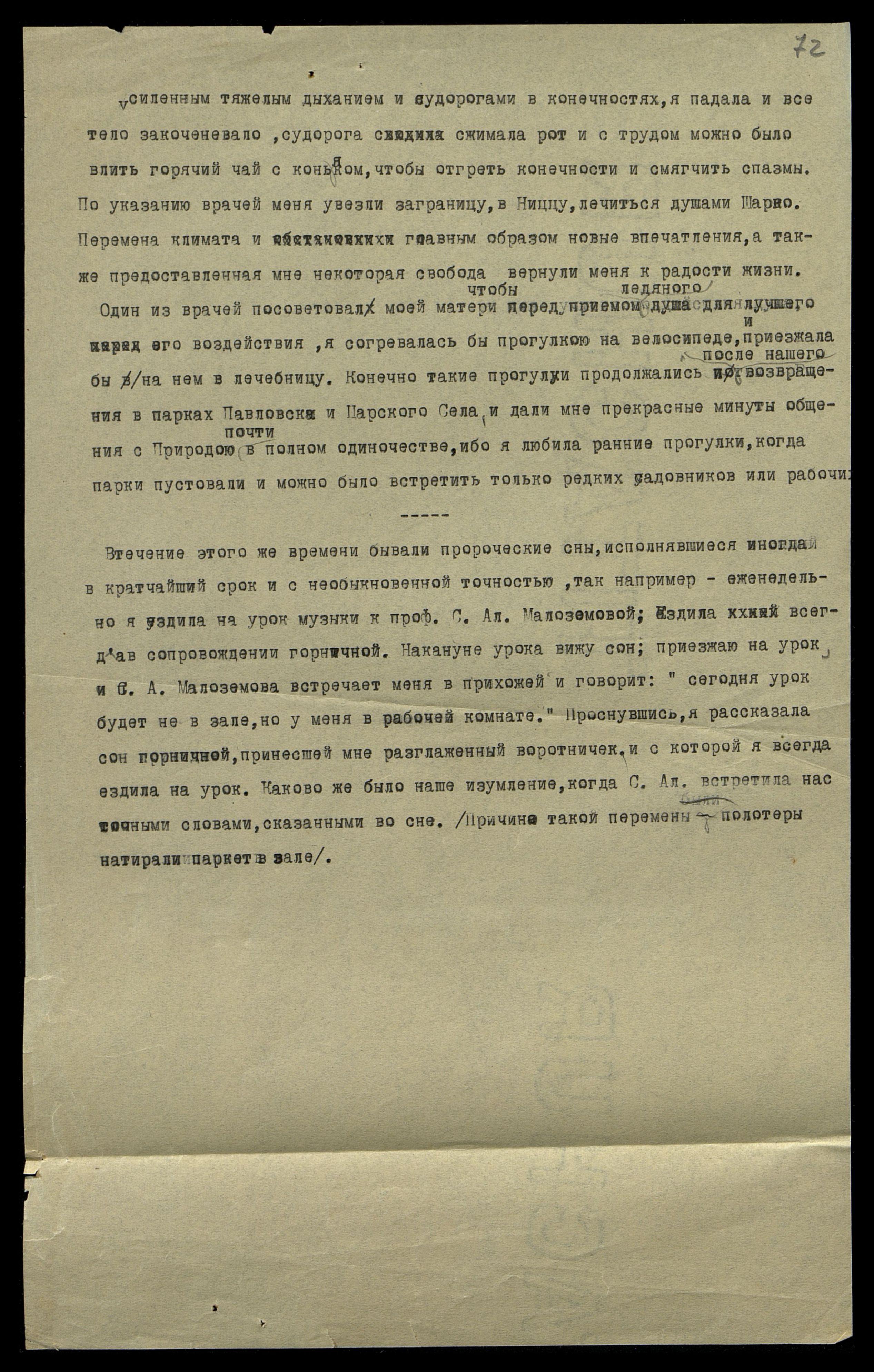В течение этого же времени бывали пророческие сны, исполнявшиеся иногда в кратчайший срок и с необыкновенной точностью, так например, еженедельно я ездила на урок музыки к проф. С.Ал. Малоземовой. Ездила всегда в сопровождении горничной. Накануне урока вижу сон: приезжаю на урок и С.А. Малоземова встречает меня в прихожей, и говорит: "Сегодня урок будет не в зале, но у меня в рабочей комнате." Проснувшись, я рассказала сон горничной, принесшей мне разглаженный воротничок, и с которой я всегда ездила на урок. Каково же было наше изумление, когда С. Ал. встретила нас точными словами, сказанными во сне. (Причина такой перемены − полотеры натирали паркет в зале).