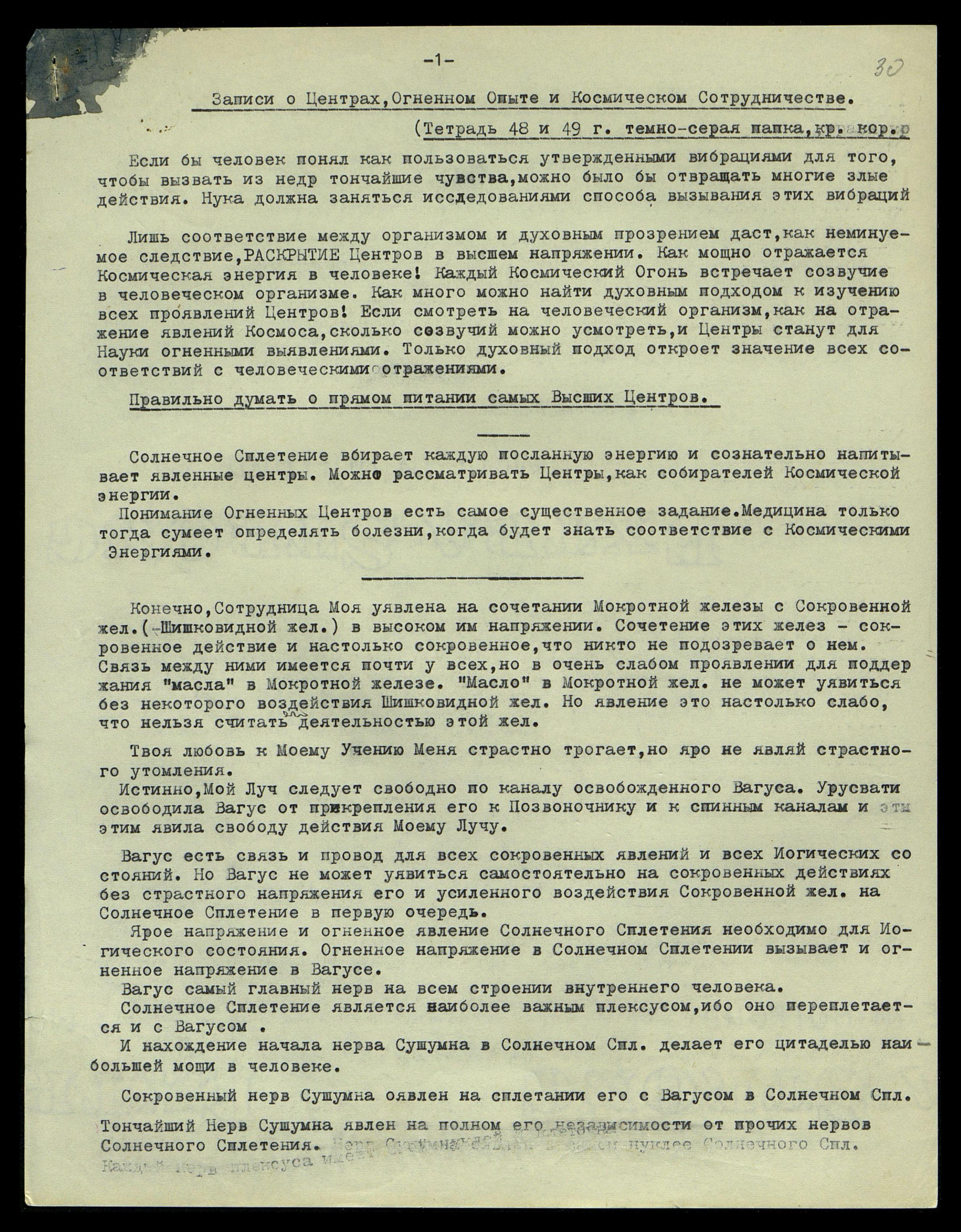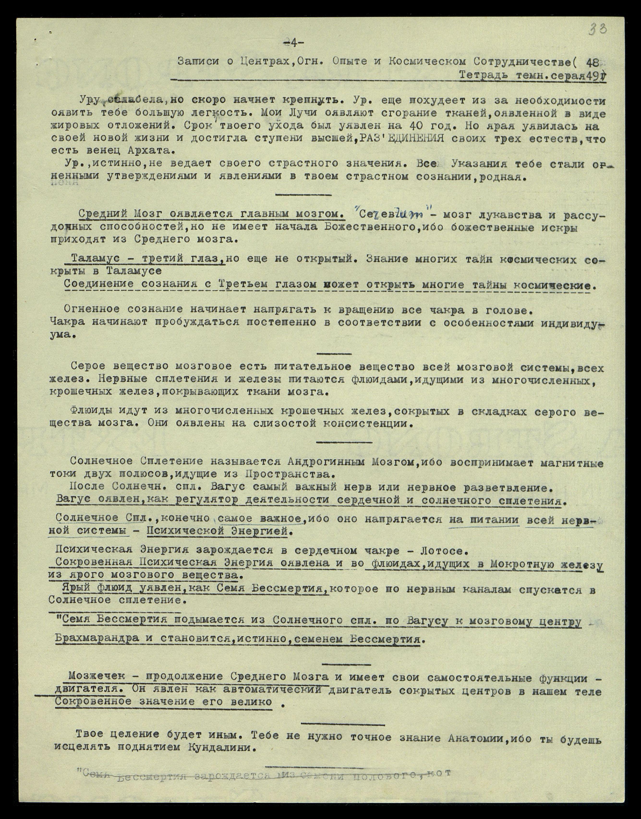 Субстанция, идущая из Мокротной жел[езы] по каналу тончайшей нервной нити, проходит в Солнечное Спл[етение] и яро уявляется, как стимул горения и напряжения Солнечного сплет[ения], и сама она напрягается и становится будущим зерном, или семенем Бессмертия. Но такое семя напрягается до огненного состояния и становится началом процесса "огненного тумо" в Солнечном Сплетении. И такое семя оявляется там на размножении под влиянием огненного процесса, но, также, и от нового притока из Мокротной жел[езы]. Такие семена оявлены, как особая ткань в Солнечном Сплетении. Урусвати видела светящуюся ткань своего Солнечного Сплетения.