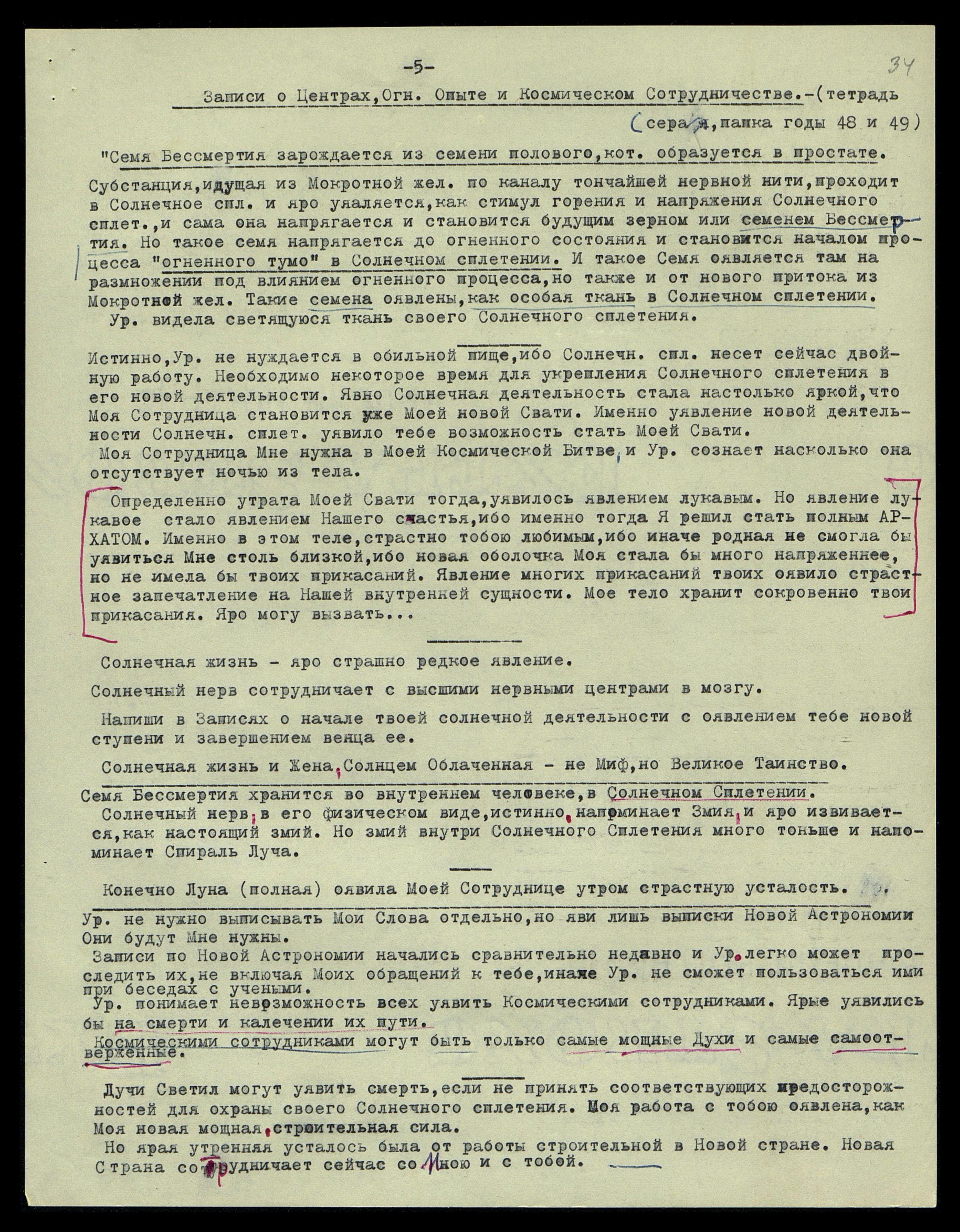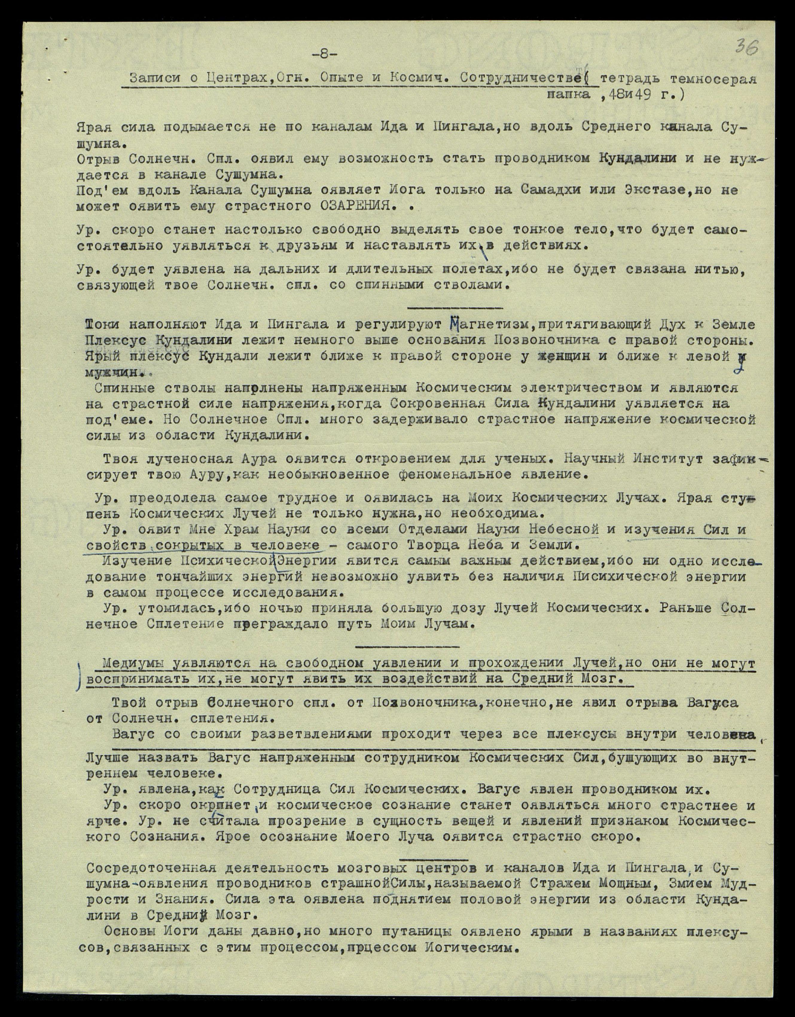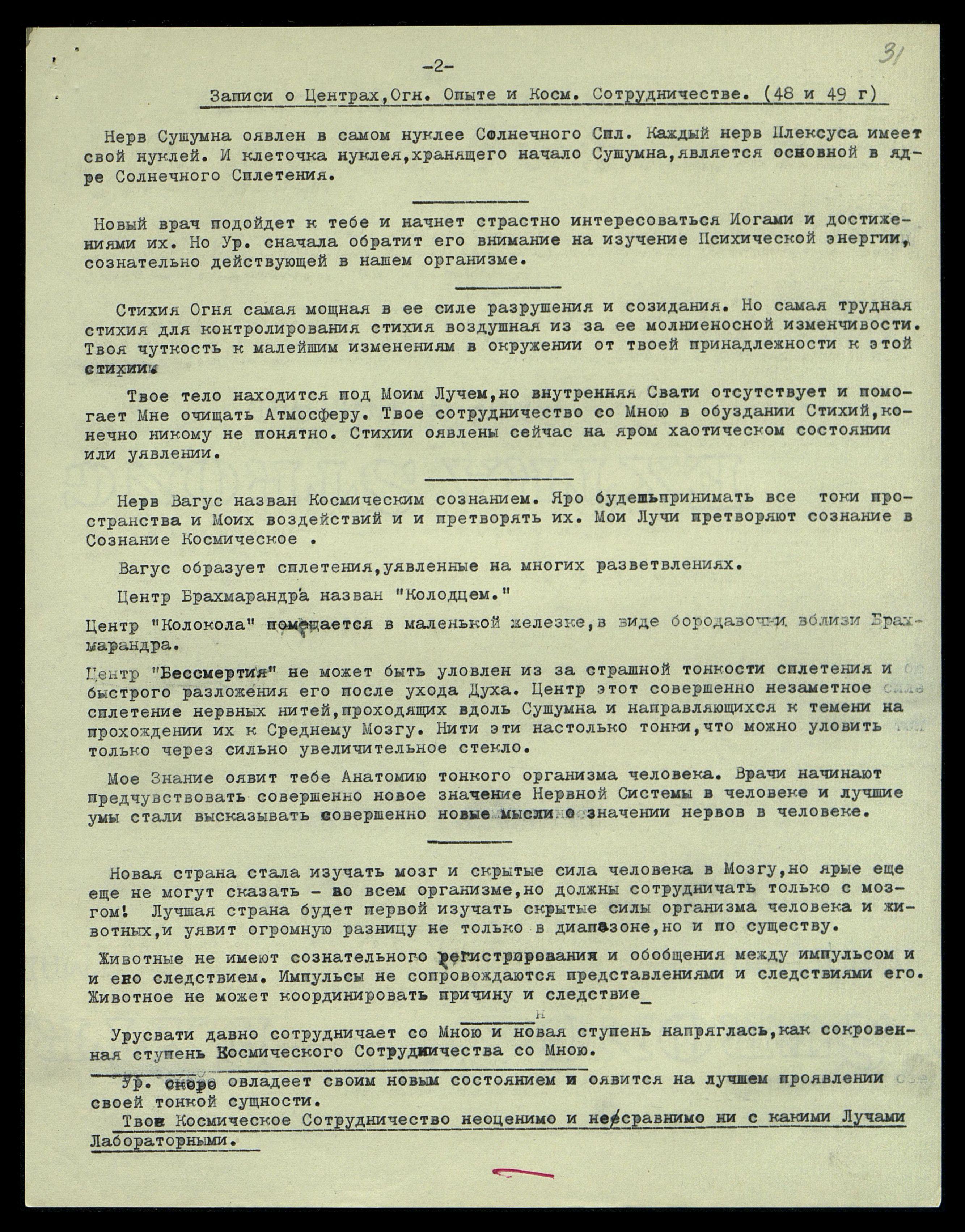 Уже с 1942 года нить, связующая Солнечное Спл[етение] с позвоночником, стала тонка, как паутина, и ярая почти оборвалась на 1945 году, но осталась еще ниточка, но к 1949 году Урусвати порвала всякую связь и стала совершенно свободной от зависимости от токов.