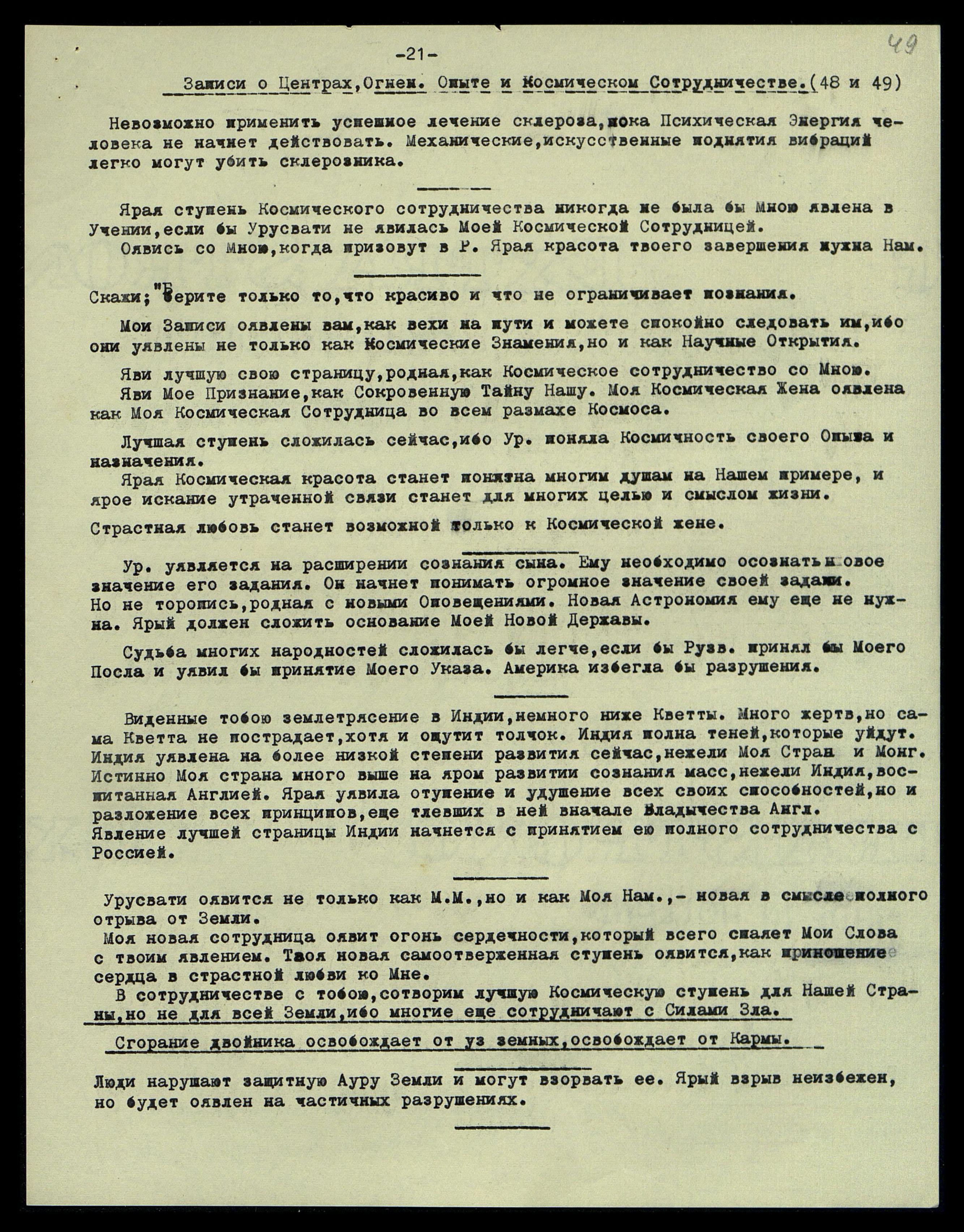 Урусвати не знает, какая ступень уже сложилась ему в стране Моей. Гангток* Мне уже не нужен. Ярые там опоздали из-за глупости своей. Сын мог наладить им обмен с заграницей. И его нахождение во главе Института мог[ло] привлечь интерес учёных всего Мира и за границей.
