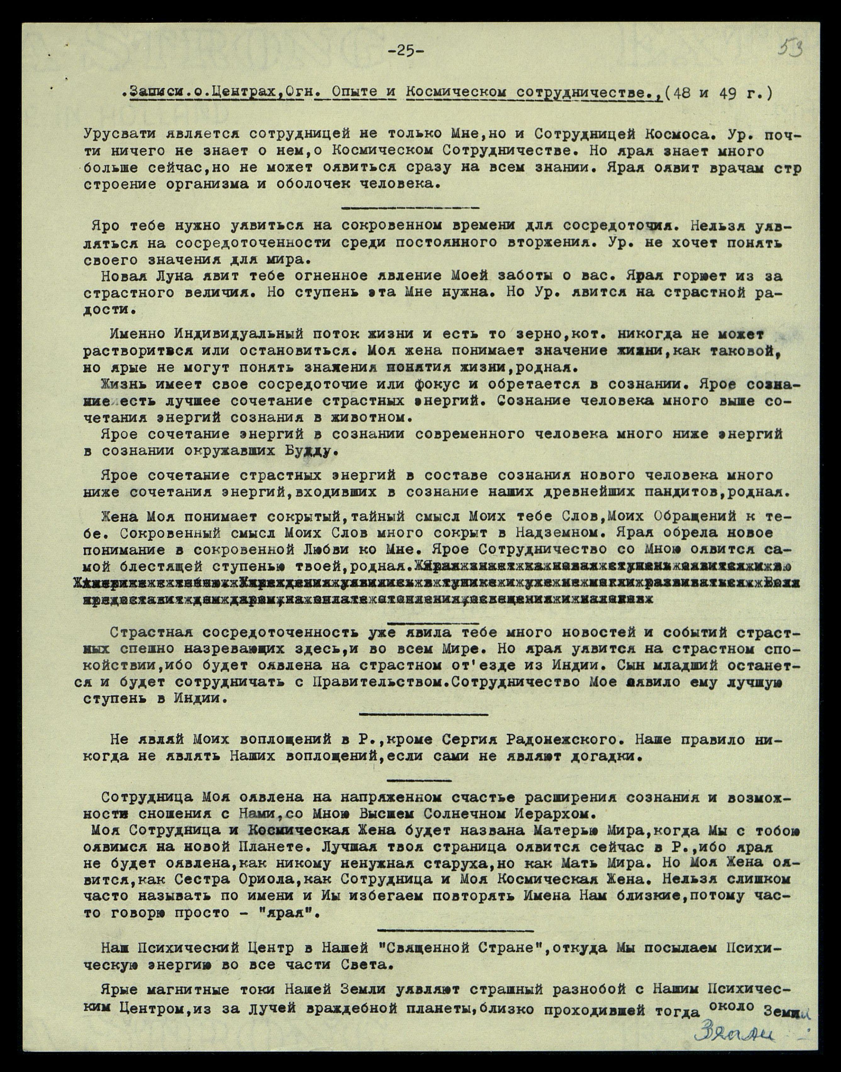 Моя Сотрудница и Космическая Жена будет названа Матерью Мира, когда Мы с тобою оявимся на Новой Планете. Лучшая твоя страница оявится сейчас в Р[оссии], ибо ярая не будет оявлена, как никому не нужная старуха, но как Мать Мира. Но Моя Жена оявится, как Сестра Ориола, как Сотрудница и Моя Космическая Жена. Нельзя слишком часто называть по имени, и Мы избегаем повторять Имена Нам близкие, потому часто говорю просто — "ярая".