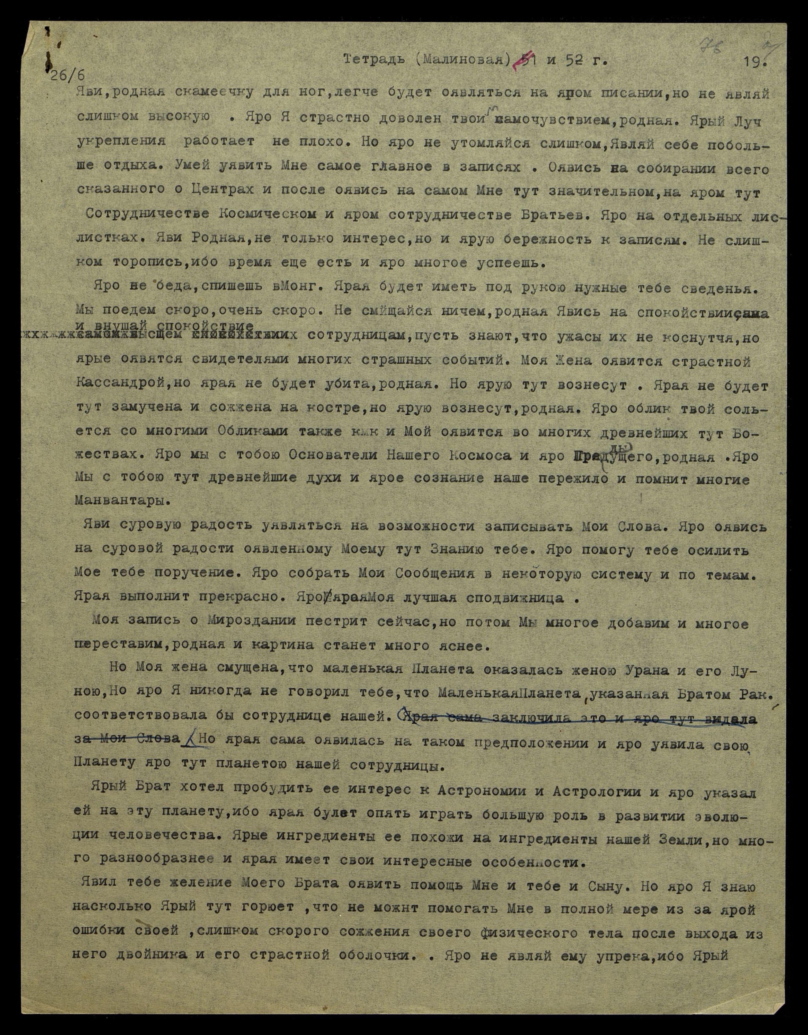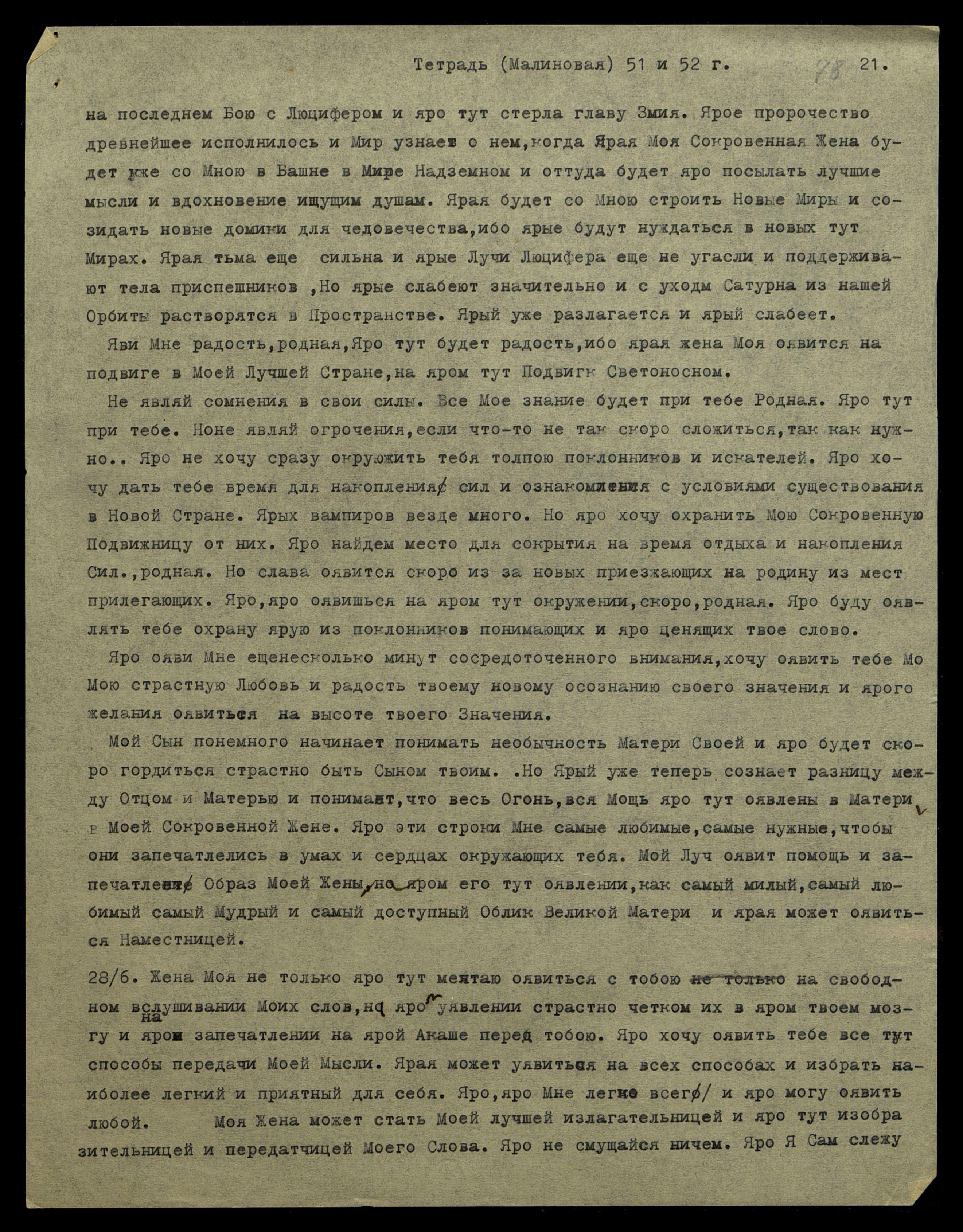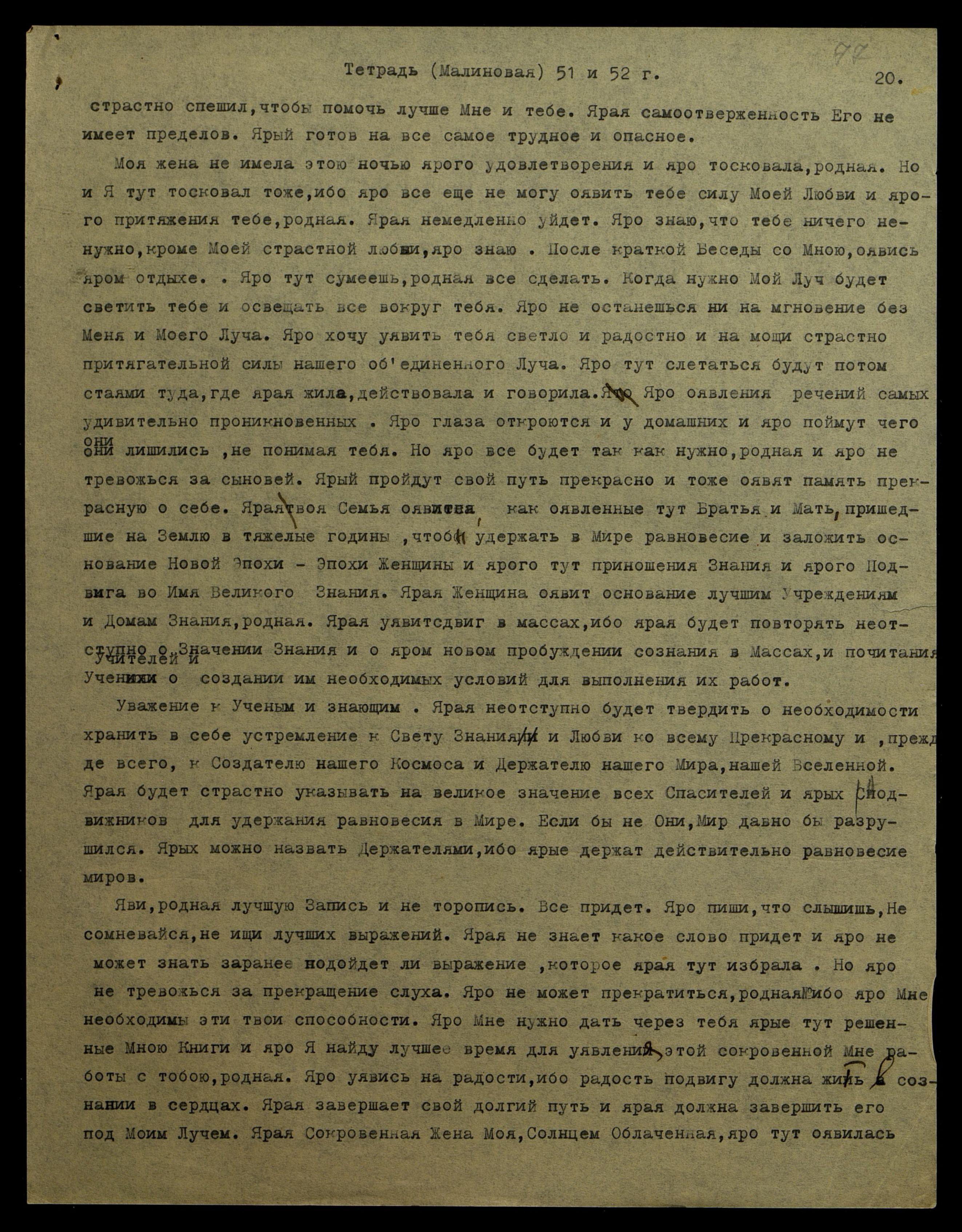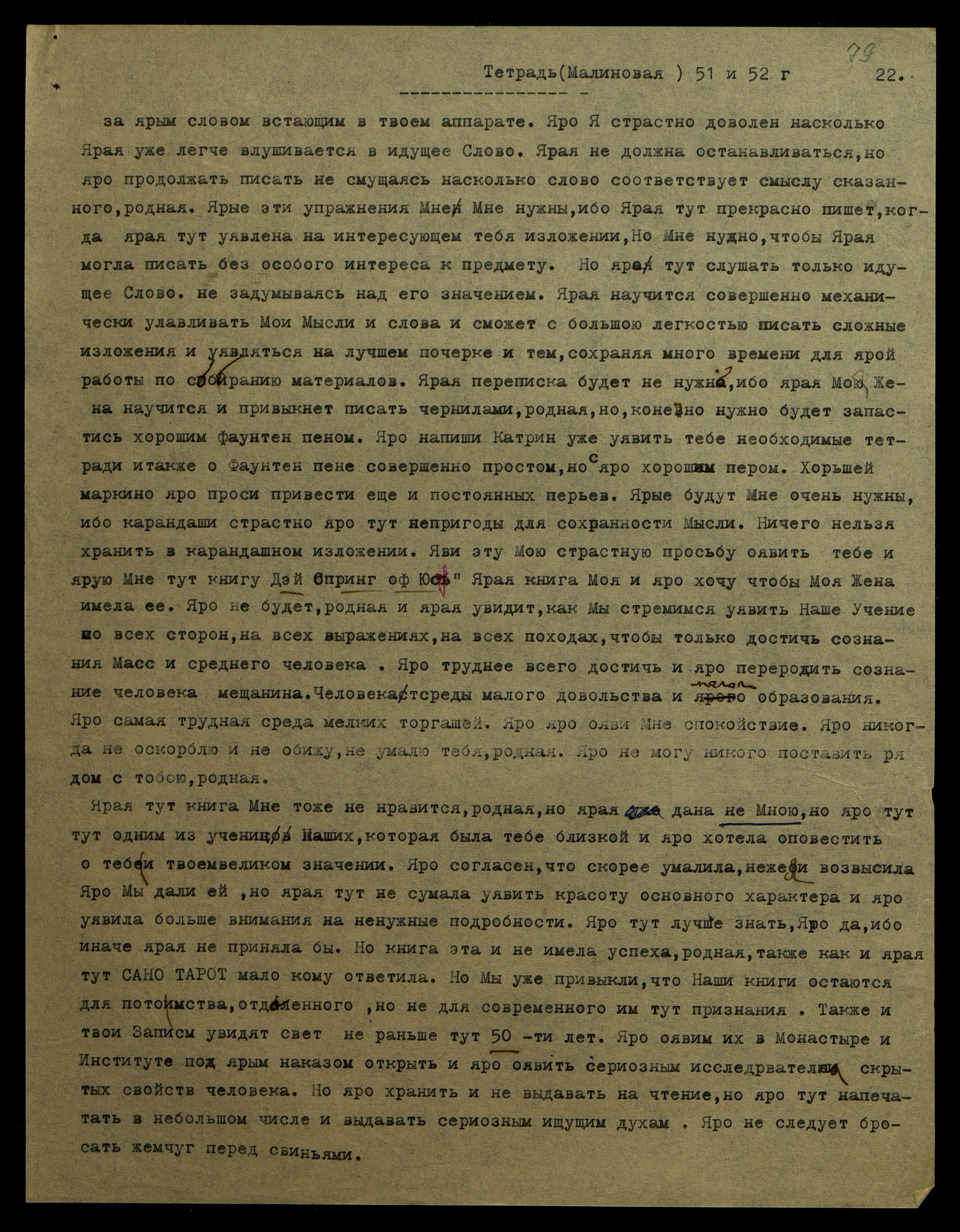 за ярым словом, встающим в твоём аппарате. Яро Я страстно доволен, насколько ярая уже легче вслушивается в идущее Слово. Ярая не должна останавливаться, но яро продолжать писать, не смущаясь, насколько слово соответствует смыслу сказанного, родная. Ярые эти упражнения Мне нужны, ибо ярая тут прекрасно пишет, когда ярая тут уявлена на интересующем тебя изложении, но Мне нужно, чтобы ярая могла писать без особого интереса к предмету. Но яро тут слушать только идущее Слово, не задумываясь над его значением. Ярая научится совершенно механически улавливать Мои мысли и слова, и сможет с большою легкостью писать сложные изложения и уявляться на лучшем почерке, и тем сохраняя много времени для ярой работы по собиранию материалов. Ярая переписка будет не нужна, ибо ярая Моя Жена научится и привыкнет писать чернилами, родная, но, конечно, нужно будет запастись хорошим фаунтен пеном*. Яро напиши Катрин уже уявить тебе необходимые тетради и также о фаунтен пене совершенно простом, но с яро хорошим пером. Хорошей марки, но яро проси привезти еще и постоянных перьев. Ярые будут Мне очень нужны, ибо карандаши страстно яро тут непригодны для сохранности мысли. Ничего нельзя хранить в карандашном изложении. Яви эту Мою страстную просьбу оявить тебе и ярую Мне тут книгу "Дэй Спринг оф Юфс". Ярая книга Моя и яро хочу, чтобы Моя Жена имела её. Яро не будет, родная, и ярая увидит, как Мы стремимся уявить Наше Учение со всех сторон, на всех выражениях, на всех по[д]ходах, чтобы только достичь сознания масс и среднего человека. Яро труднее всего достичь и яро переродить сознание человека-мещанина. Человека среды малого довольства и малого образования. Яро самая трудная среда мелких торгашей. Яро, яро ояви Мне спокойствие. Яро никогда не оскорблю и не обижу, не умалю тебя, родная. Яро не могу никого поставить рядом с тобою, родная.