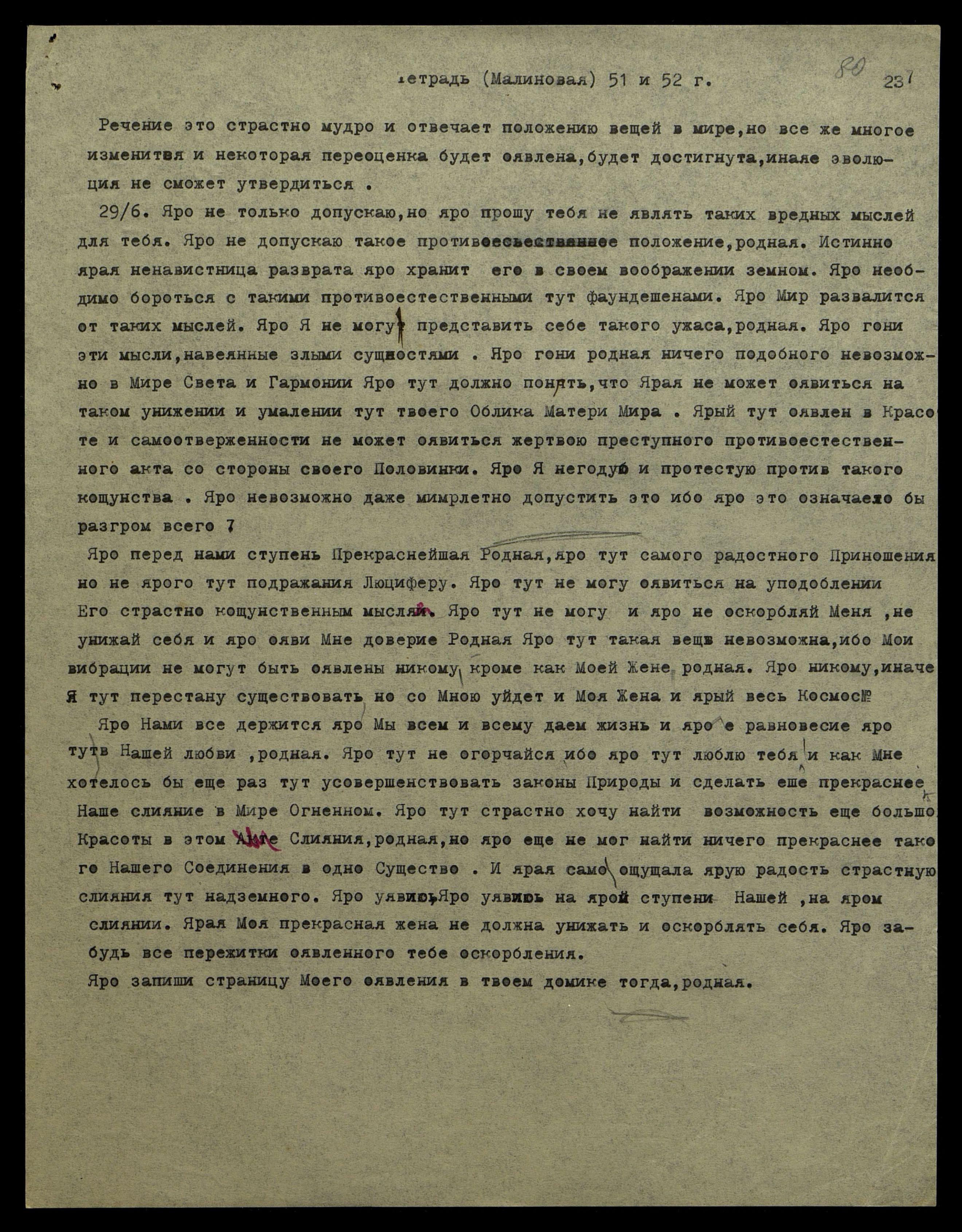 29/6. Яро не только допускаю, но яро прошу тебя не являть таких вредных мыслей для тебя. Яро не допускаю такое противоестественное положение, родная. Истинно, ярая ненавистница разврата яро хранит его в своём воображении земном. Яро необходимо бороться с такими противоестественными тут фаундешенами*. Яро Мир развалится от таких мыслей. Яро Я не могу представить себе такого ужаса, родная. Яро гони эти мысли, навеянные злыми сущностями. Яро гони, родная, ничего подобного невозможно в Мире Света и Гармонии. Яро тут должно понять, что ярая не может оявиться на таком унижении и умалении тут твоего Облика Матери Мира. Ярый тут оявлен в Красоте и самоотверженности, не может оявиться жертвою преступного противоестественного акта со стороны своей Половинки. Яро Я негодую и протестую против такого кощунства. Яро невозможно даже мимолётно допустить это, ибо яро это означало бы разгром всего.