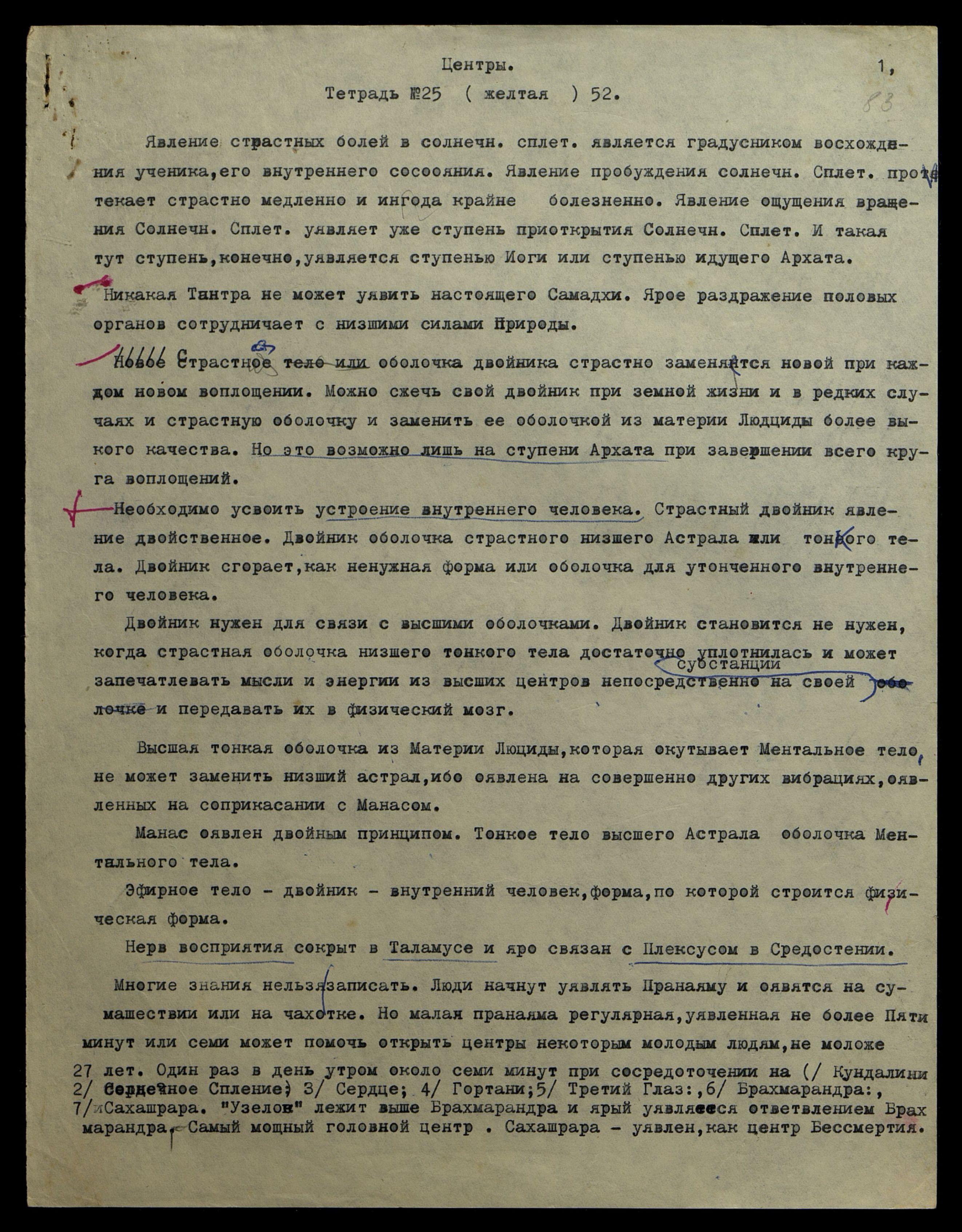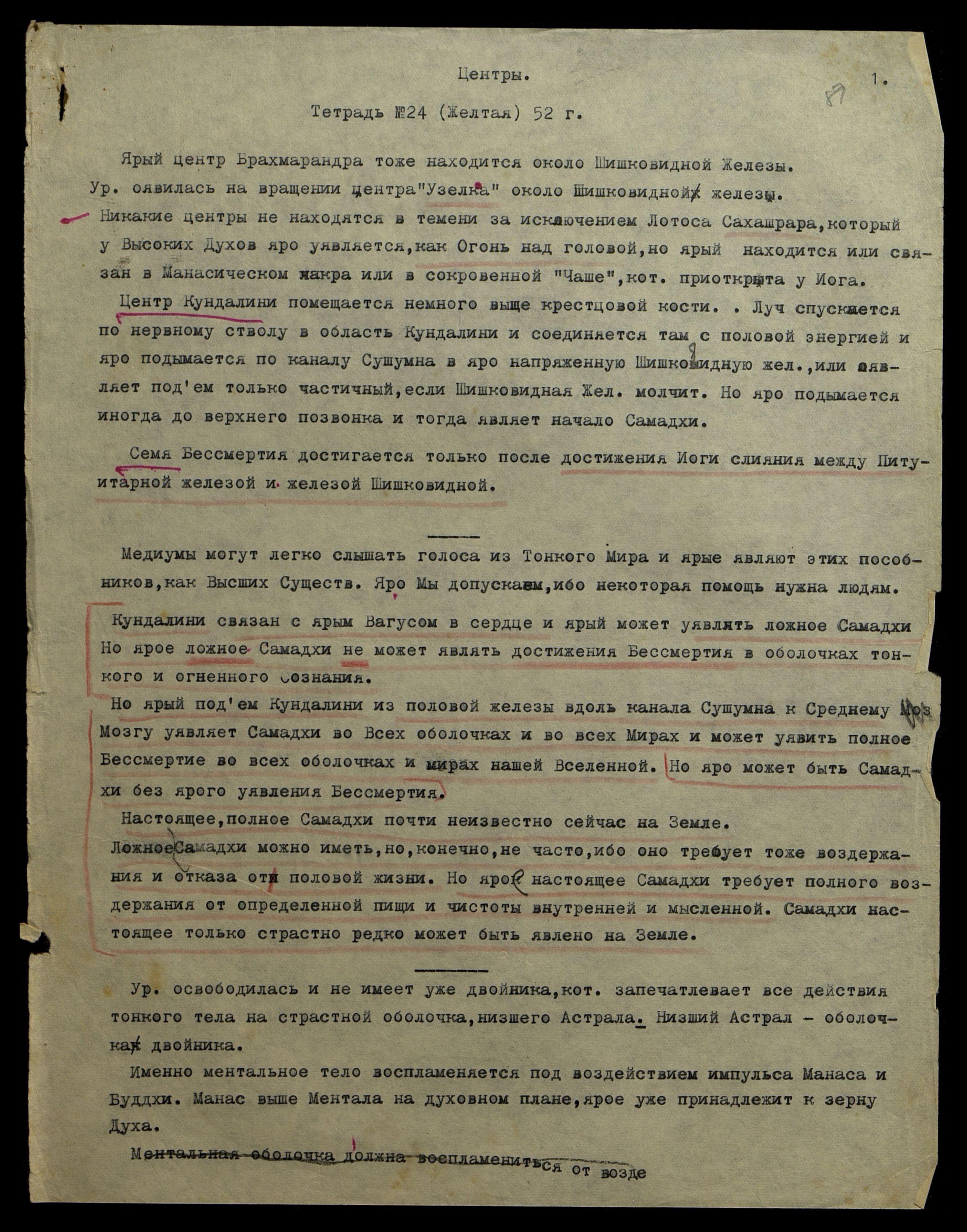 Центр Кундалини помещается немного выше крестцовой кости. Луч спускается по нервному стволу в область Кундалини и соединяется там с половой энергией и яро подымается по каналу Сушумна в яро напряженную Шишковидную жел[езу], или оявляет подъём только частичный, если Шишковидная жел[еза] молчит. Но яро подымается иногда до верхнего позвонка и тогда являет начало Самадхи.