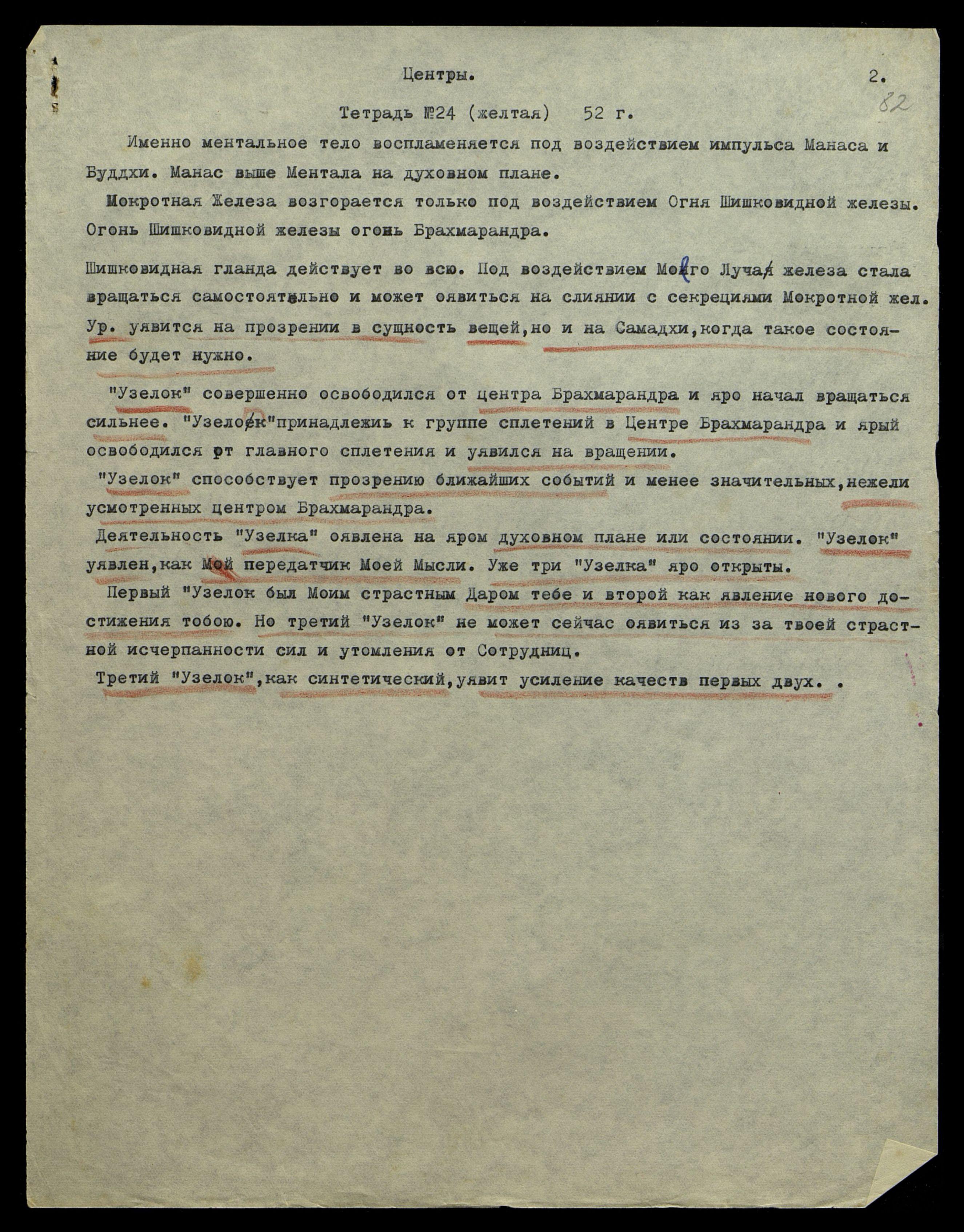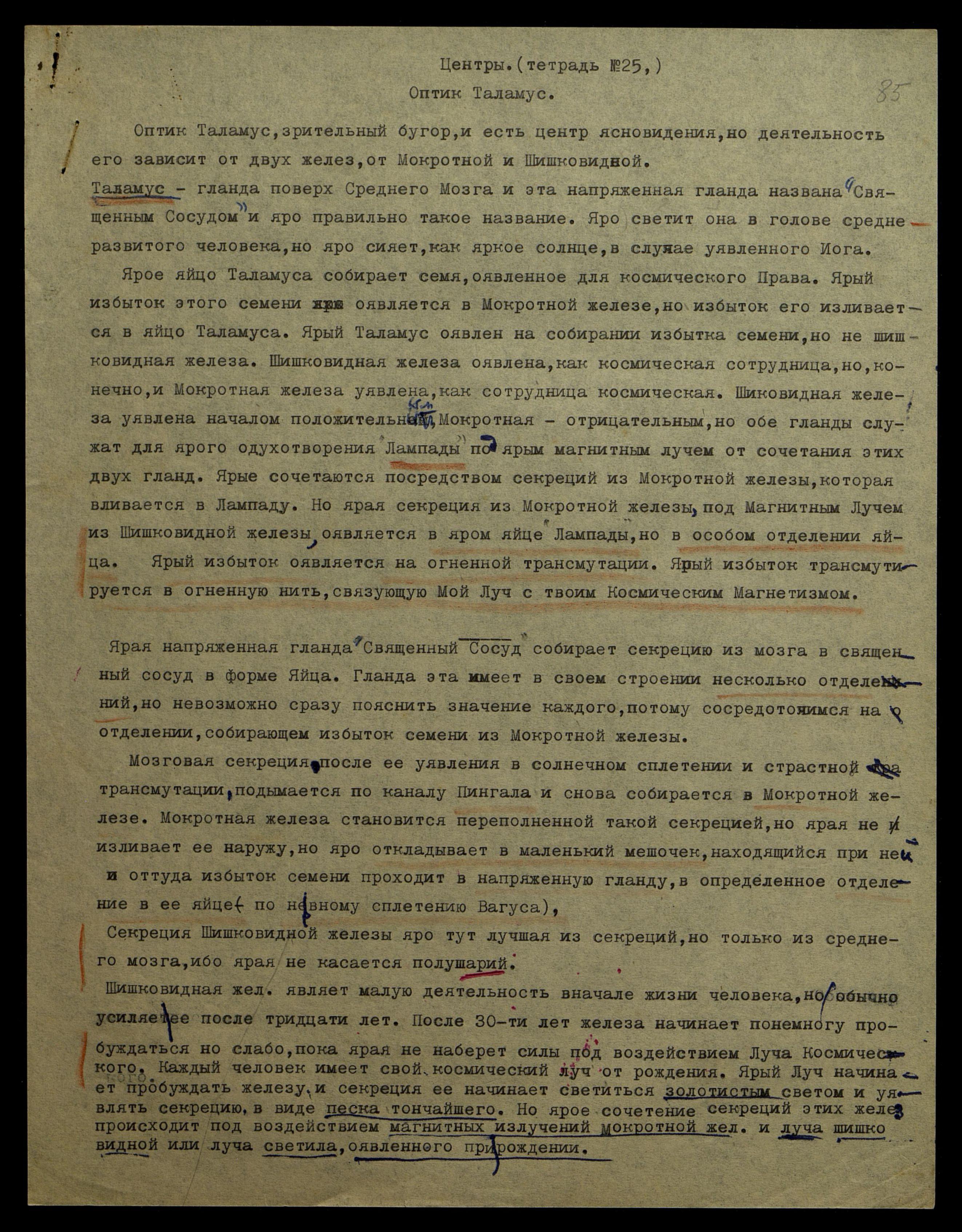 Шишковидная жел[еза] являет малую деятельность вначале жизни человека, но обычно усиляет её после тридцати лет. После 30-ти лет железа начинает понемногу пробуждаться, но слабо, пока ярая не наберёт силы под воздействием Луча Космического. Каждый человек имеет свой космический луч от рождения. Ярый Луч начинает пробуждать железу, и секреция её начинает светиться золотистым цветом и уявлять секрецию в виде песка тончайшего. Но ярое сочетание секреций этих желёз происходит под воздействием магнитных излучений Мокротной жел[езы] и луча Шишковидной или луча светила, оявленного при рождении.