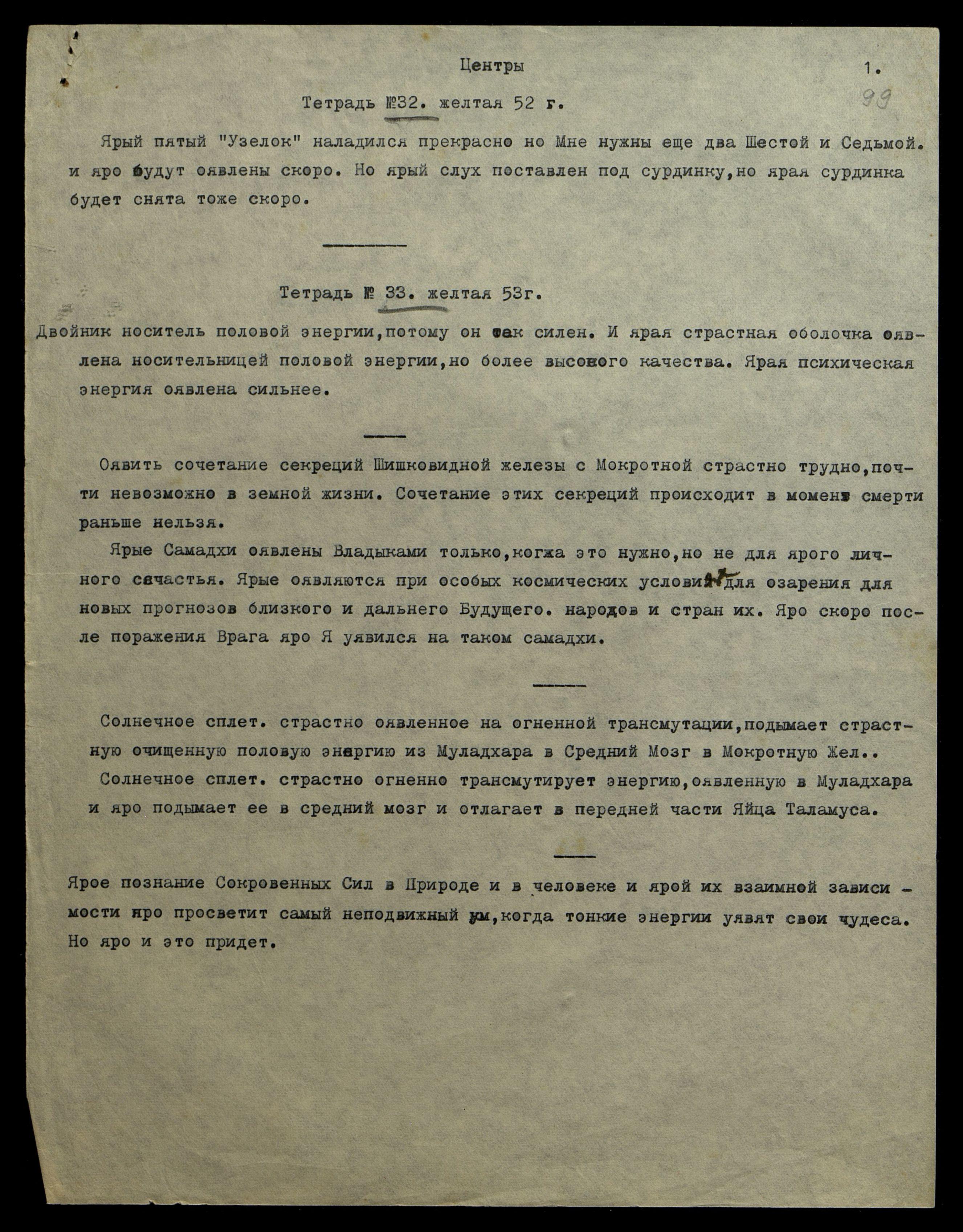 Сознание зарождается в сердце и постепенно уявляется в мозговых посредниках. Ярое идёт по Вагусу − центру восприятия и яро по всей нервной системе. Сначала по нервам самым простым, не сложным, как нерв питания и яро половой, и только после напряжения в Солнечном Сплет[ении] ярое сознание начинает мыслить понемногу. Но только после страстного напряжения в Солнечном Сплетении. Напряжение в Солнечном Сплетении сказывается как боль в желудке. И только после напряжения в Солнечном Сплетении начинают напрягаться и ярый центр Кундалини, и ярая Мокротная железа. Ярая Мокротная железа начинает сотрудничать с Психической энергией, сначала с низшей в половой железе.