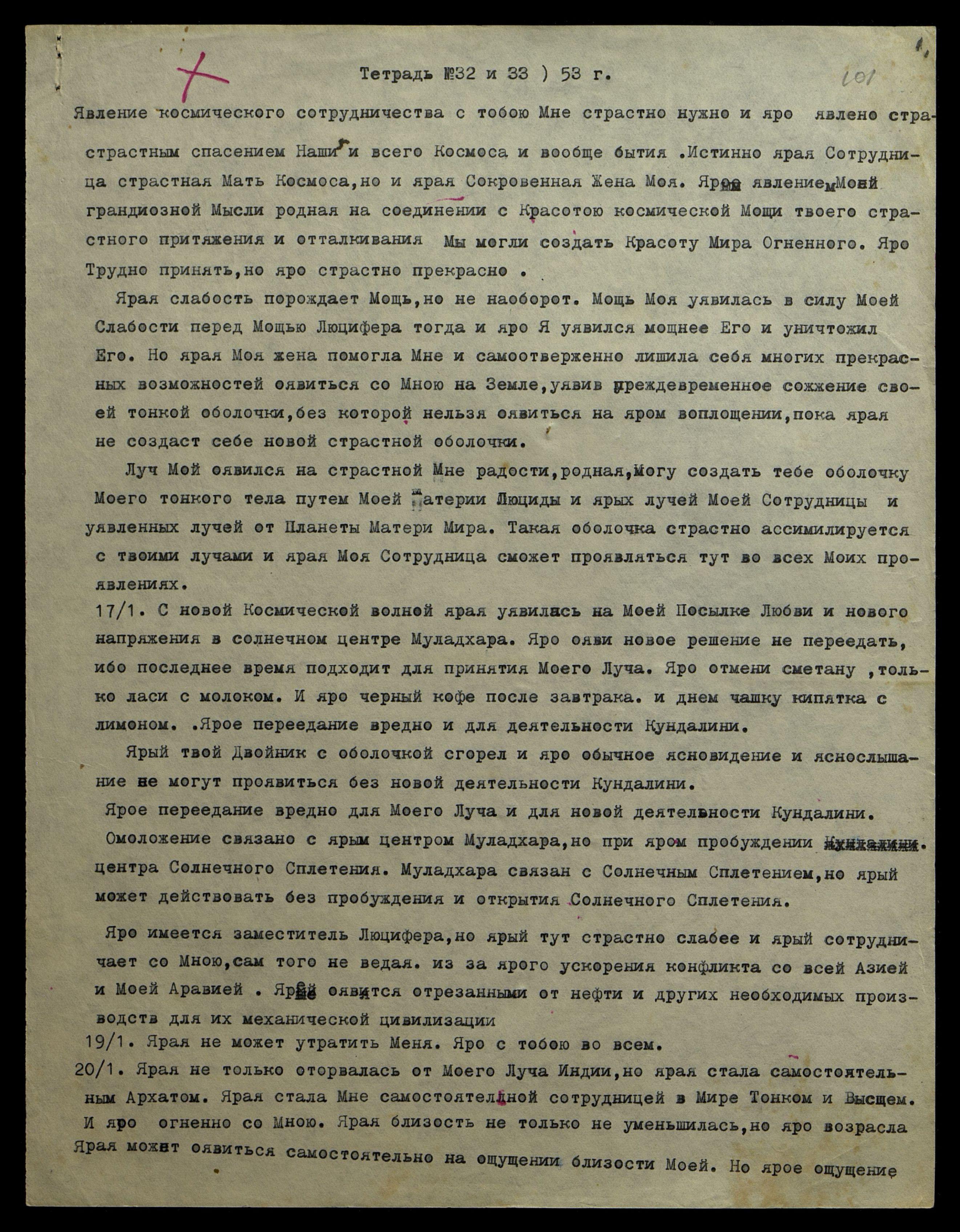 Мы предвидели опаление при таком опыте, но не ярого сожжения до ярой битвы с Врагом. Но ярая лишила себя многих страстных возможностей. Но Мне ярая оявила определённое спасение, оявив Мне возможность без всякой опасности для Меня, оявиться на встрече с Врагом и на страстном уявлении Ему отпора Моим Лучом, объединённым с твоим, оявленным на яром уявлении Луча Косм[ического] М[ужа] на Его праве с тобою, яро оявленном на слиянии с тобою в мирах Тонких и Огненном.